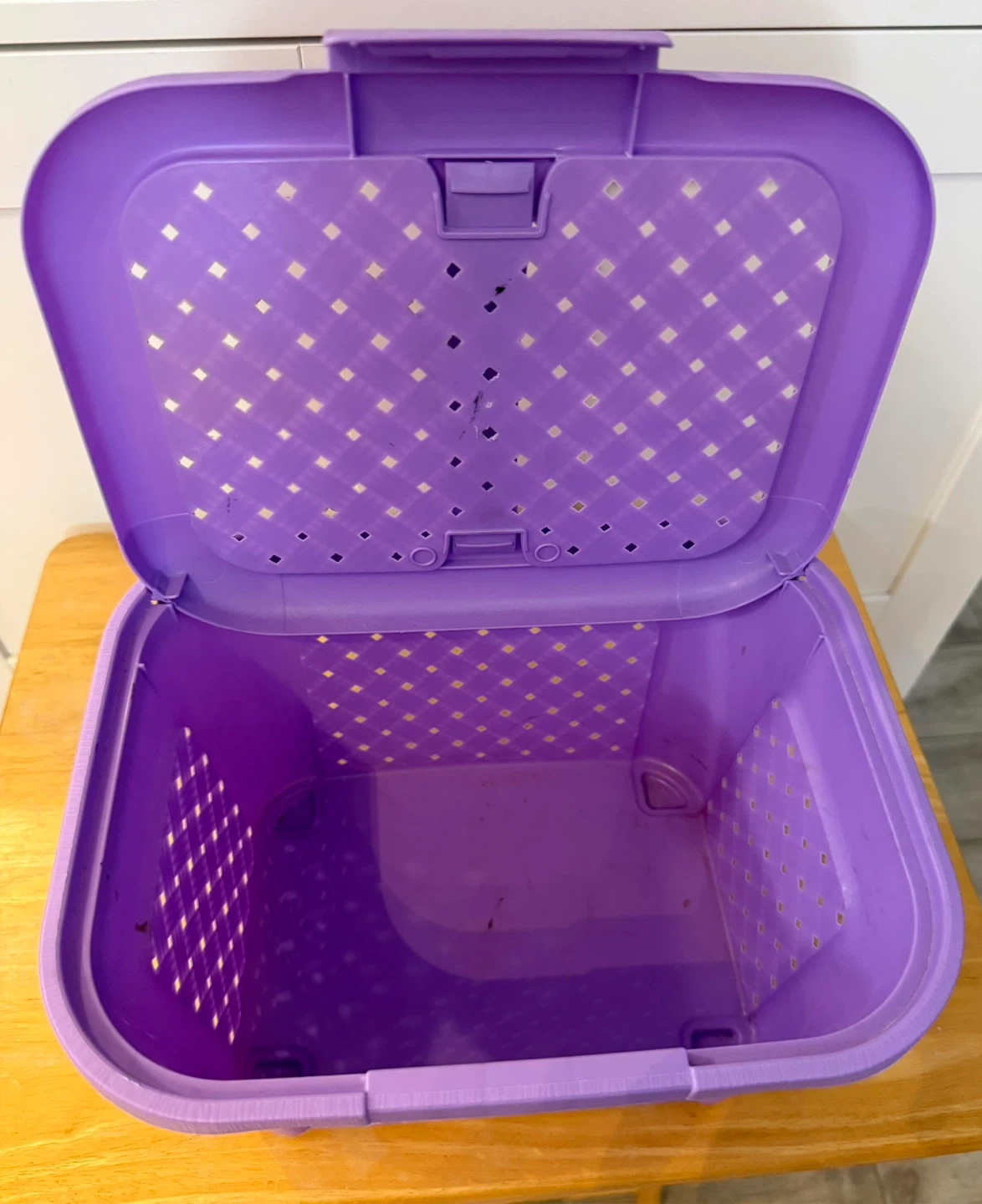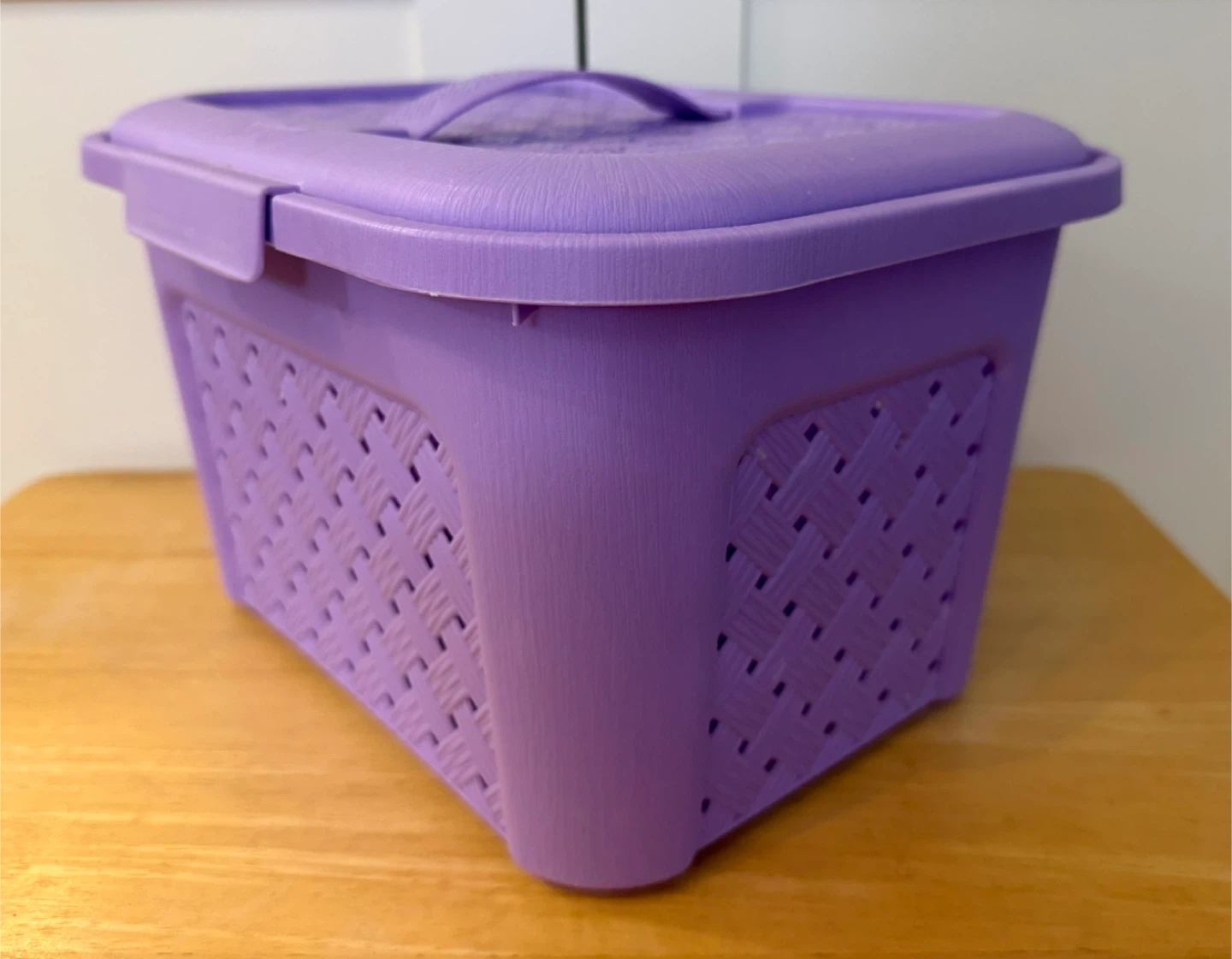 A handy purple plastic storage basket with a lid. It's perfect for keeping small items tidy in any room. The woven texture adds a nice touch!