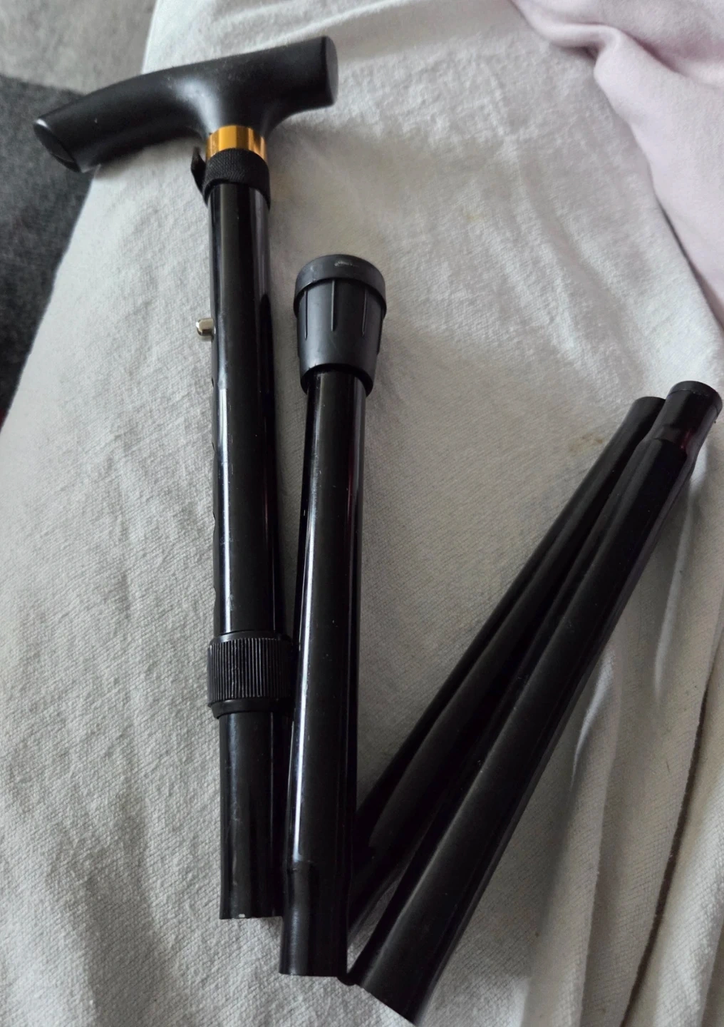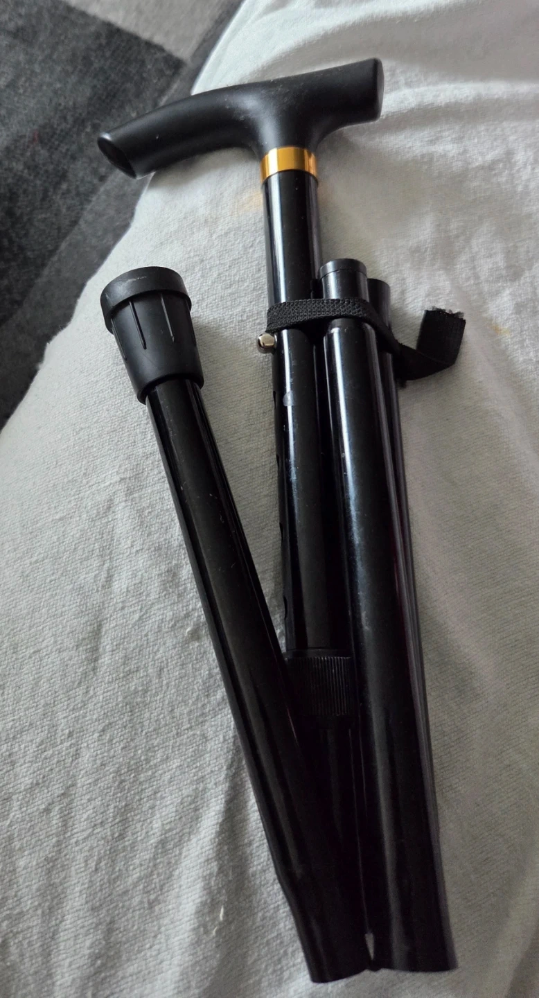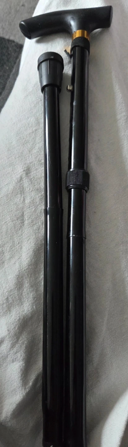 #🤎Free This is a black walking cane. It's adjustable in height with a comfortable T-handle grip. The shaft is made of metal for durability.it has 5 adjustable levels to it.