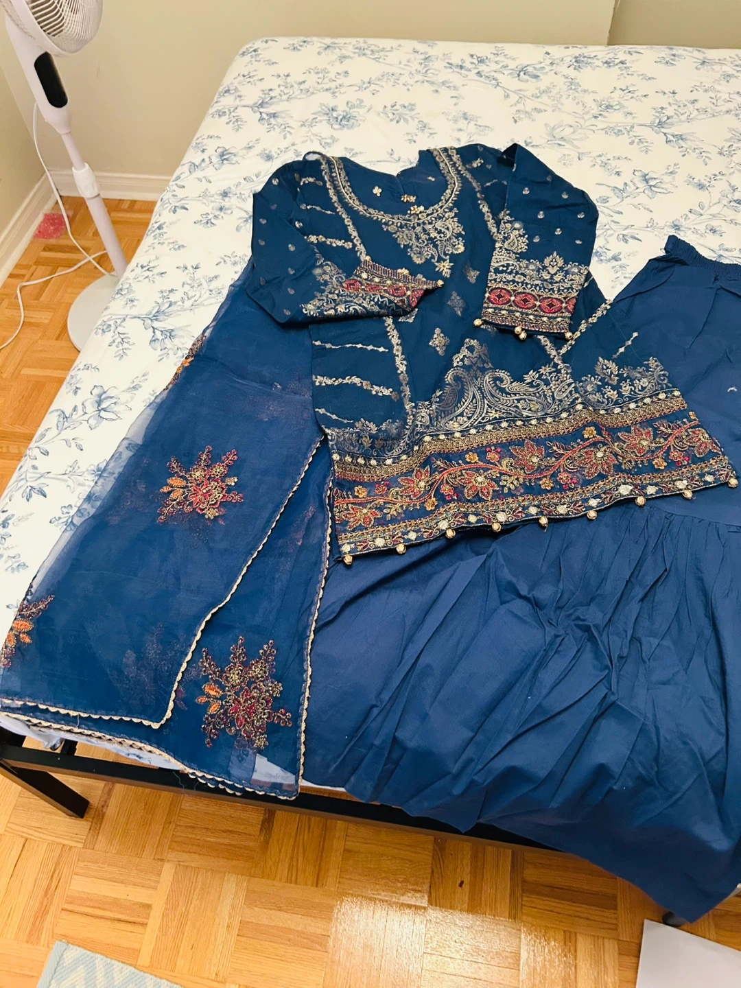 Beautiful dark blue Indian or Pakistani style three-piece suit. It features intricate gold and red embroidery all over the kameez, with bead and pearl detailing on the sleeves and hem. Comes with a matching dupatta and shalwar. Perfect for formal events or celebrations!