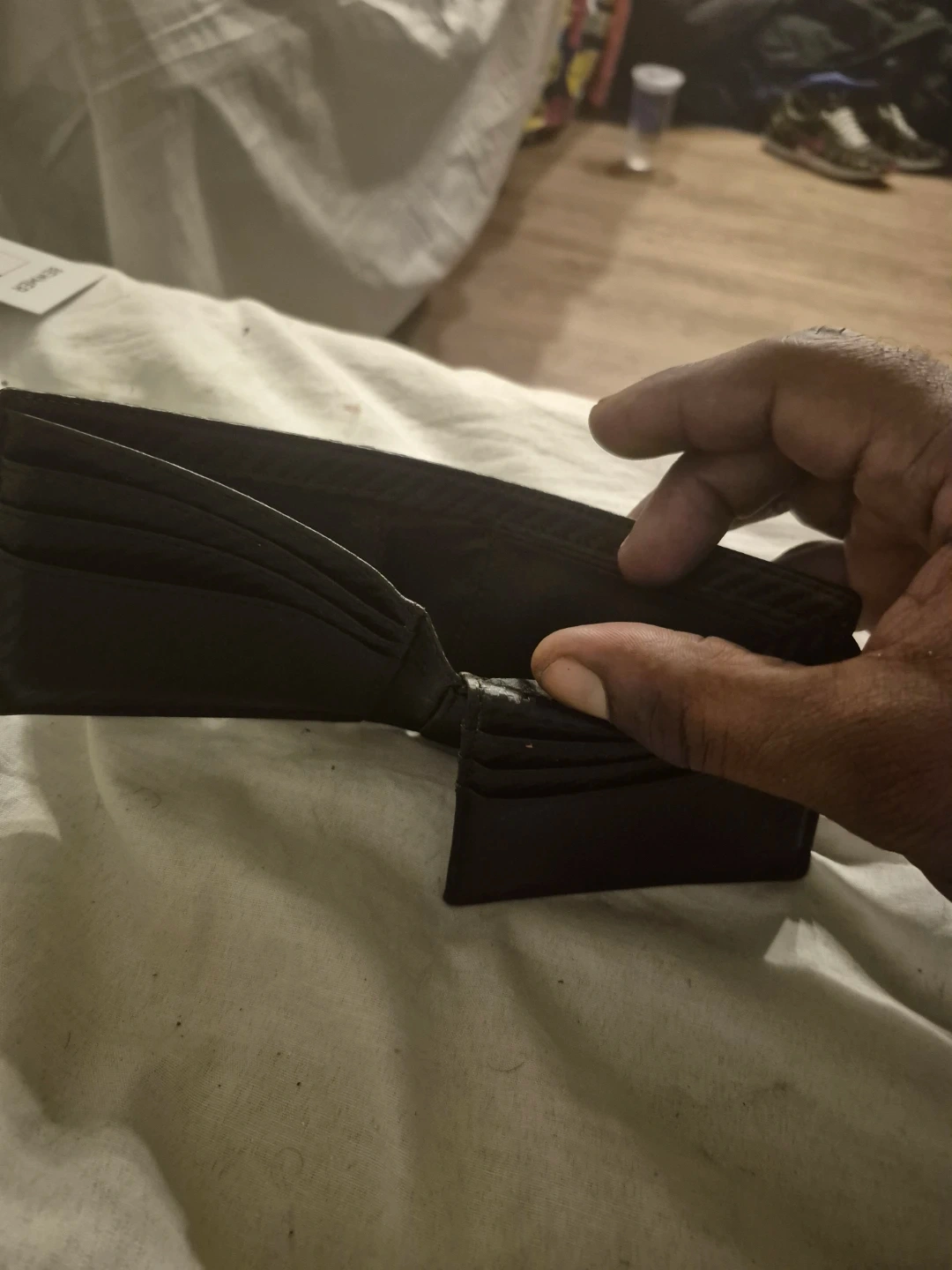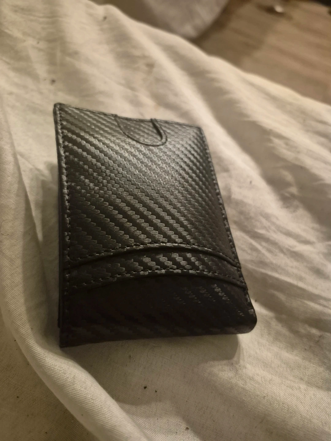 Selling a black carbon fiber wallet. It's in good condition and ready for a new owner! It has a sleek design and is perfect for everyday use