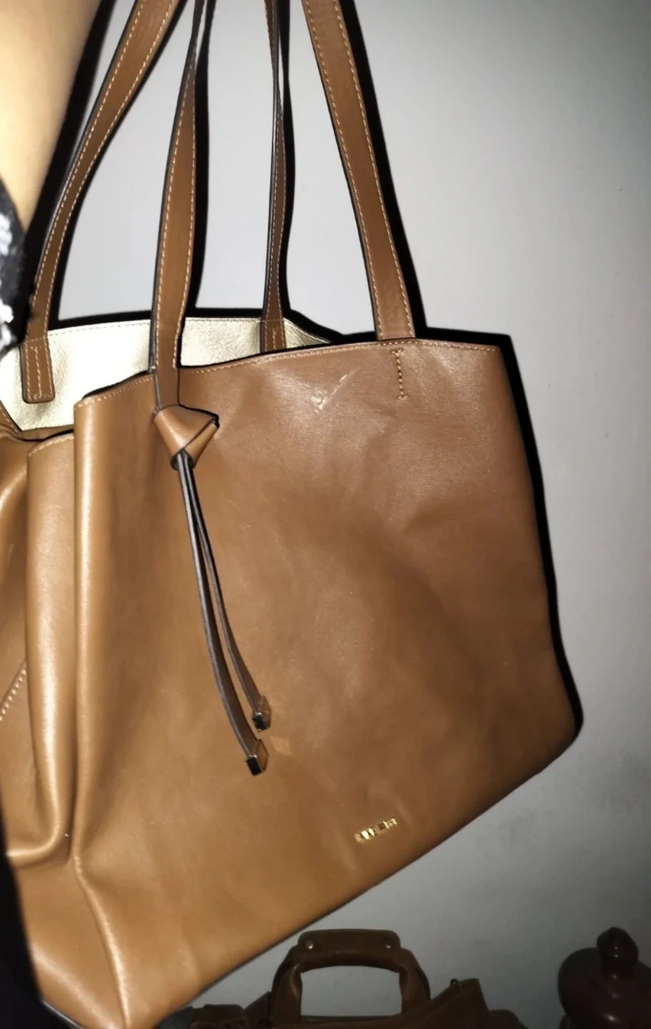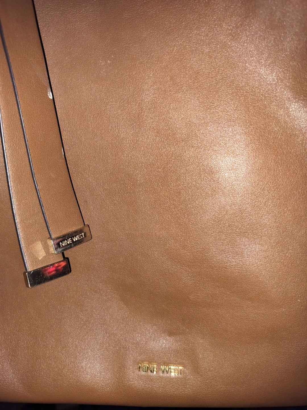 This is a brown leather tote bag from Nine West. It features a classic design with top handles and a tie detail. Great for a mommy or someone who likes to carry big things