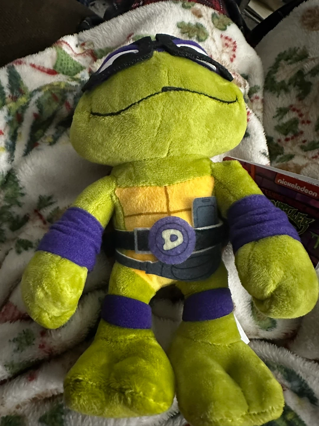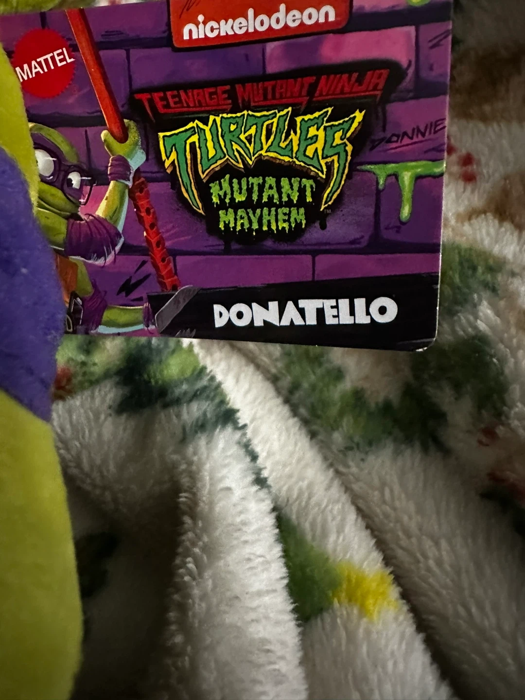 20I'm selling a Nickelodeon Teenage Mutant Ninja Turtles Donatello plush! It's in great condition and ready for a new home. This plush is from the Mutant Mayhem series and features Donatello with his signature purple mask and bo staff.