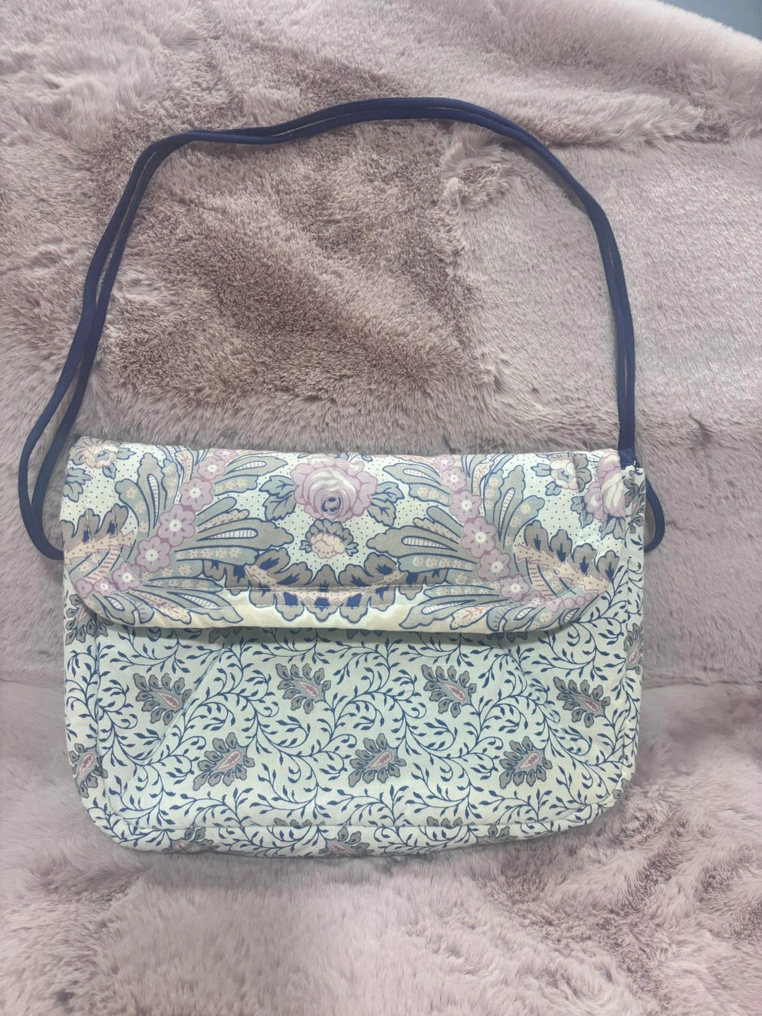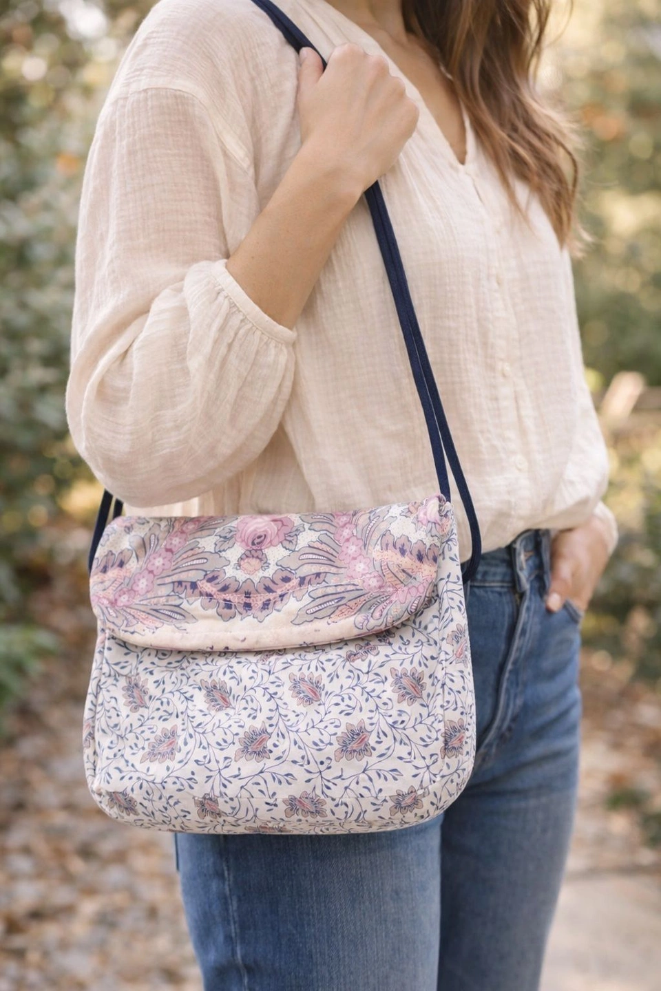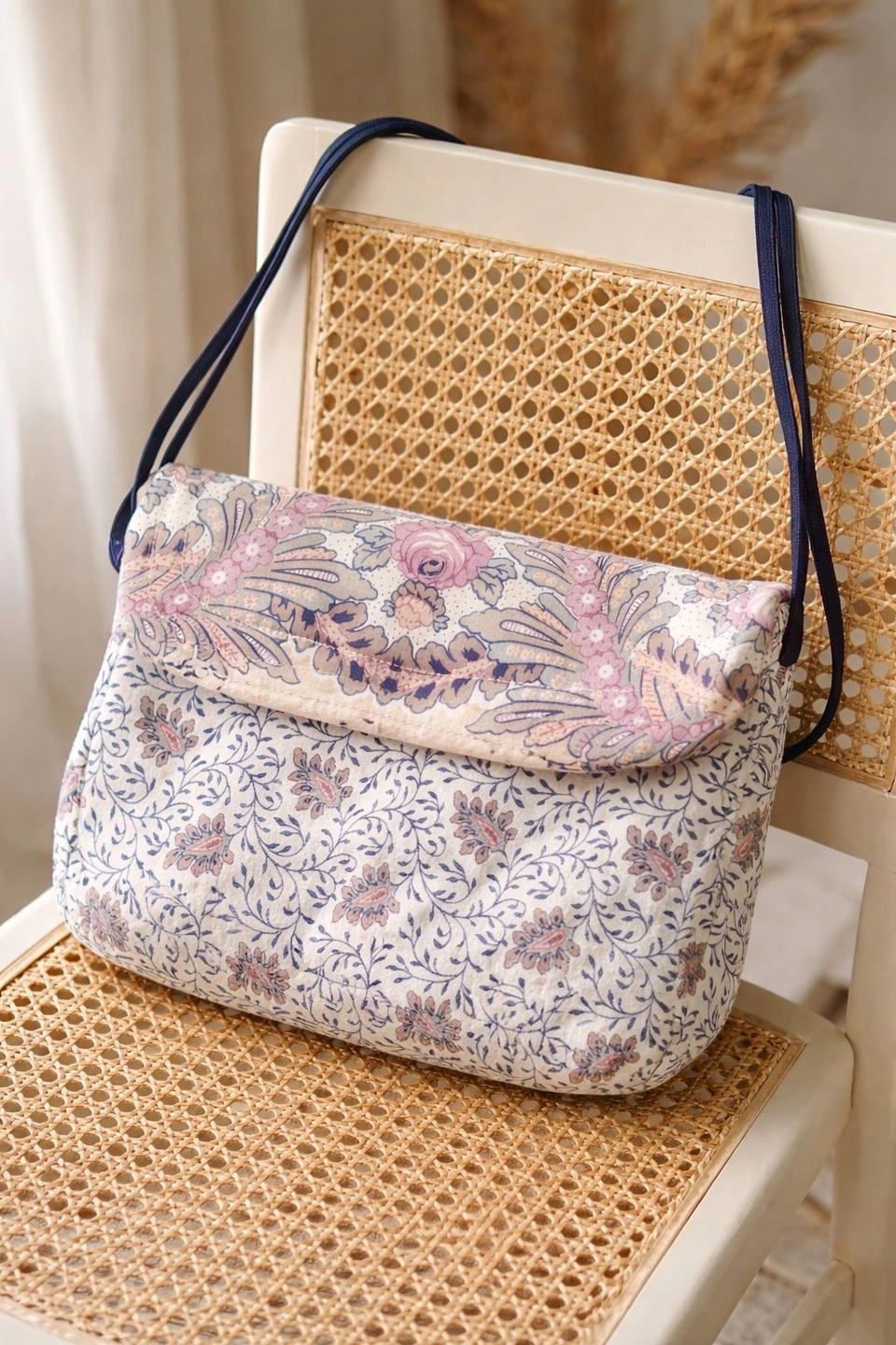 Beautiful quilted fabric shoulder bag from The Red Mill Collection by Karol Lynne. Features a soft padded structure, romantic floral print, and flap-style opening. Lightweight yet roomy enough for everyday essentials.