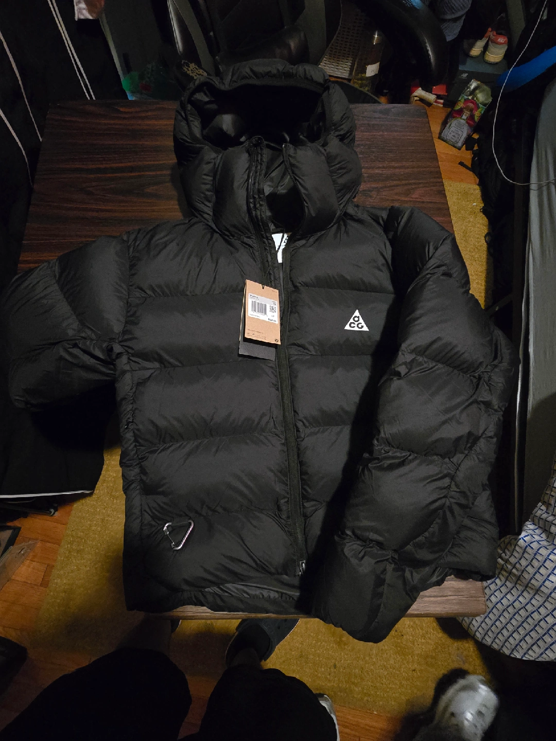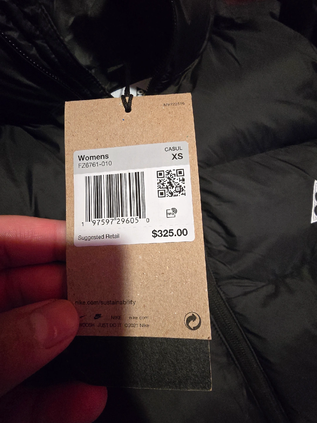 10Selling a Nike ACG women's down puffer jacket in size XS. It's a stylish and warm jacket, perfect for cold weather. The tag shows a suggested retail price of $325. It's in great condition and ready for a new owner!