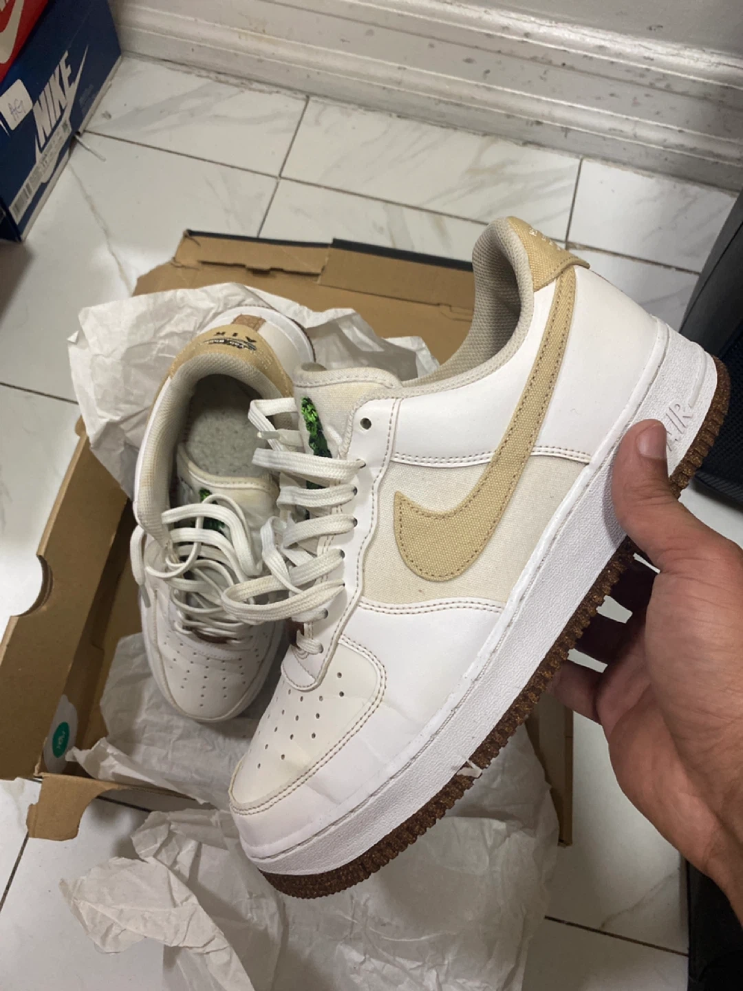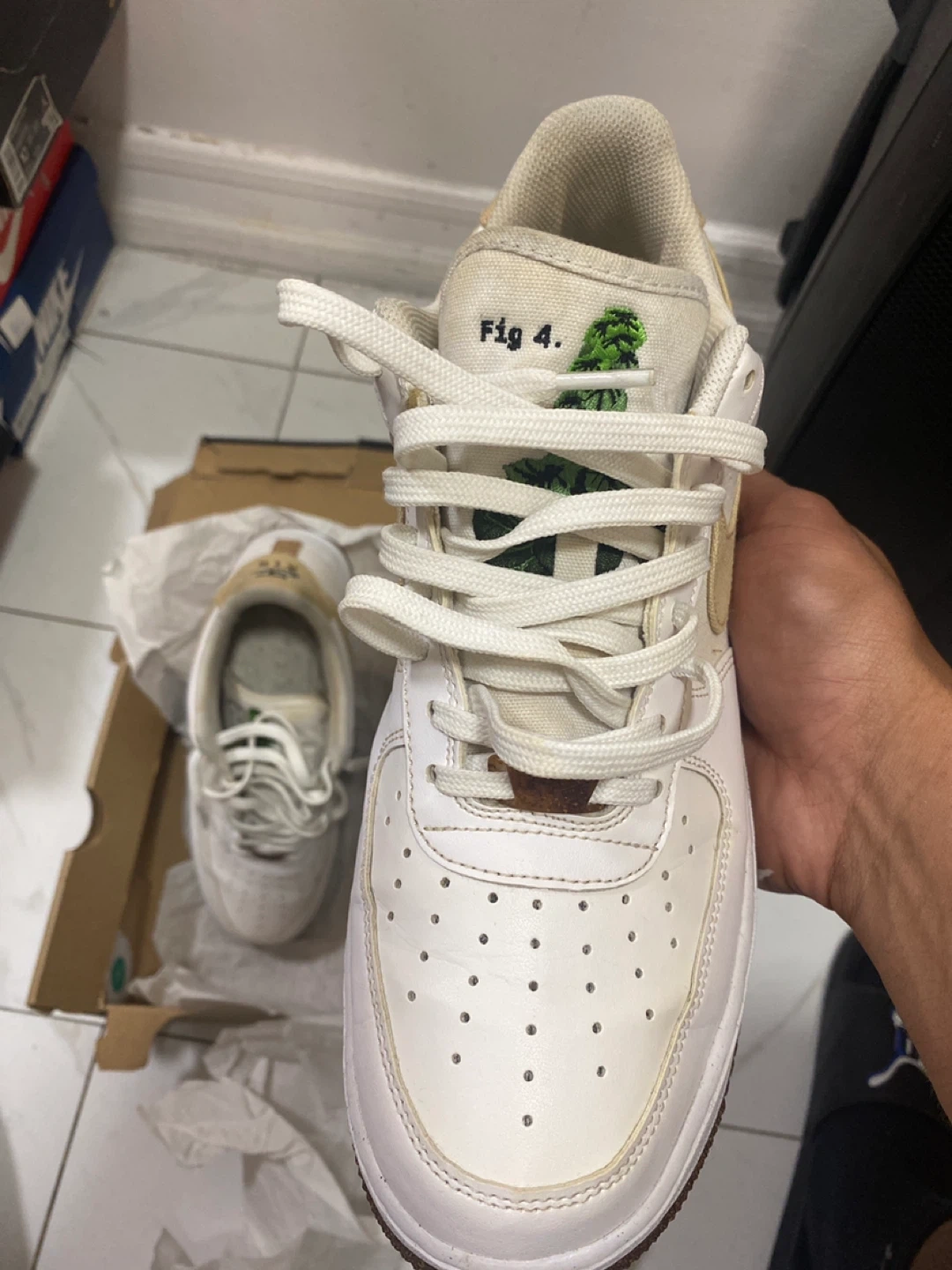 Selling a pair of Nike Air Force 1 Low Fig 4 sneakers. They come with the original box. The shoes are white with a tan swoosh and a brown sole. They have a unique design on the tongue.
