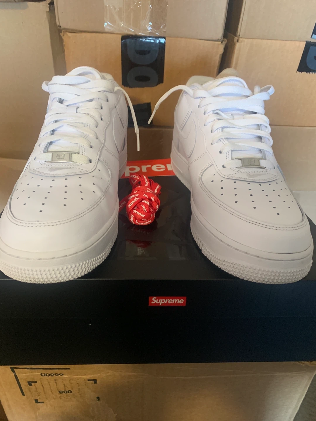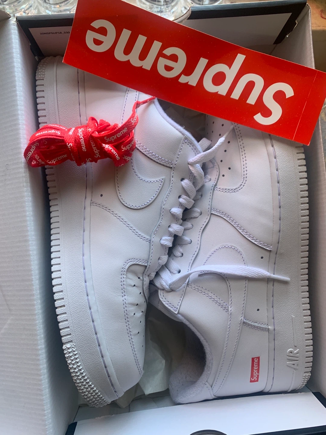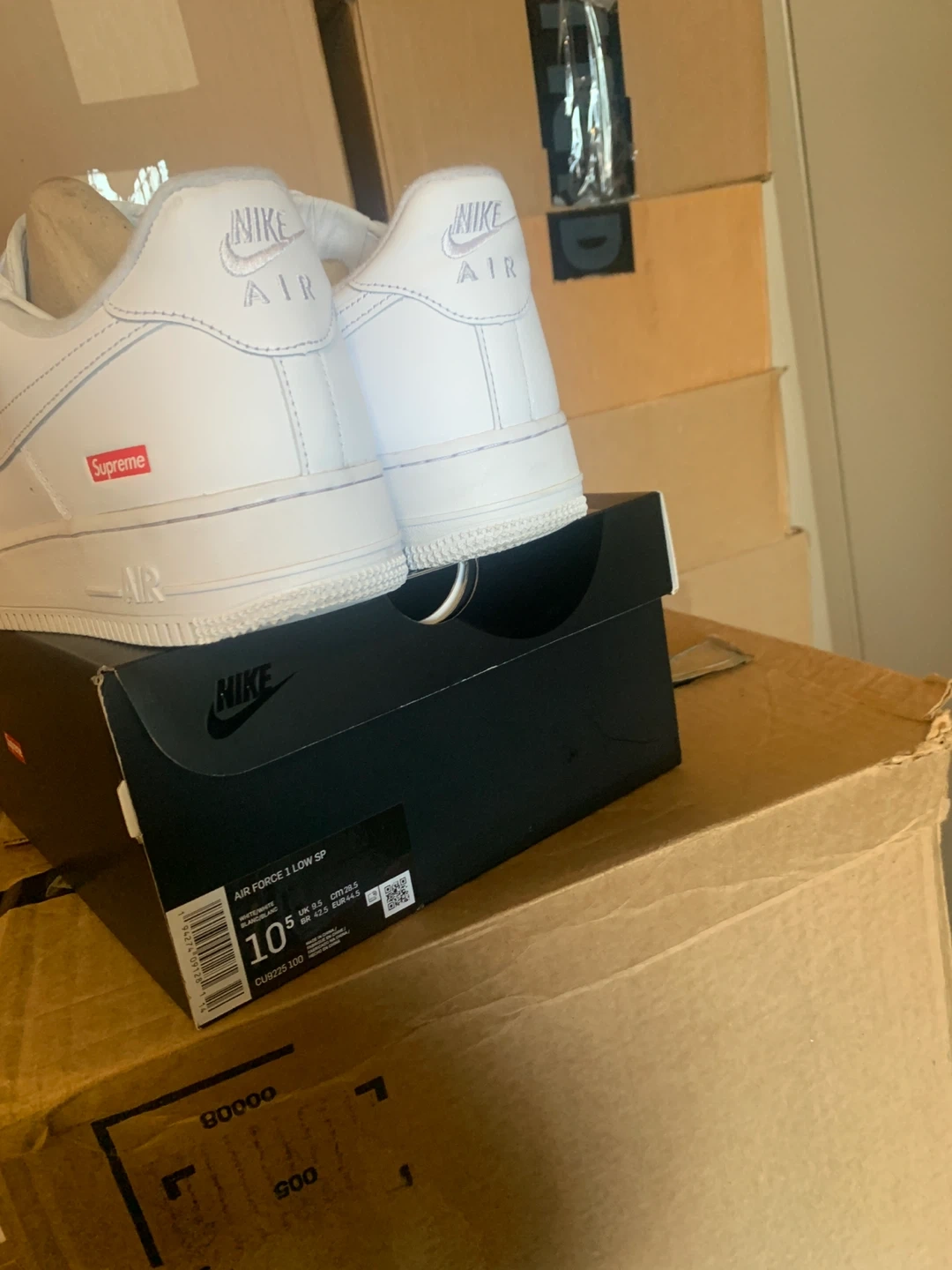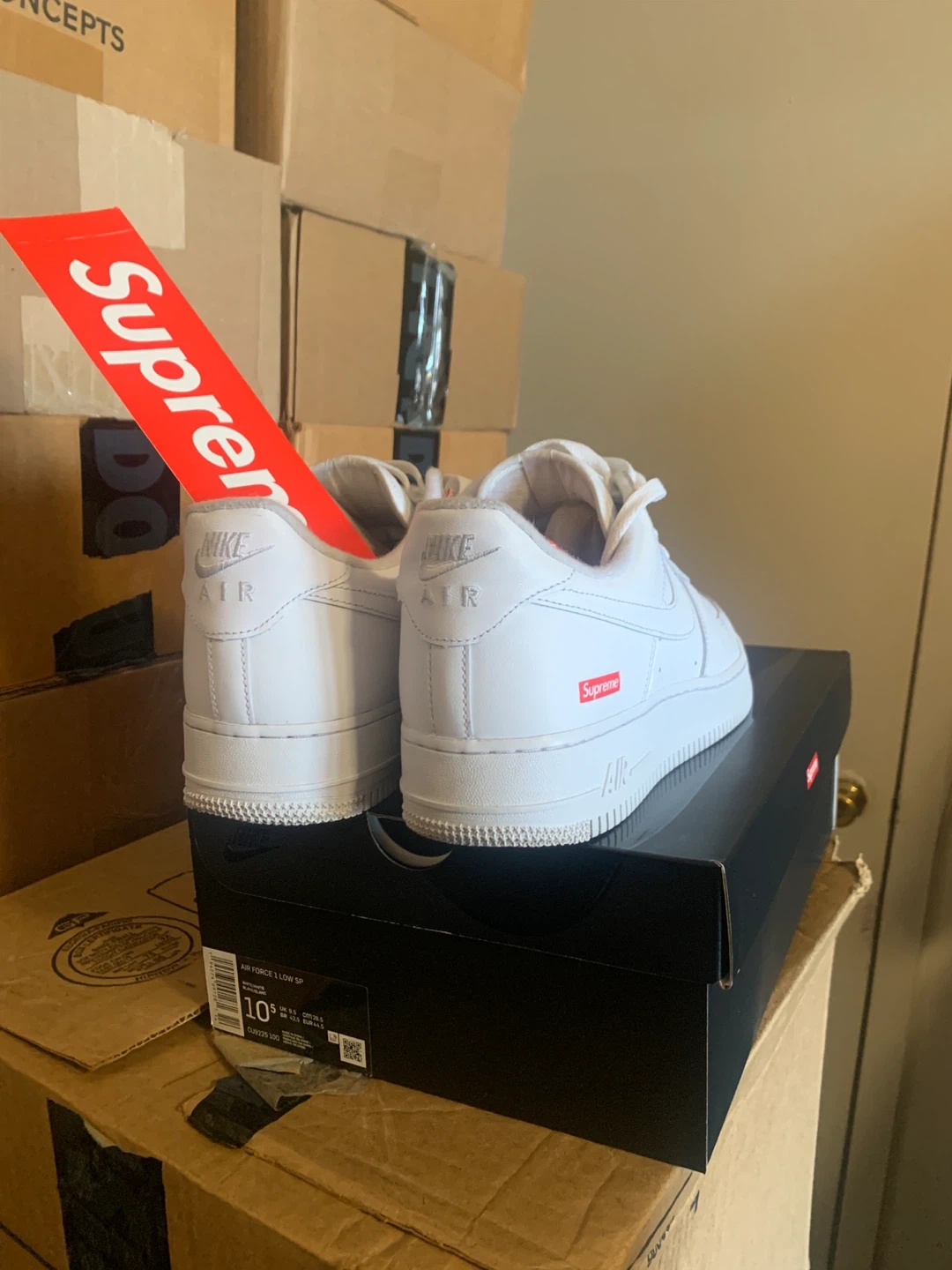 Selling a pair of Nike Air Force 1 Low SP Supreme in white, size 10.5 US men's. These come with the original box. They show some signs of wear on the soles, but are otherwise in good condition!