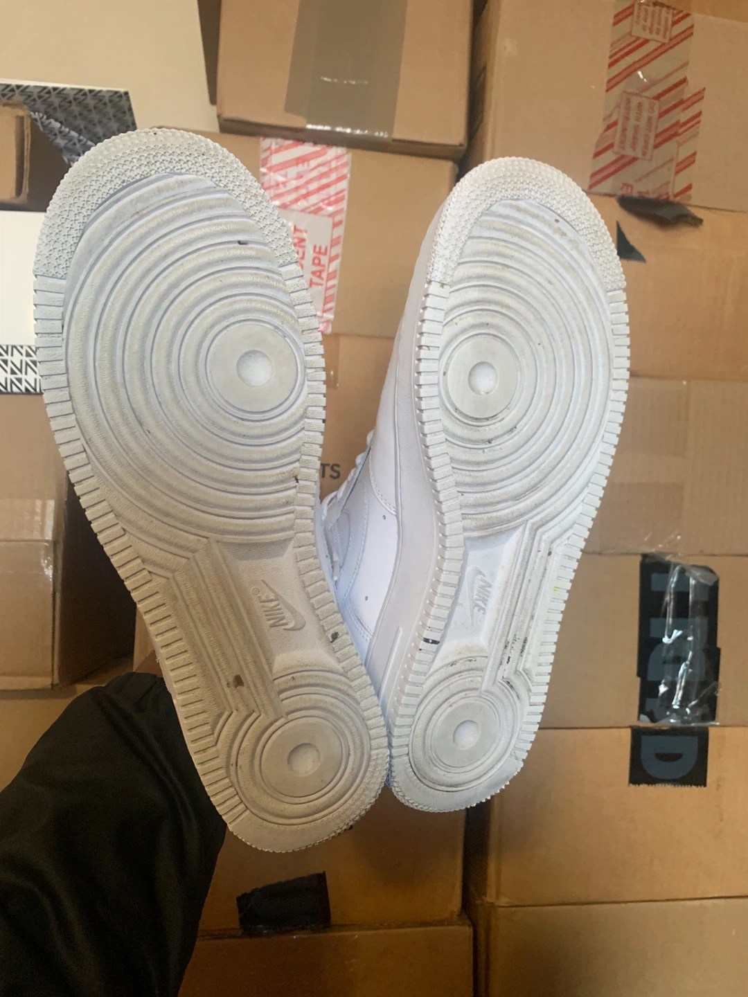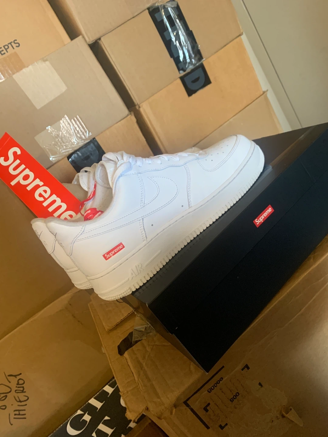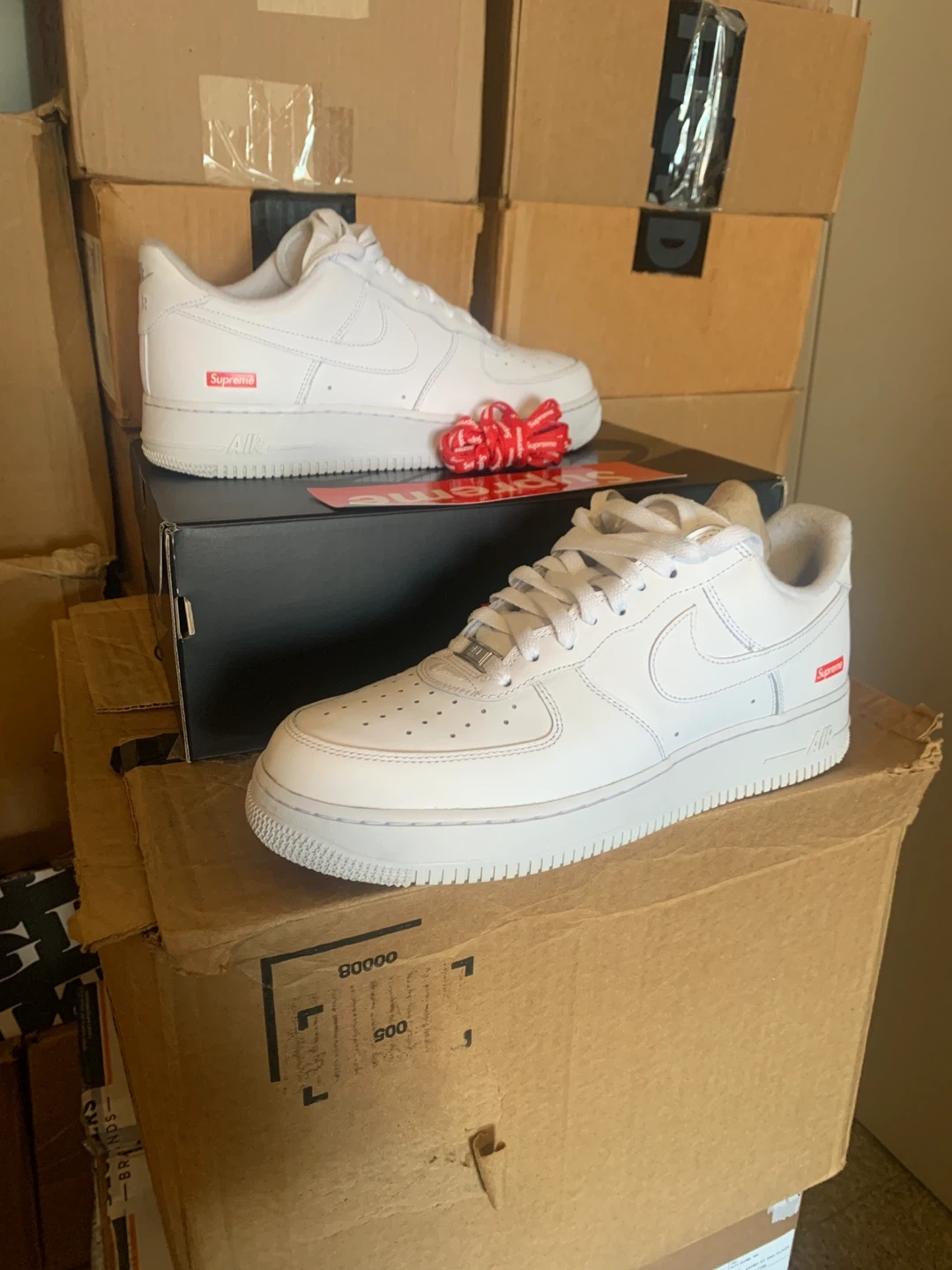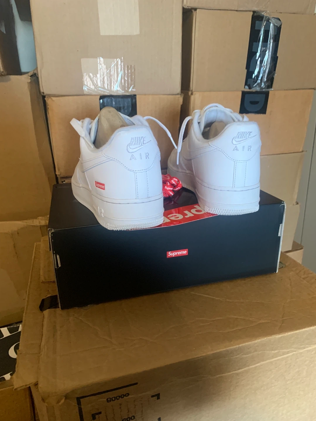 Selling a pair of Nike Air Force 1 Low SP Supreme in white, size 10.5 US men's. These come with the original box. They show some signs of wear on the soles, but are otherwise in good condition!