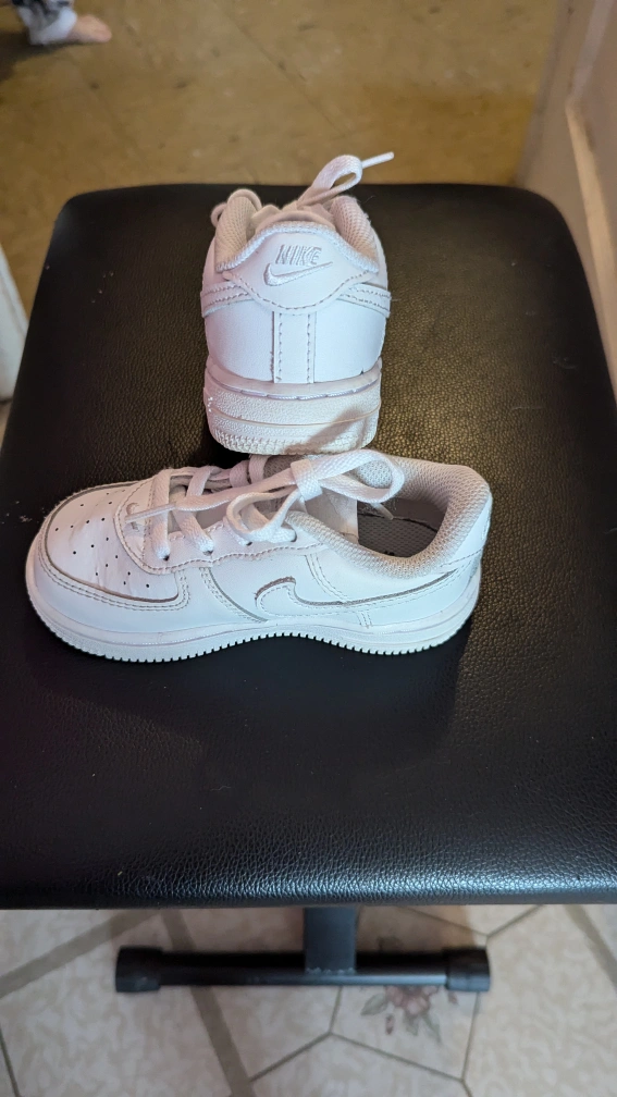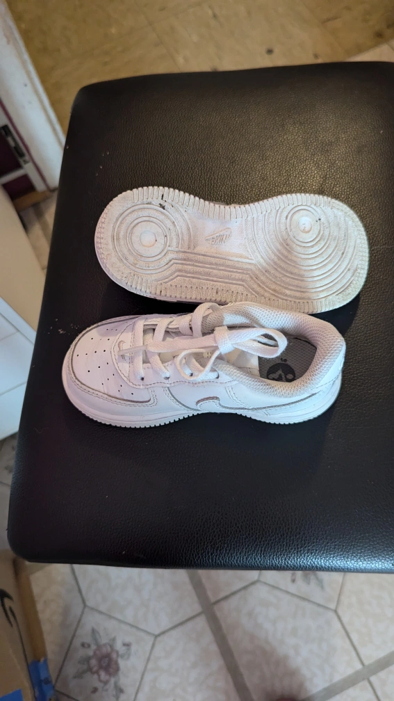 Selling a pair of Nike Air Force 1 toddler shoes in white. They are a size 8C (US size). They show some signs of wear.