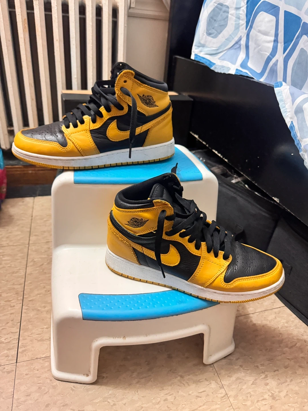 Selling a pair of Nike Air Jordan 1 High sneakers in the Taxi Yellow colorway. These are in great condition and ready for a new home! They're a stylish addition to any sneaker collection Vendo un par de zapatillas Nike Air Jordan 1 High en el color Amarillo Taxi. ¡Estos están en excelentes condiciones y listos para un nuevo hogar! Son una adici ón elegante a cualquier colección de zapatillas