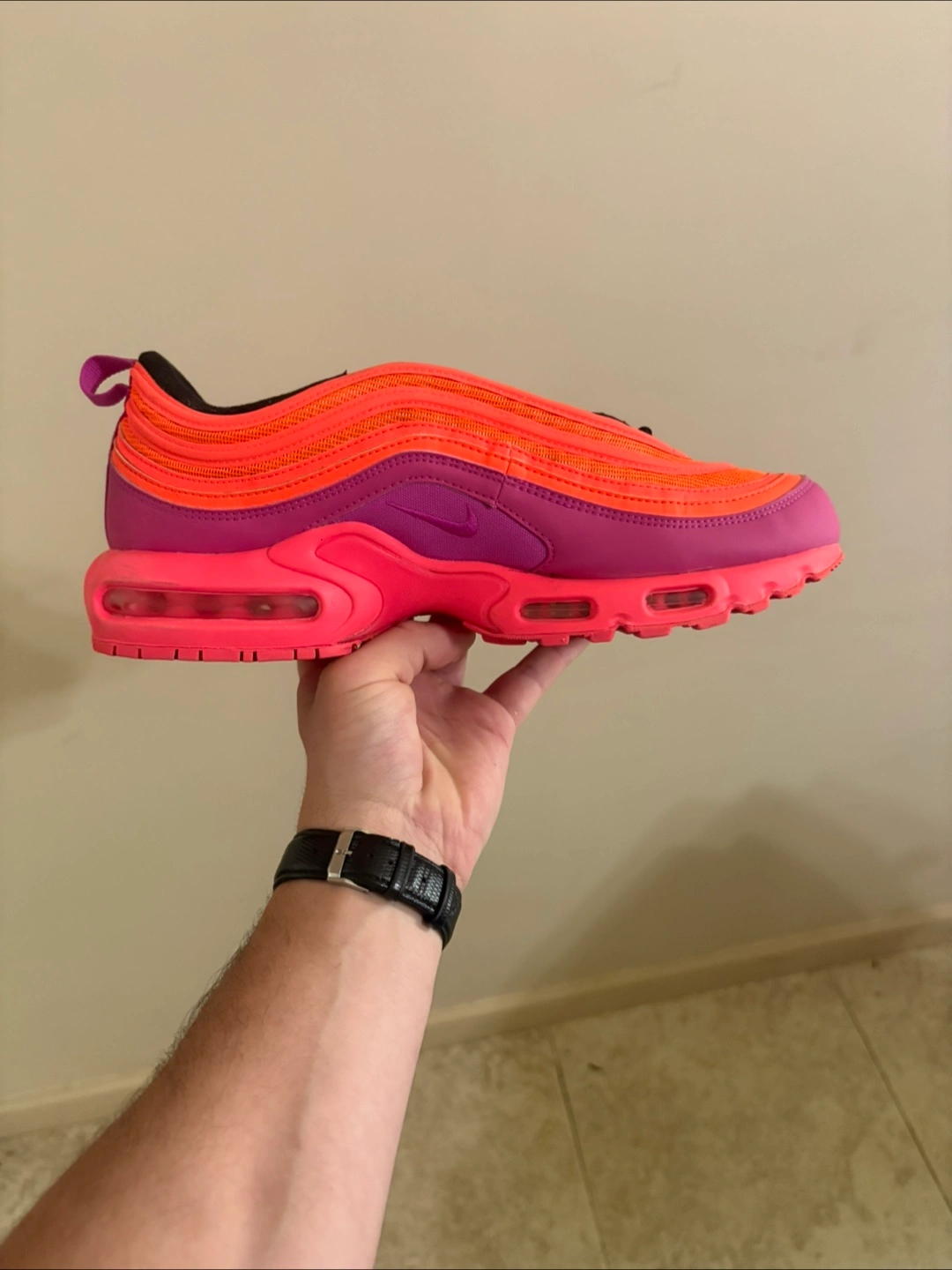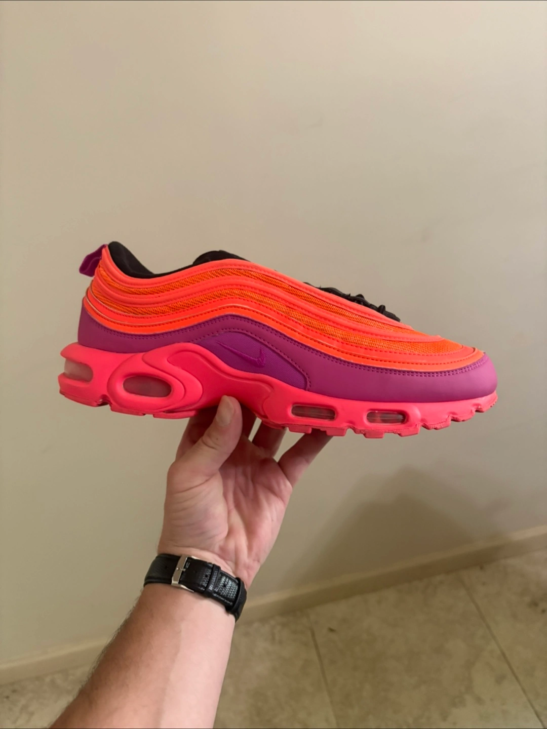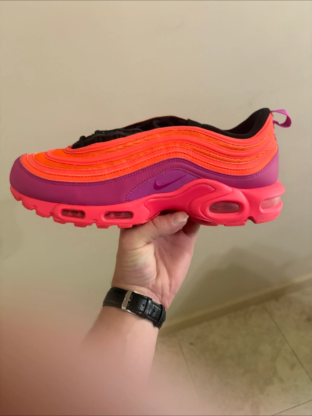 Selling a pair of Nike Air Max 97 TN Hybrid sneakers in a vibrant orange and pink colorway. These shoes are in great condition and ready for a new home! Perfect for adding a pop of color to your wardrobe Used VNDS size 10.5