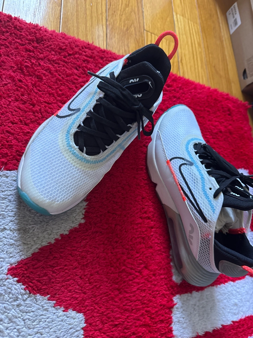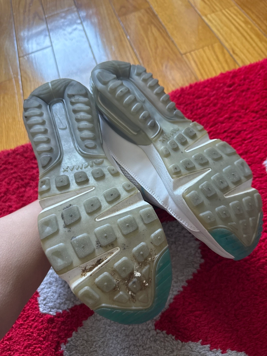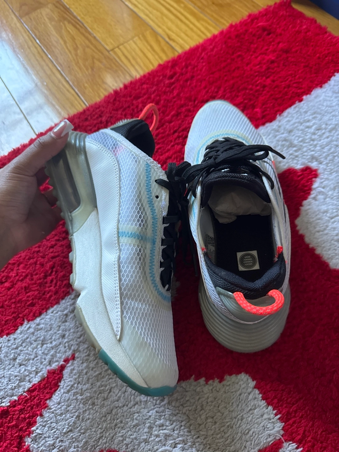White and teal Nike Air Max Pulse running shoes. Lightweight mesh upper. Visible Air cushioning. Size not specified. Some minor wear on soles. worn once