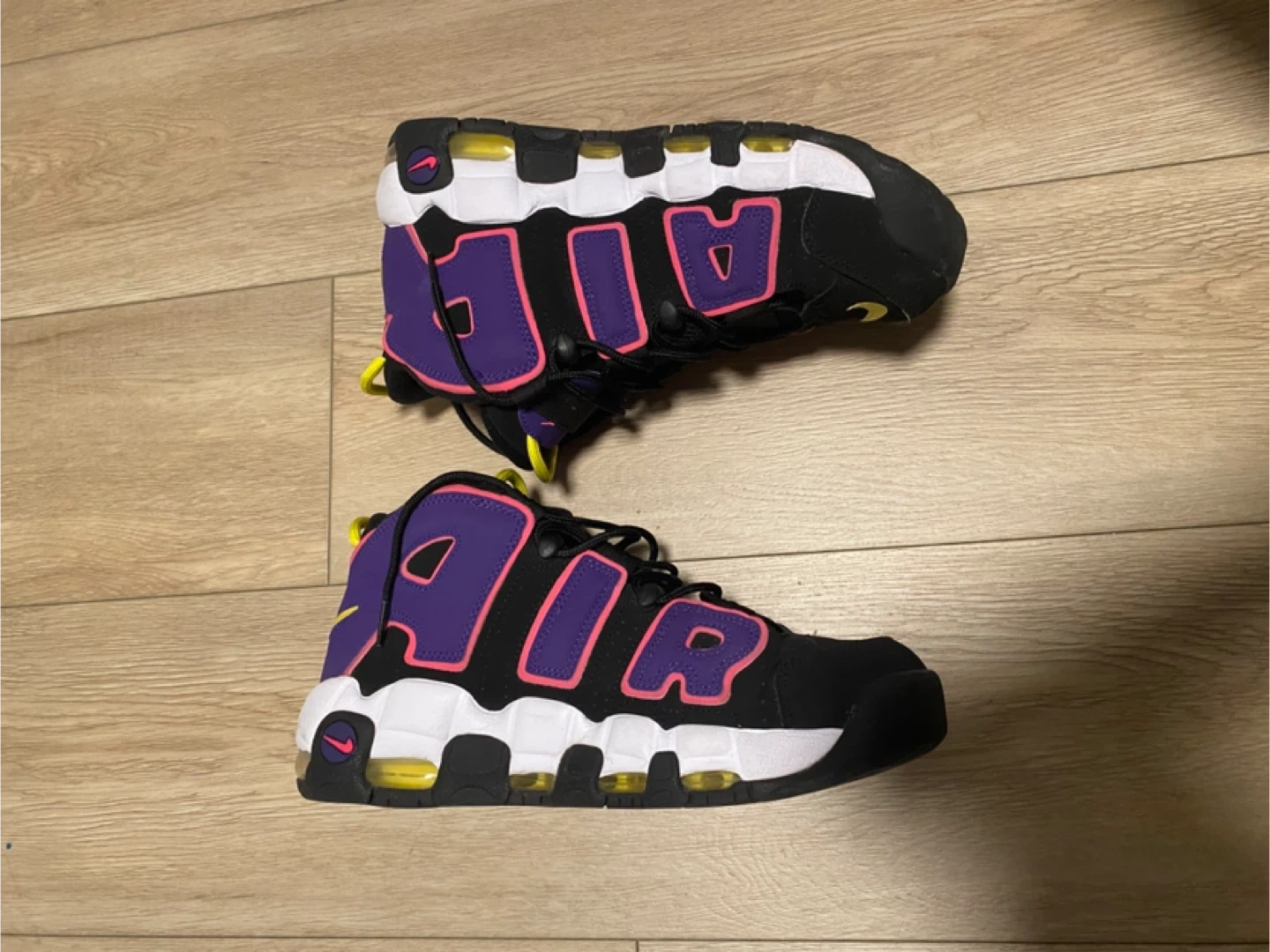 Nike Air More Uptempo shoes in a vibrant purple and pink colorway! These shoes are in great condition and feature the iconic 'AIR' design on the sides. Perfect for adding a pop of color to your wardrobe!
