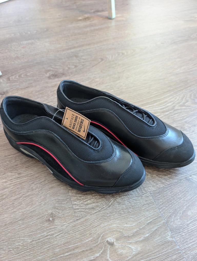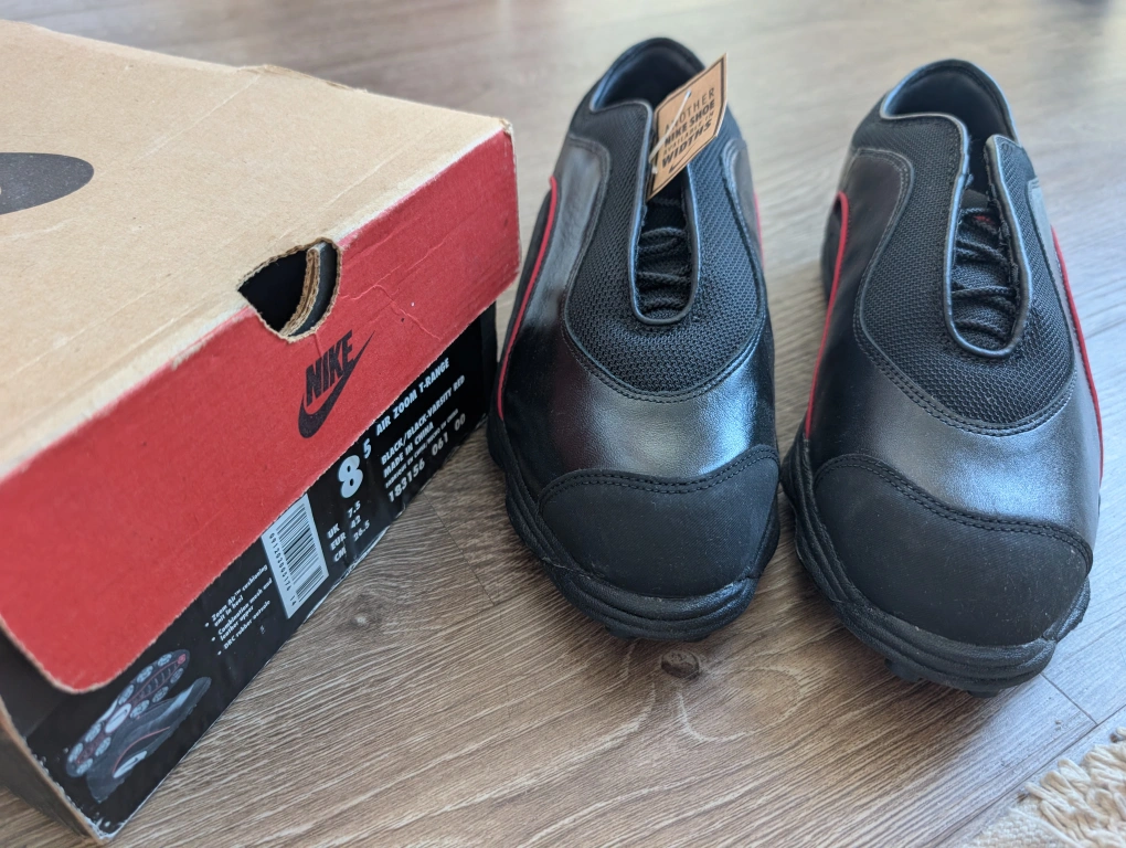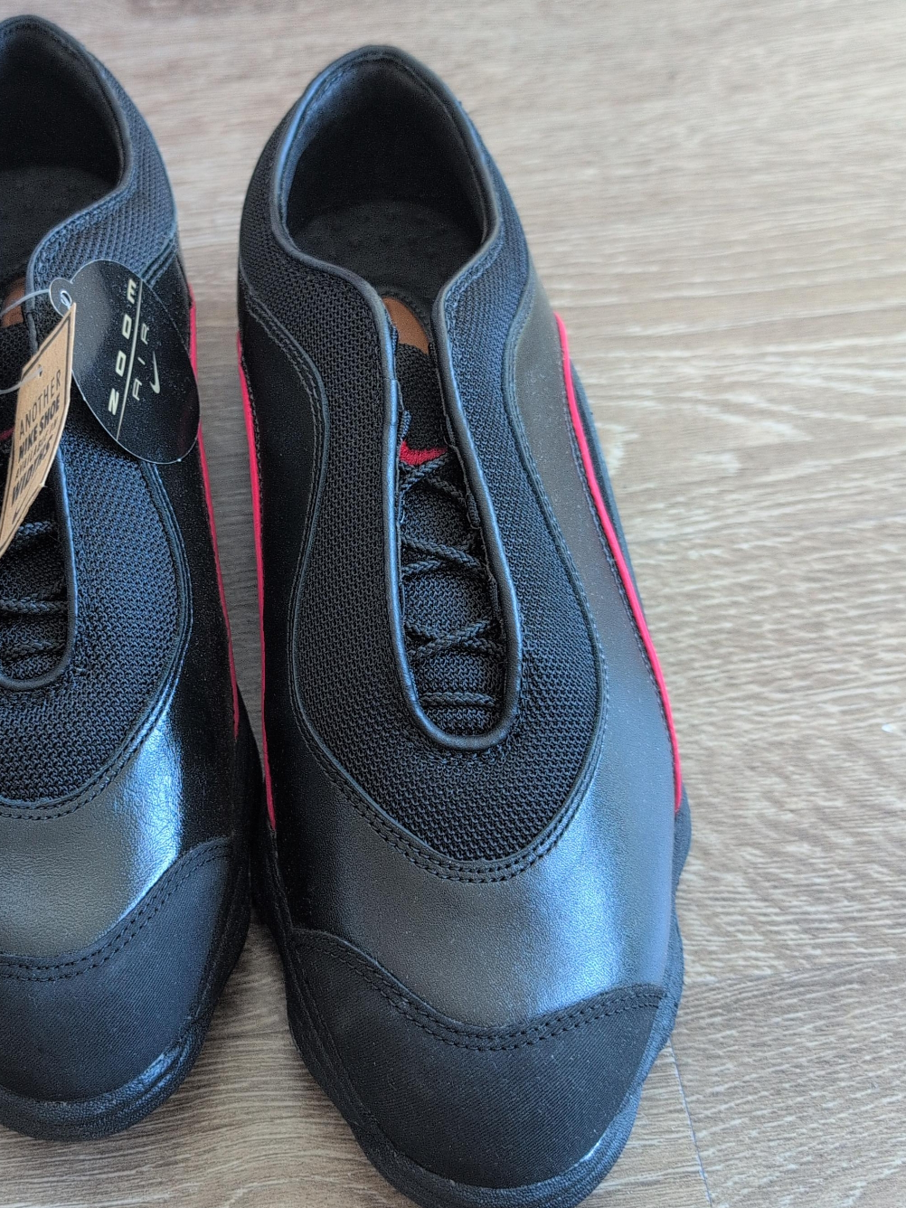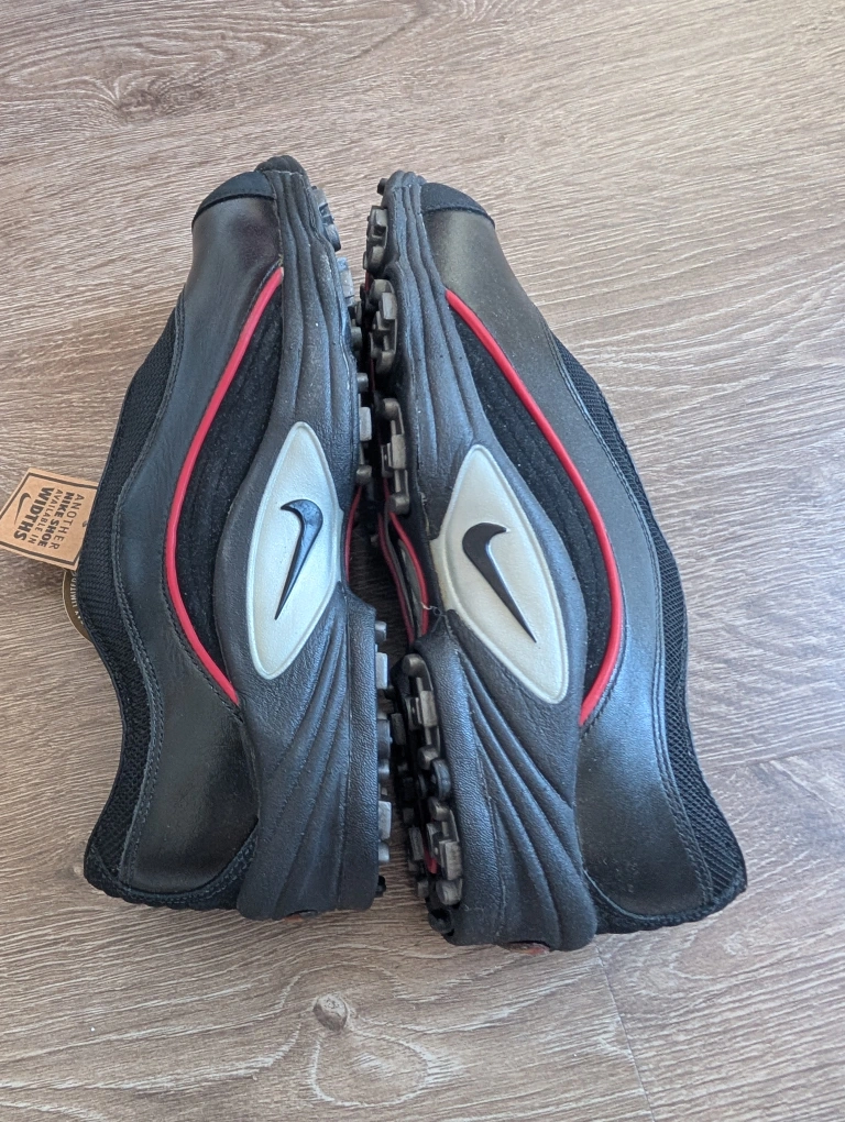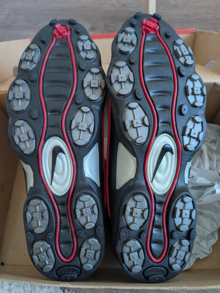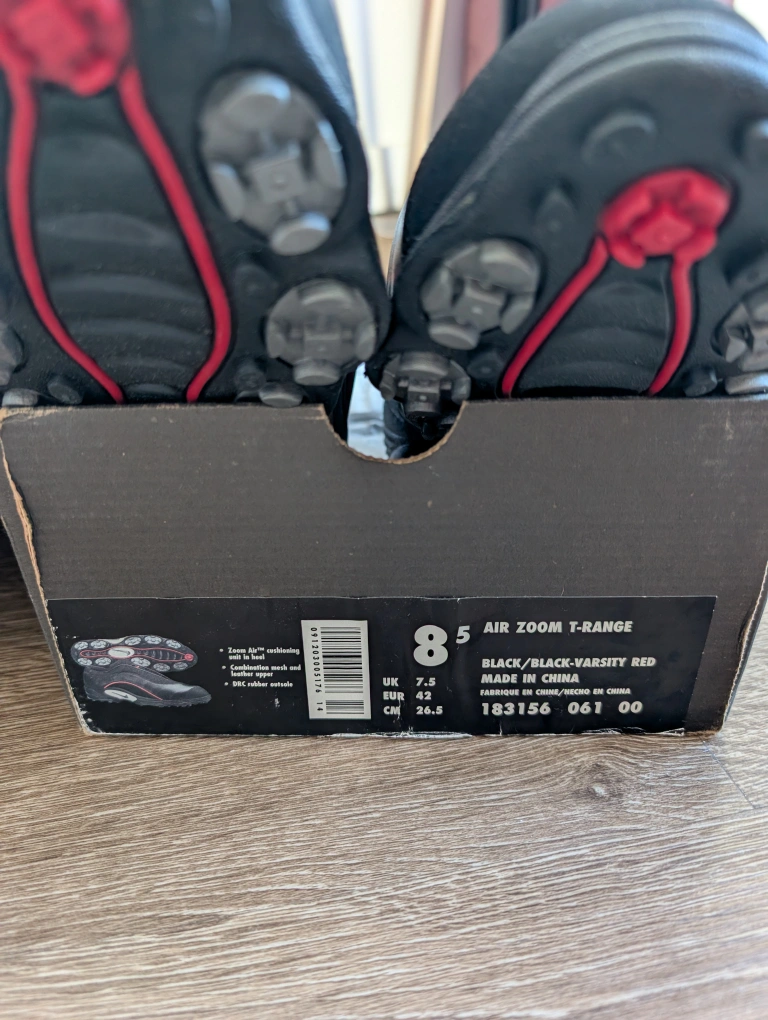 Selling a pair of Nike Air Zoom T-Range golf shoes in size 8.5 M. They feature a stylish black, black, and varsity red colorway. The shoes come with their original box. These shoes have a combination mesh and synthetic leather upper with a DRC rubber outsole. Brand New with Nike box.