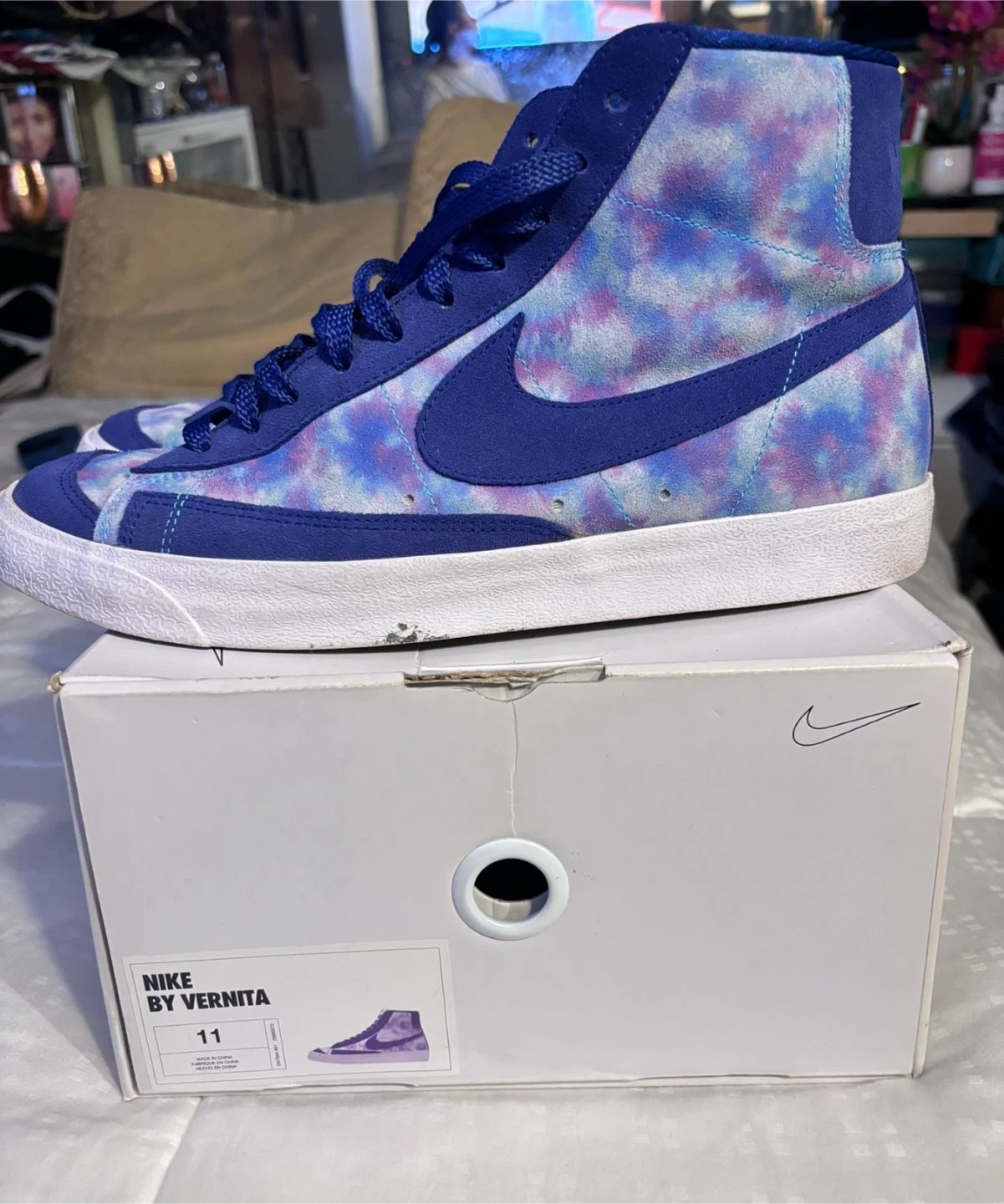15Selling a pair of Nike Blazer Mid '77 By Vernita sneakers in a cool blue tie-dye pattern! These are a size 11 and come with the original box. They're in good condition and ready for a new home!