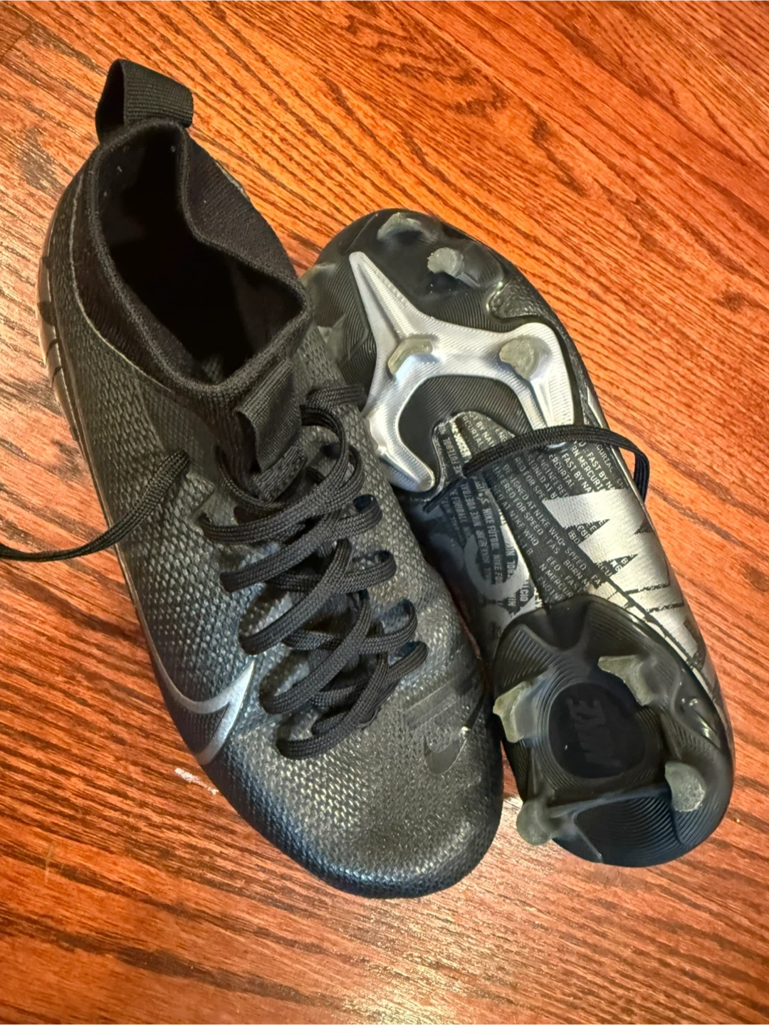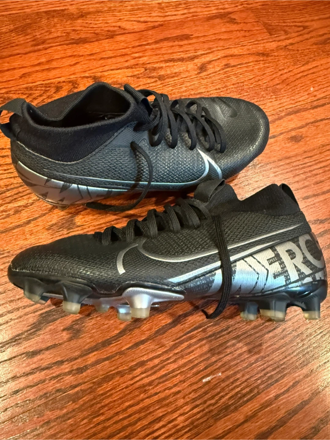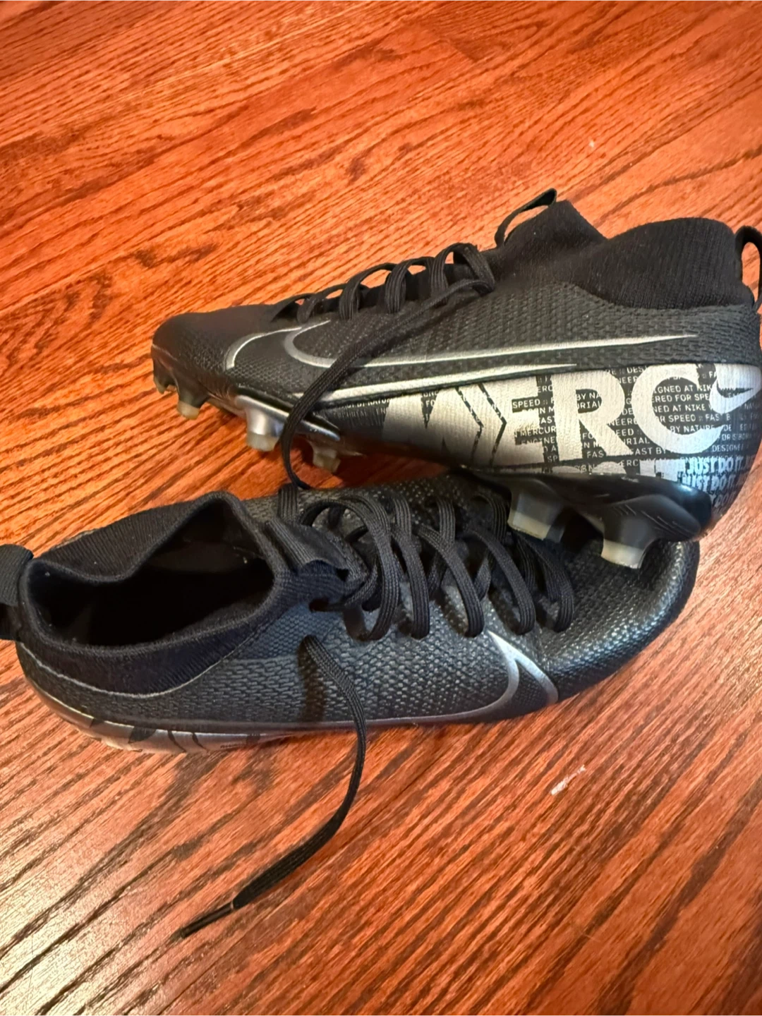 10Selling a pair of Nike Mercurial soccer cleats. They are black with silver accents and in good condition. Perfect for your next game! 2.5y