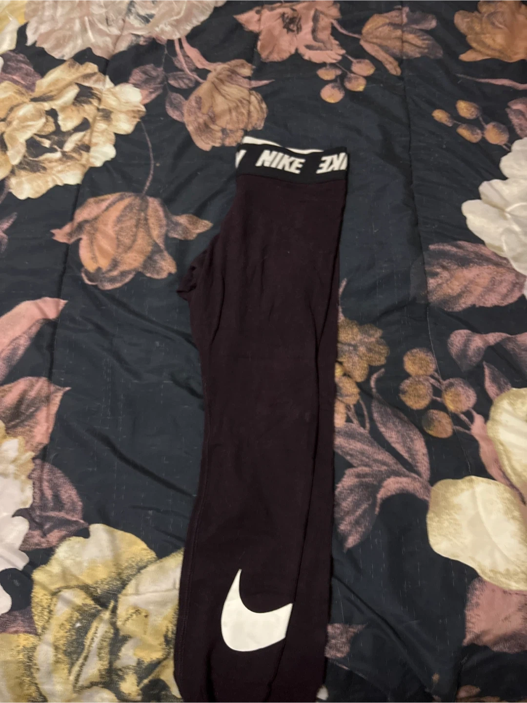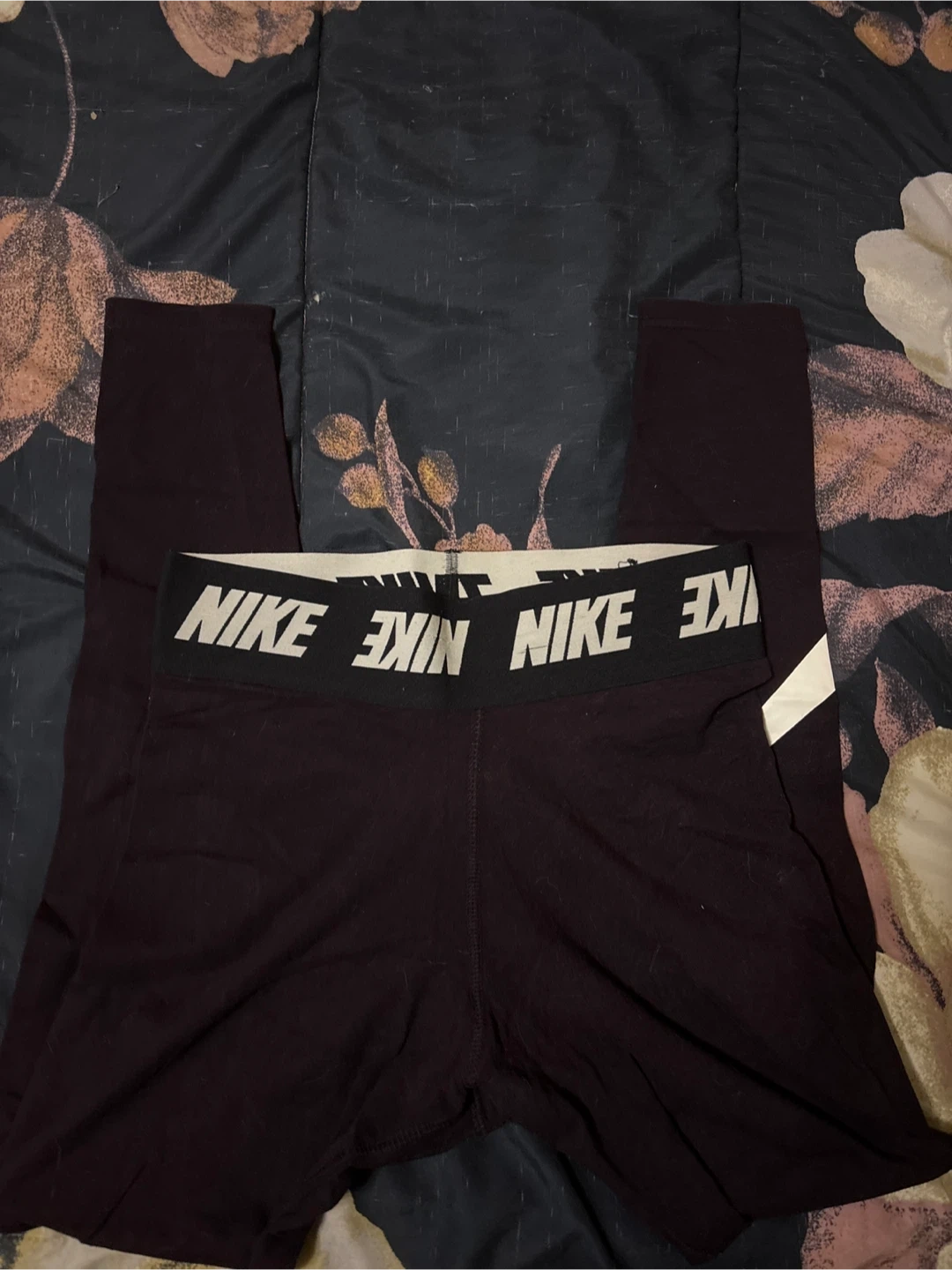 Selling a pair of Nike Pro women's leggings in a dark purple color. They feature the Nike logo on the waistband and a white swoosh on the leg. These are a size large and are in good condition!