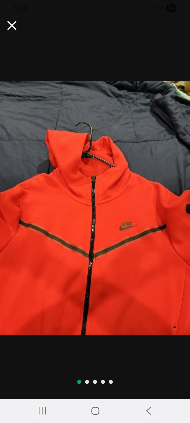 0Selling a Nike Tech Fleece jacket in red. It features the Nike logo and a full zipper. Perfect for layering or wearing on its own! $75