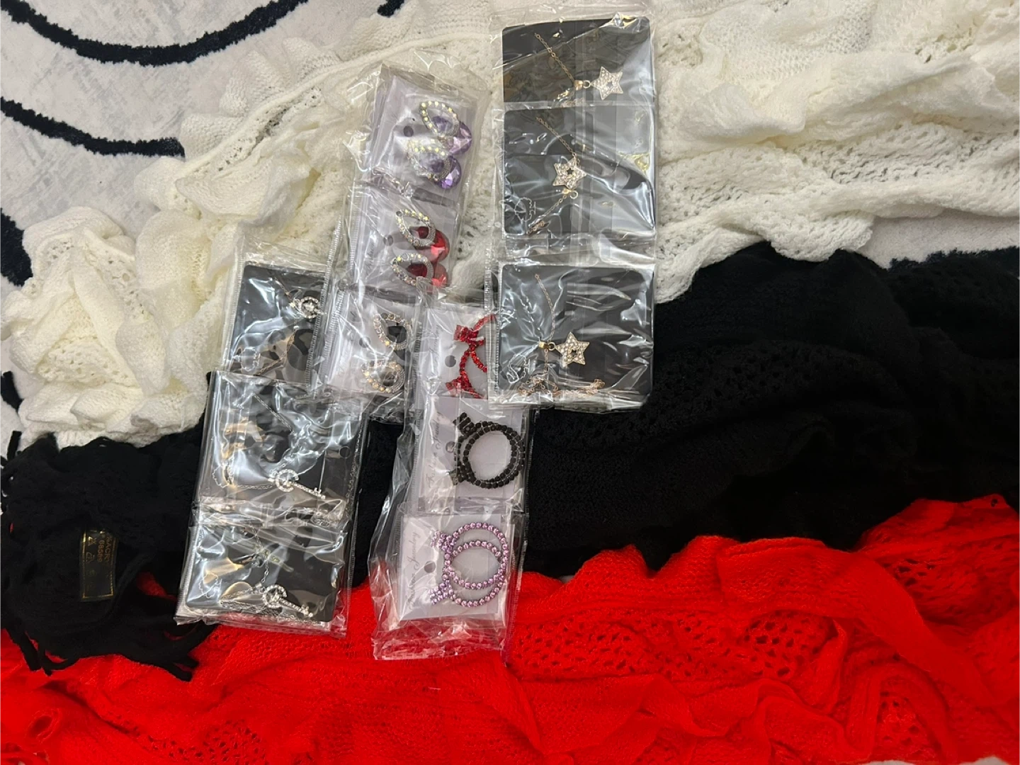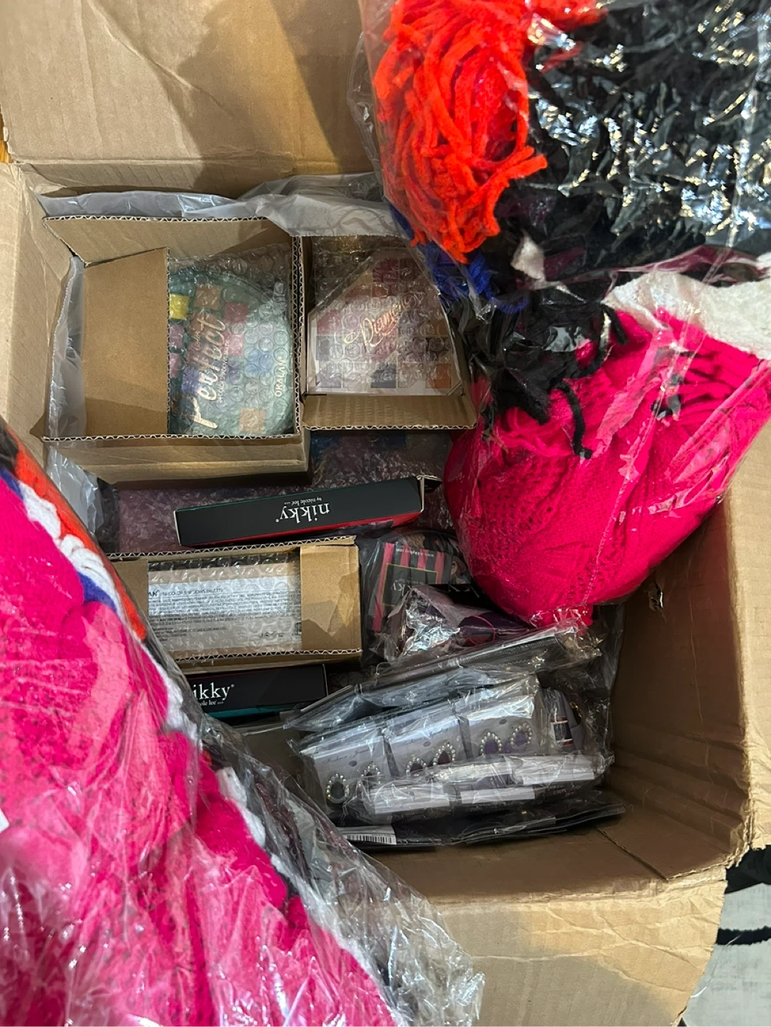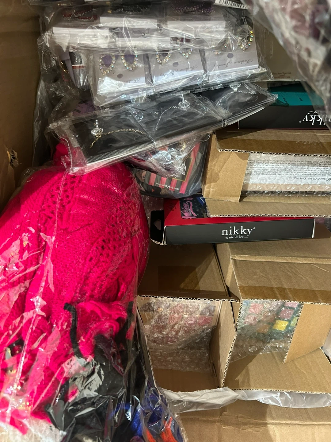 Selling a mixed lot of Nikky by Nikki makeup like eyeshadow in different sizes, some jewelry including necklaces and earrings, some scarfs, little mirrors and little bags.