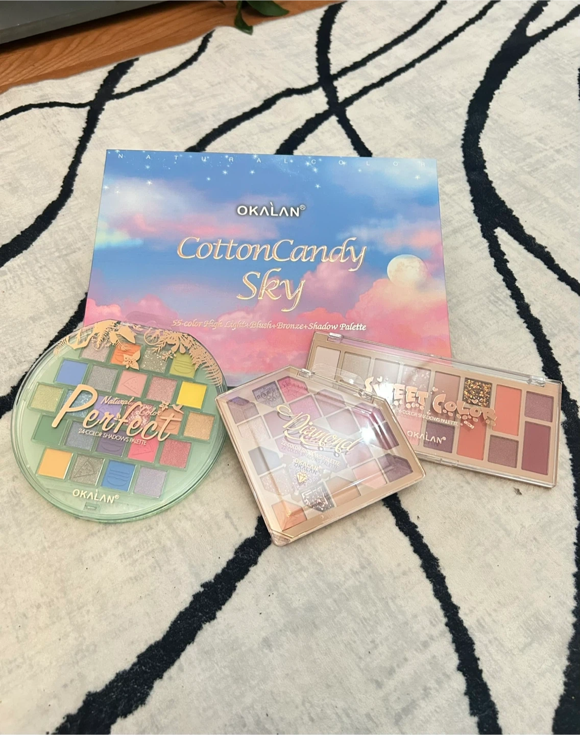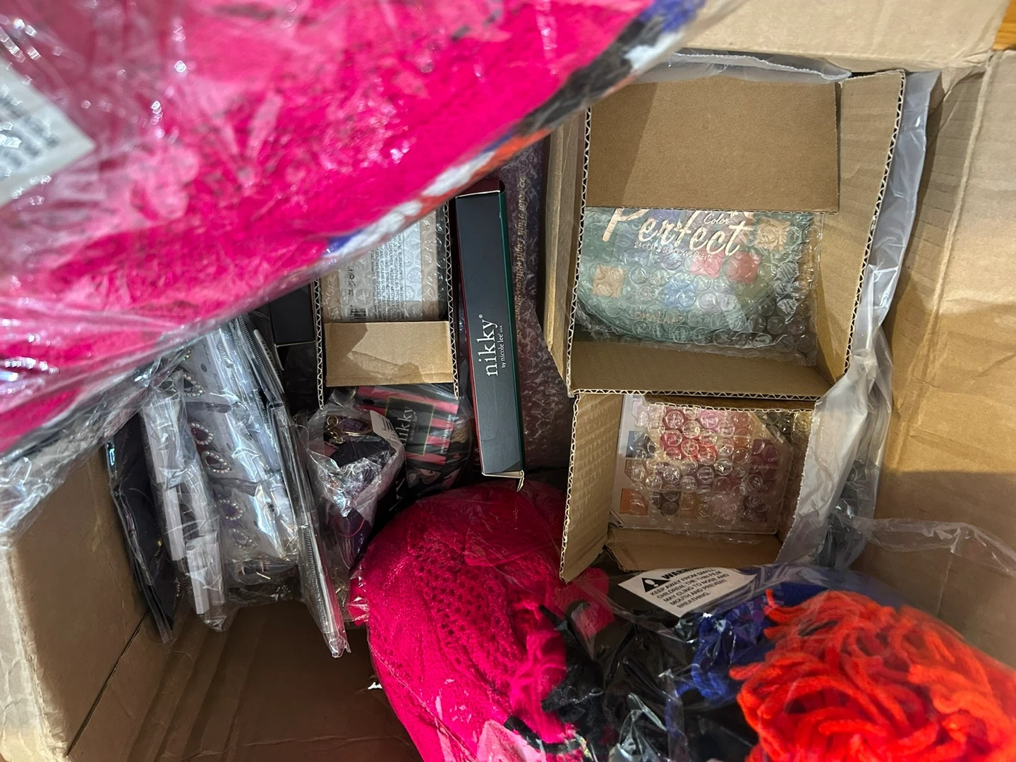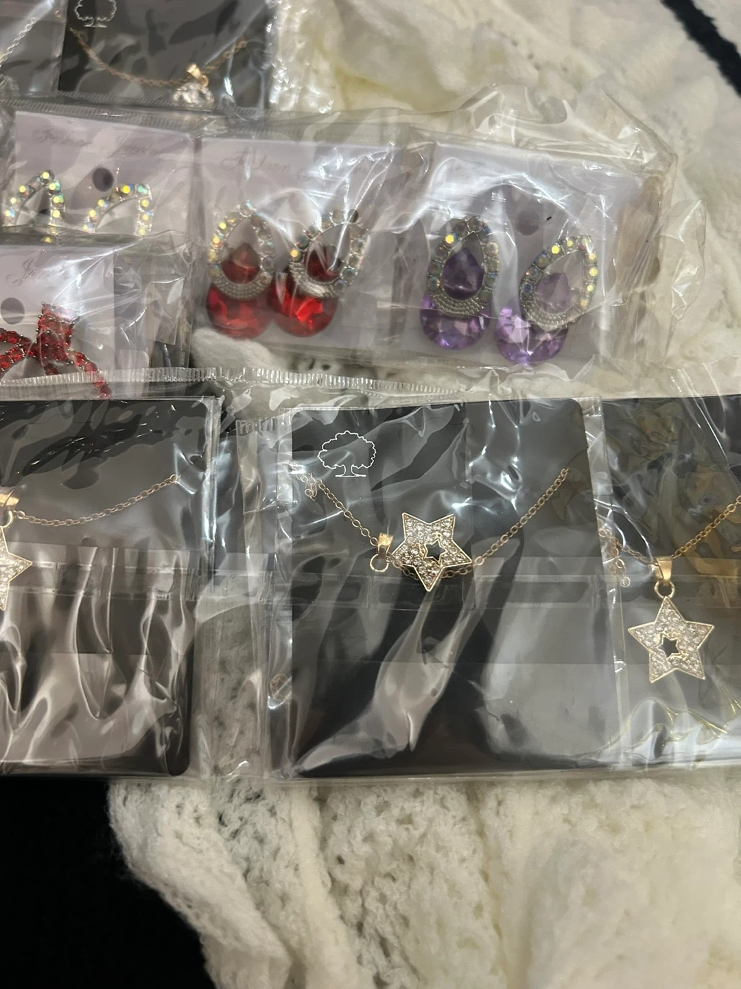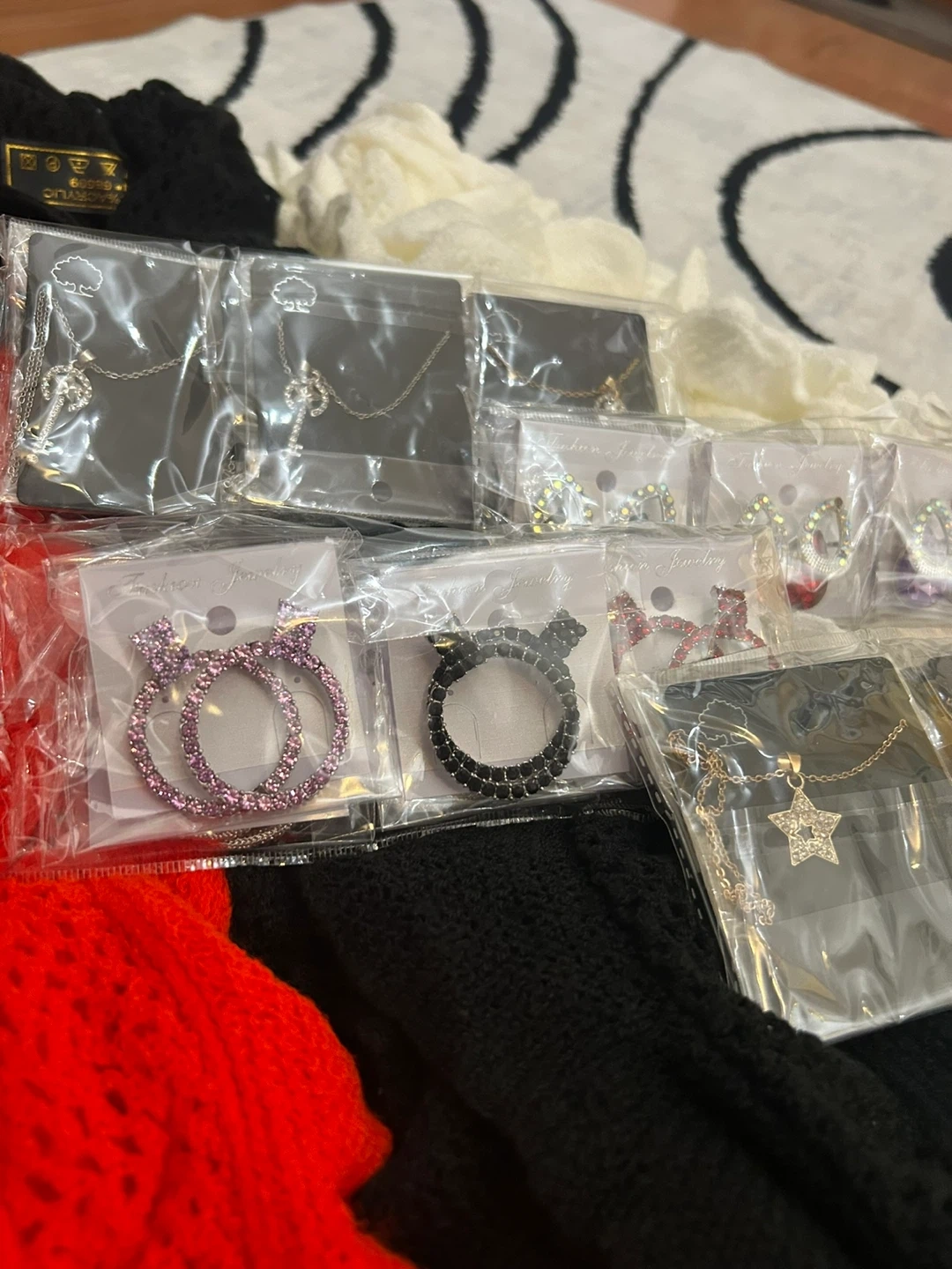 Selling a mixed lot of Nikky by Nikki makeup like eyeshadow in different sizes, some jewelry including necklaces and earrings, some scarfs, little mirrors and little bags.