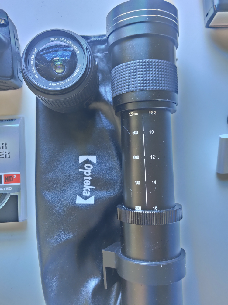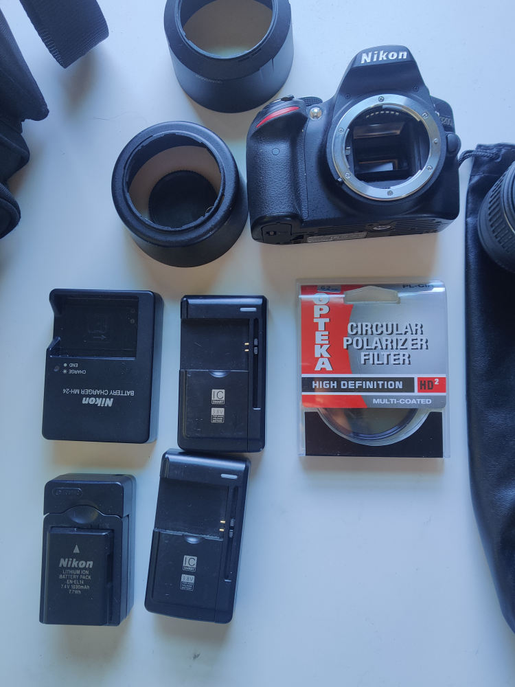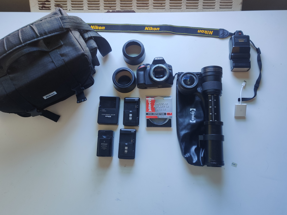 Nikon d3200 camera kit includes: camera body 18-55mm lense 400-800mm lense (telephoto) 32gb SD SD-type C adapter camera carry bag 4 chargers 2 batteries