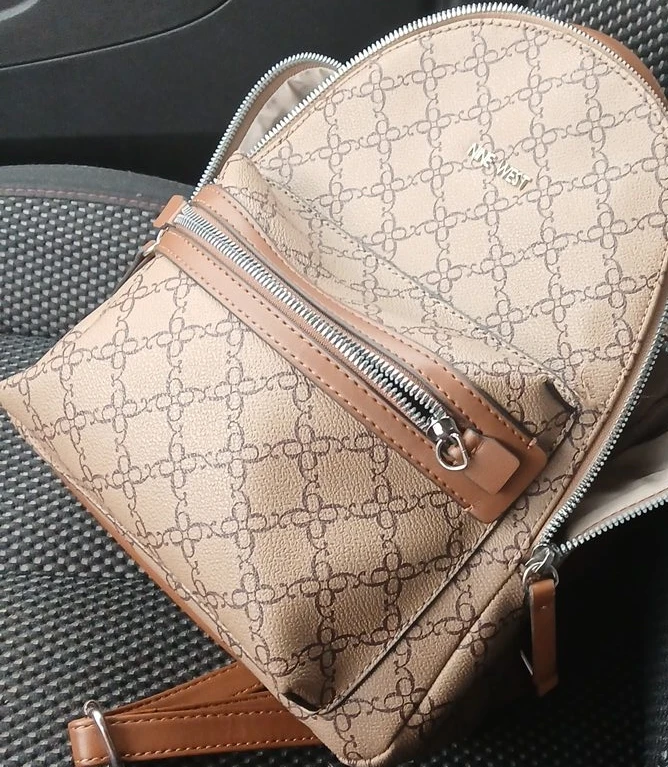 50Selling a cute Nine West mini backpack! It's a tan color with a unique pattern. Perfect for carrying your essentials in style