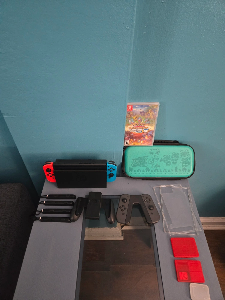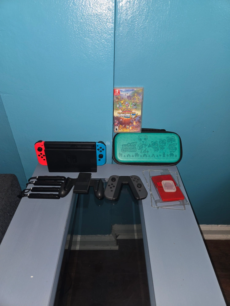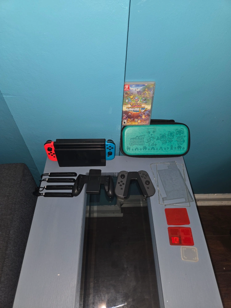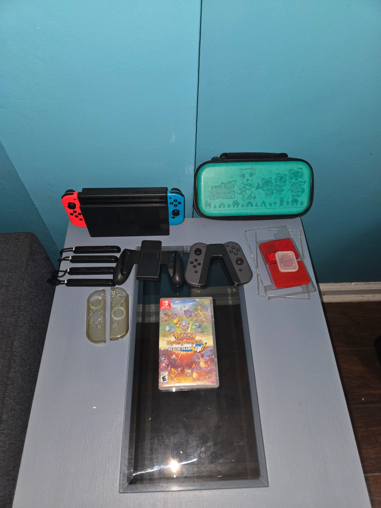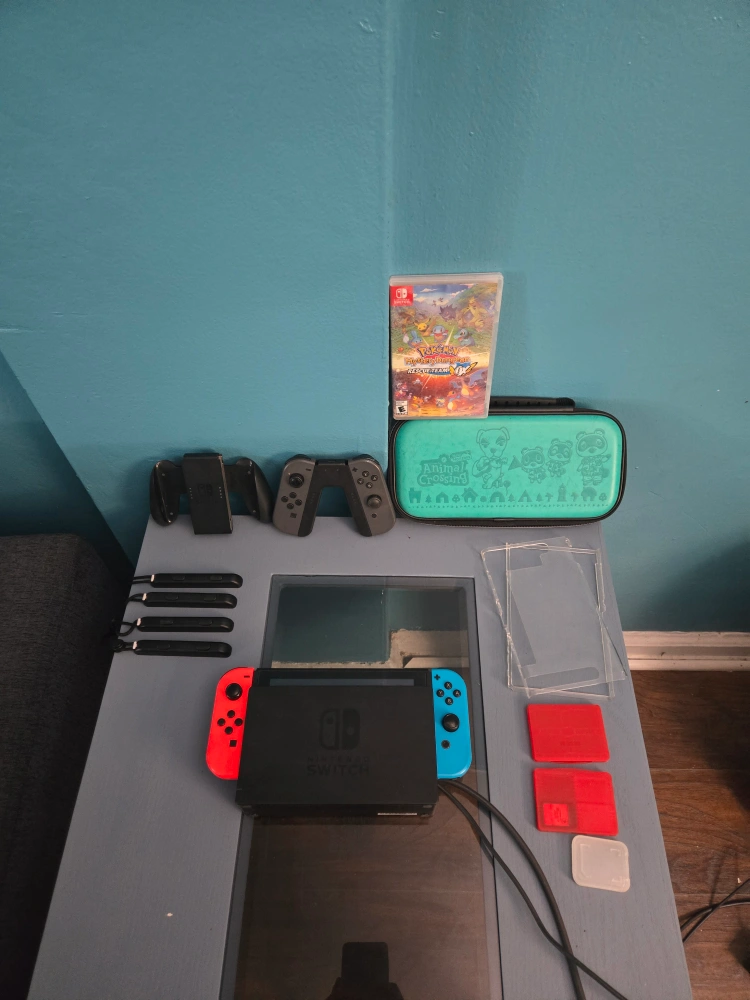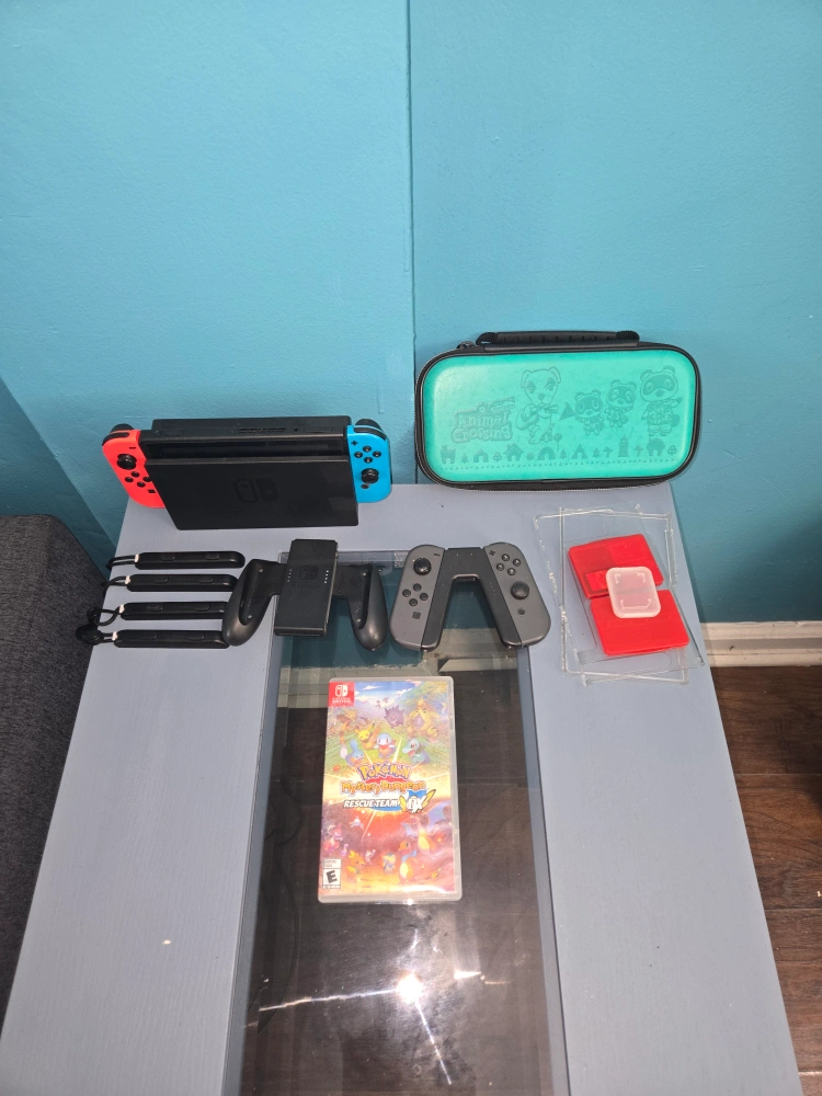 Selling a Nintendo Switch bundle! Includes the console with red and blue Joy-Cons, a Pro Controller, a carrying case, and the game Pokemon Mystery Dungeon: Rescue Team DX