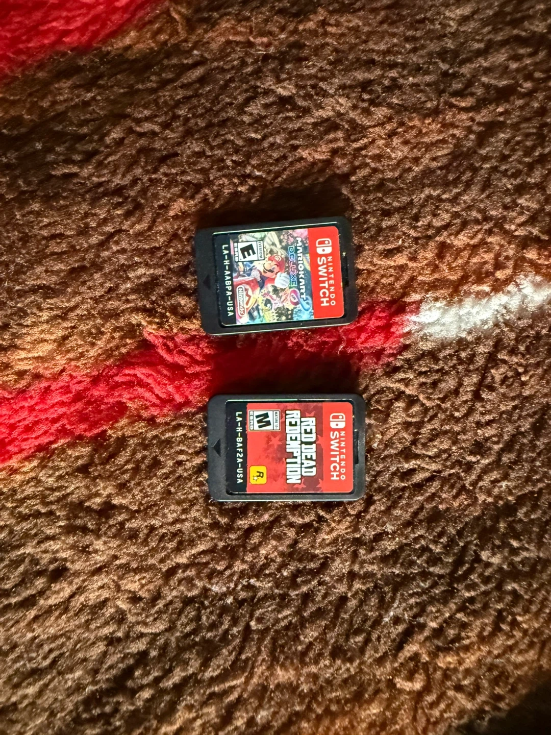 10Selling two Nintendo Switch game cartridges! One is Mario Kart 8 Deluxe, rated E for Everyone. The other is Red Dead Redemption, rated M for Mature. Both games are in great condition and ready for a new home