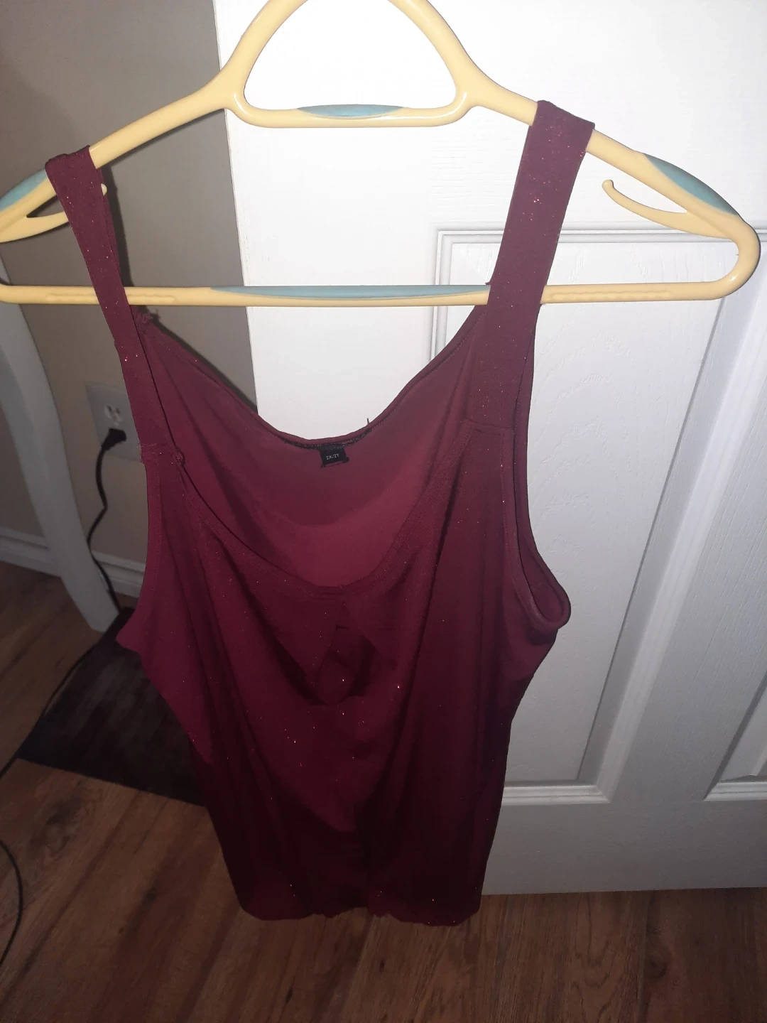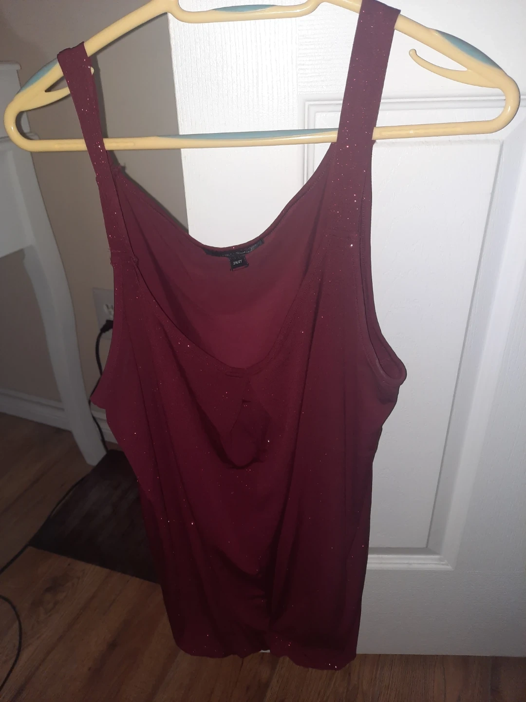 Color: Maroon or deep red. Design: It appears to be a sleeveless top with a draped or ruched front and a v-neckline. Details: The fabric has a glittery or sparkly finish throughout. Size 2X