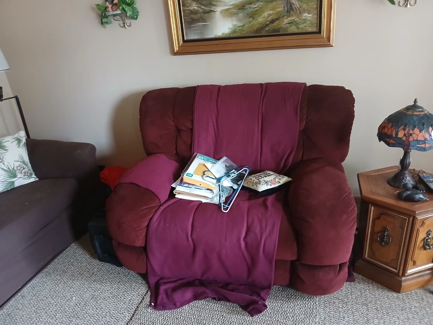 Comfortable plush recliner armchair in a rich burgundy color. It's well-padded for relaxation. Perfect for any living room seating area!