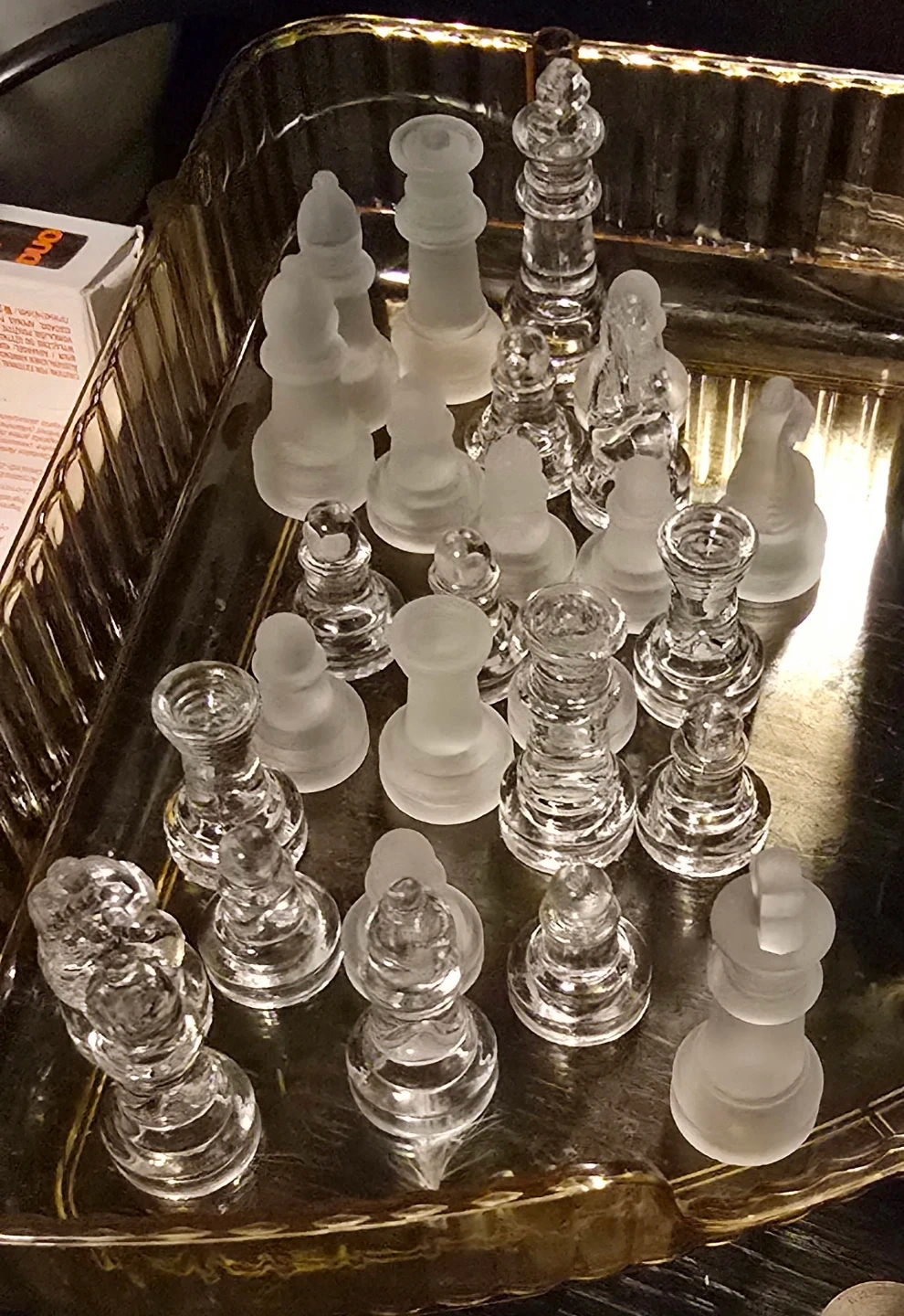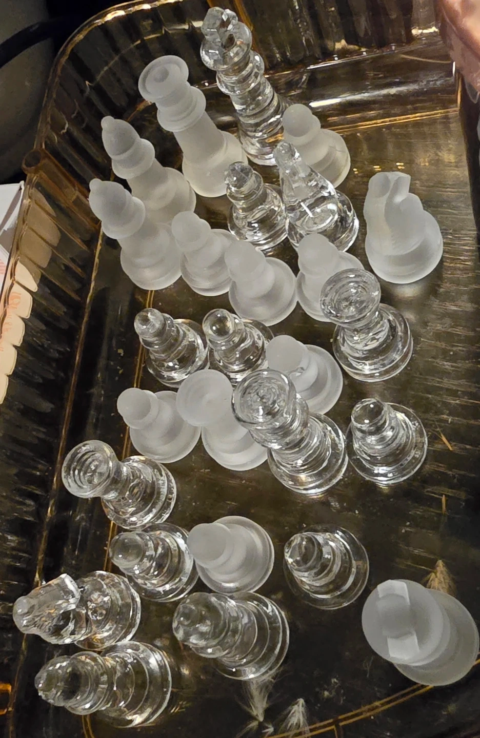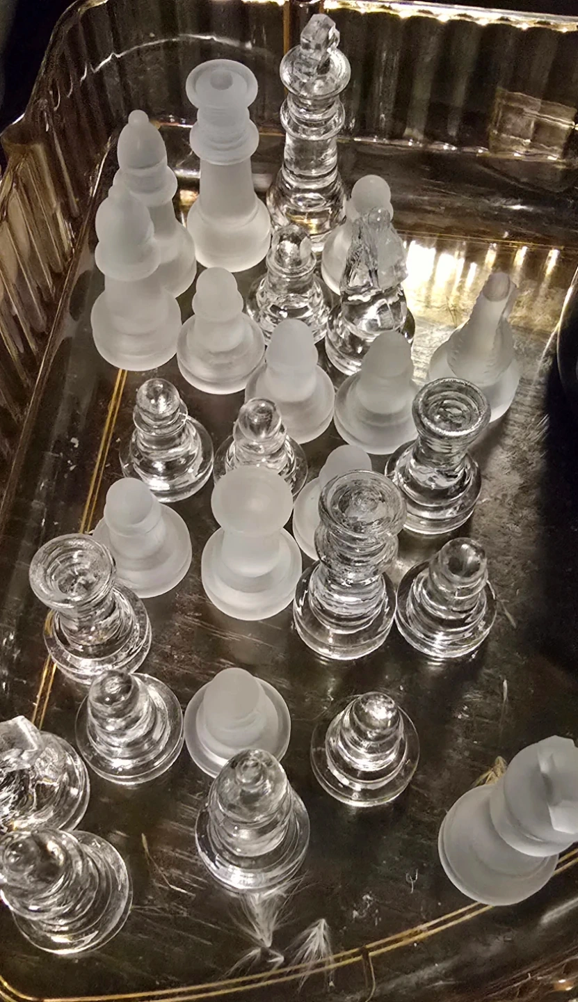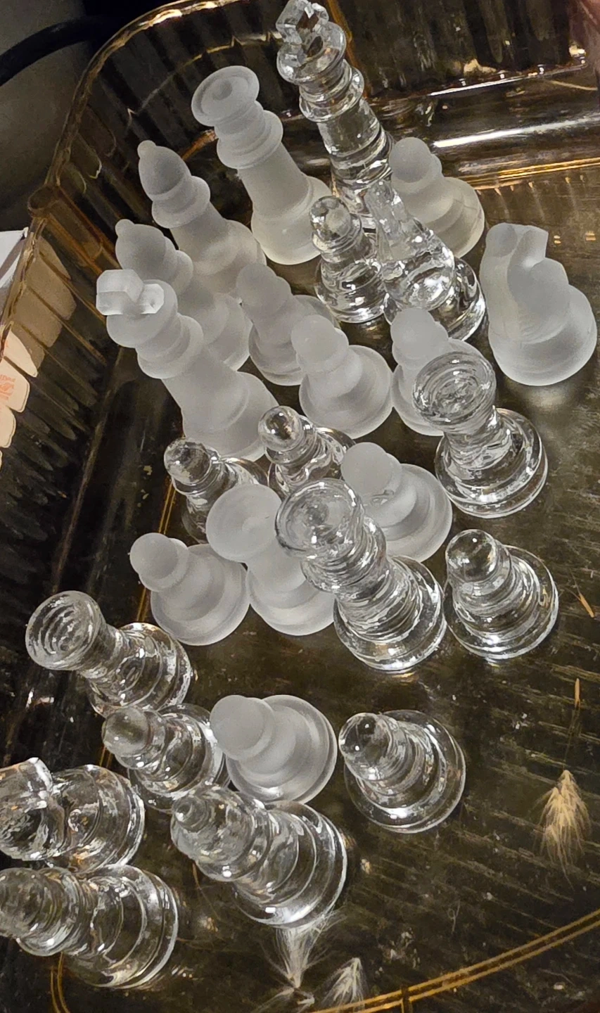 A set of glass chess pieces, featuring both clear and frosted finishes. Includes all standard chess pieces. These pieces are designed for a glass or mirrored chess board that's not included. May not have all the pieces
