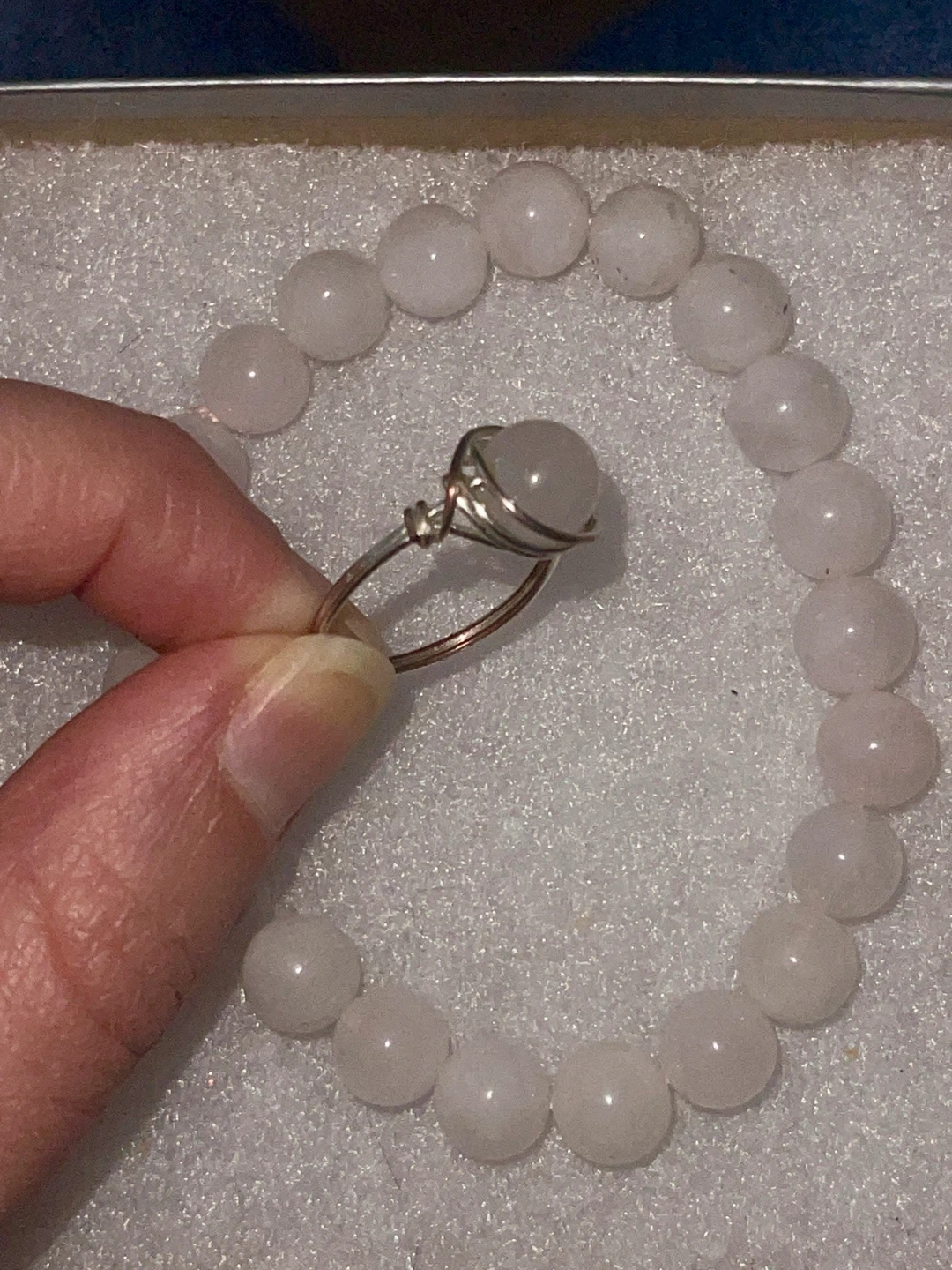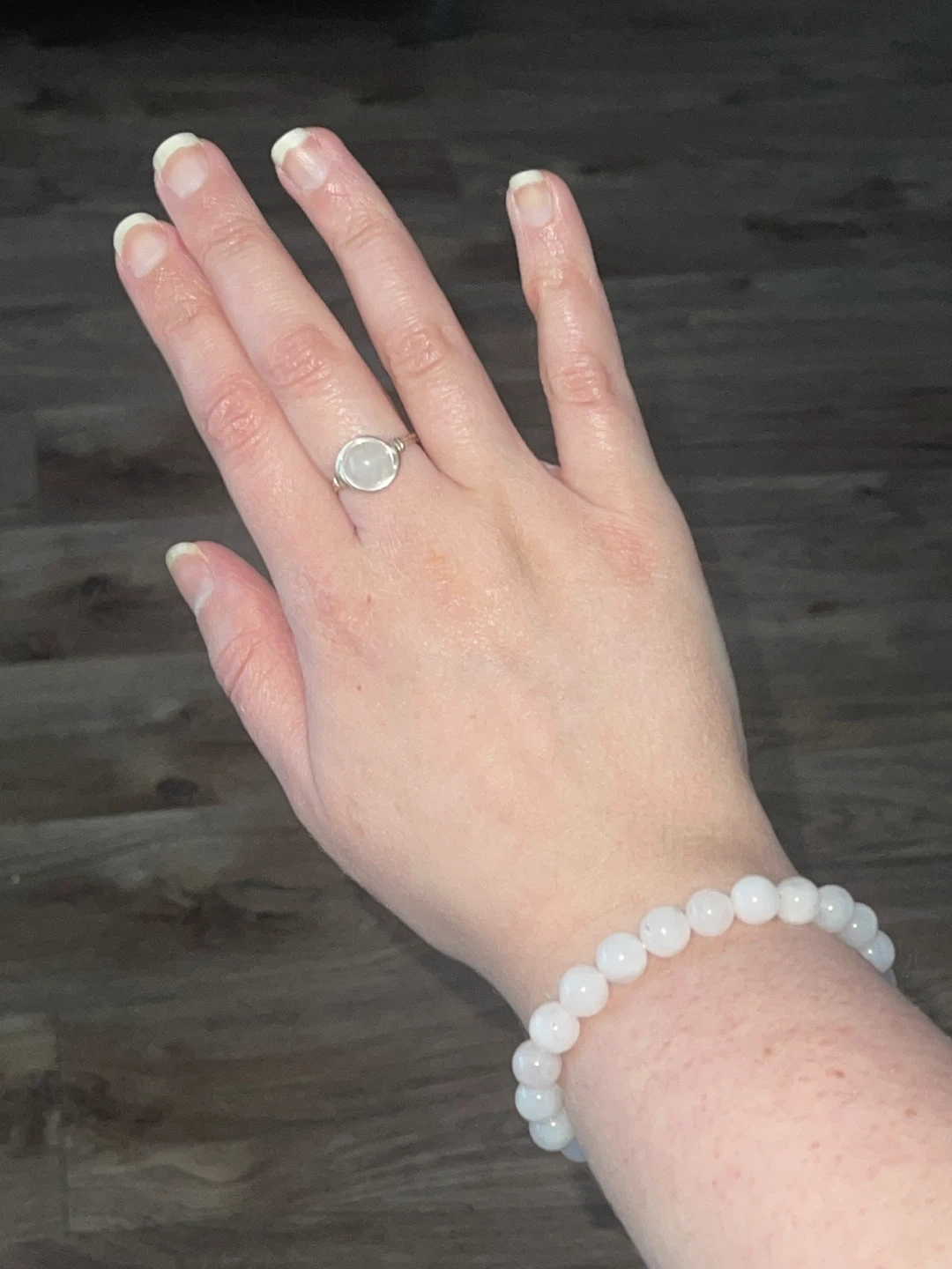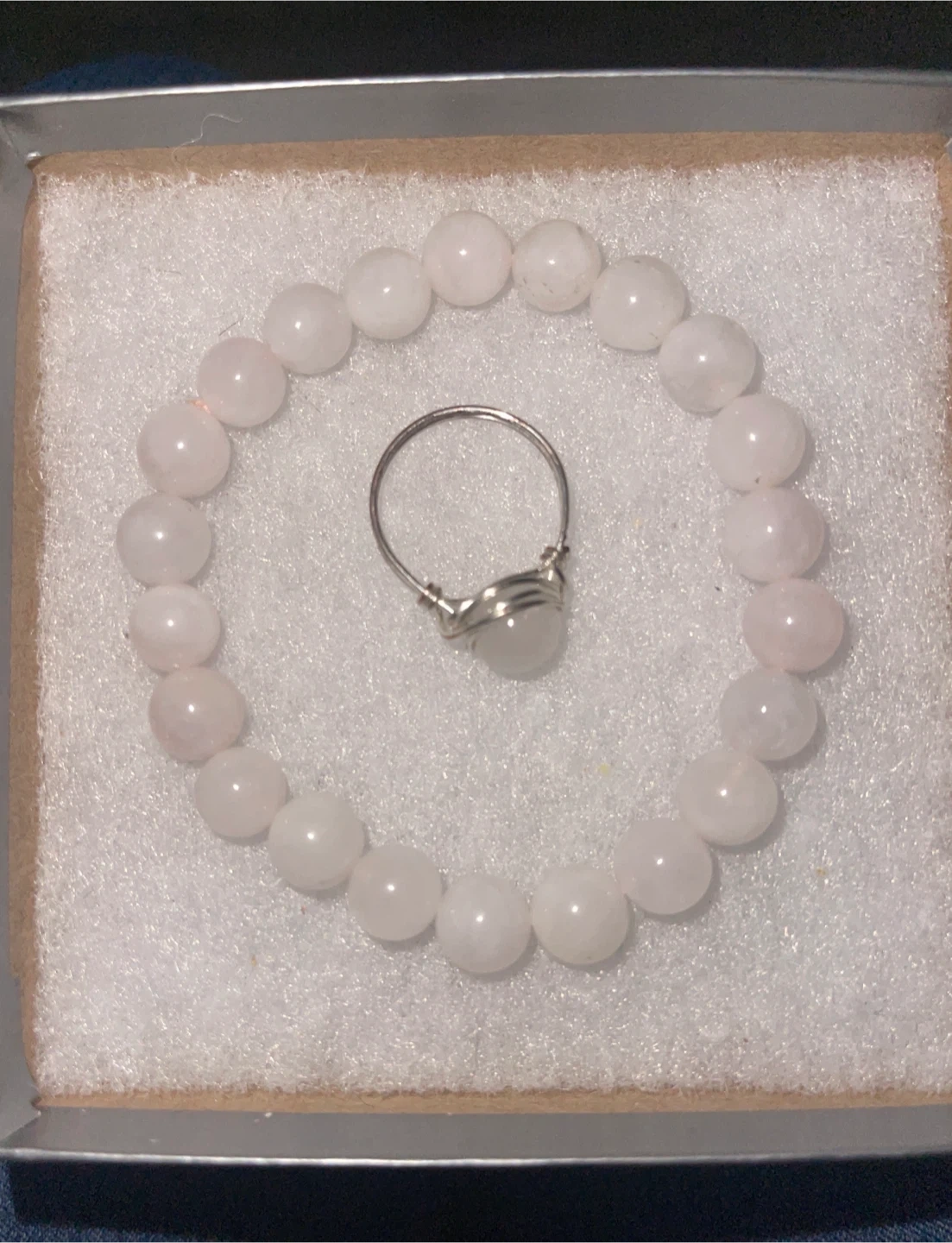 Purchased this set from Happy Soul crystal shop. Both worn in good condition. Ring has some minor tarnishing as shown. Bracelet is one size as it’s elastic.
