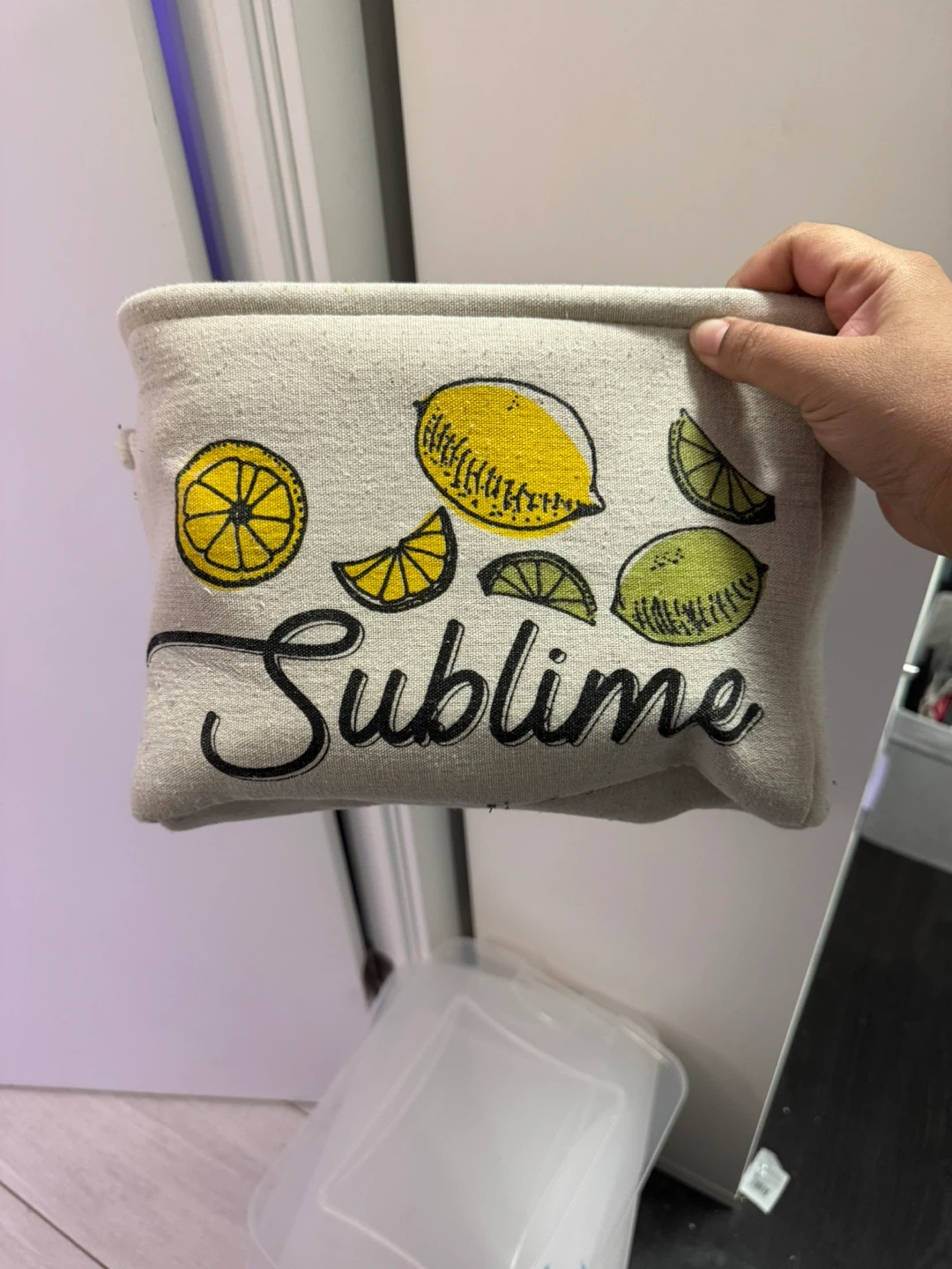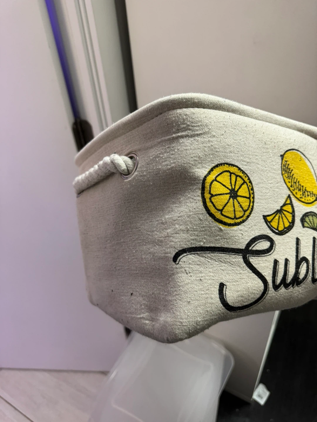 Cute storage bin with a lemon print and the word 'Sublime' on the side! Perfect for organizing small items around the house