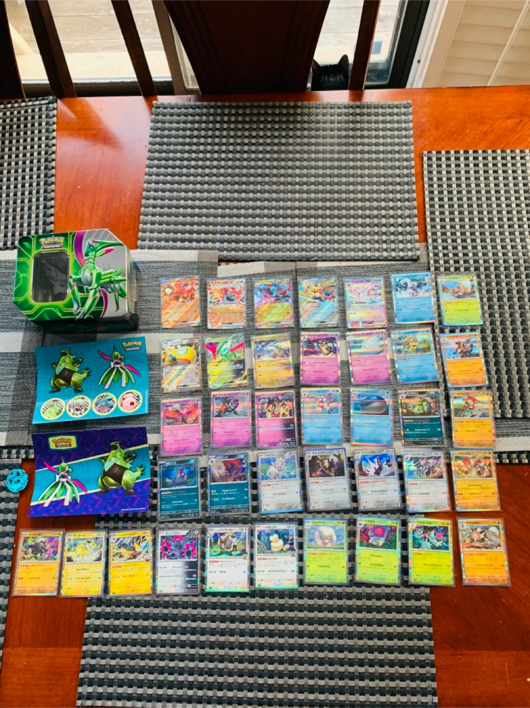 38 Pokémon Japanese Trading Cards in great condition. Comes with collectable box, stickers, and a coin. Comes with 7 ex cards and 31 holo cards. Smoke free home