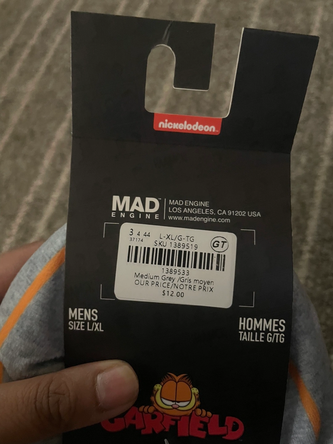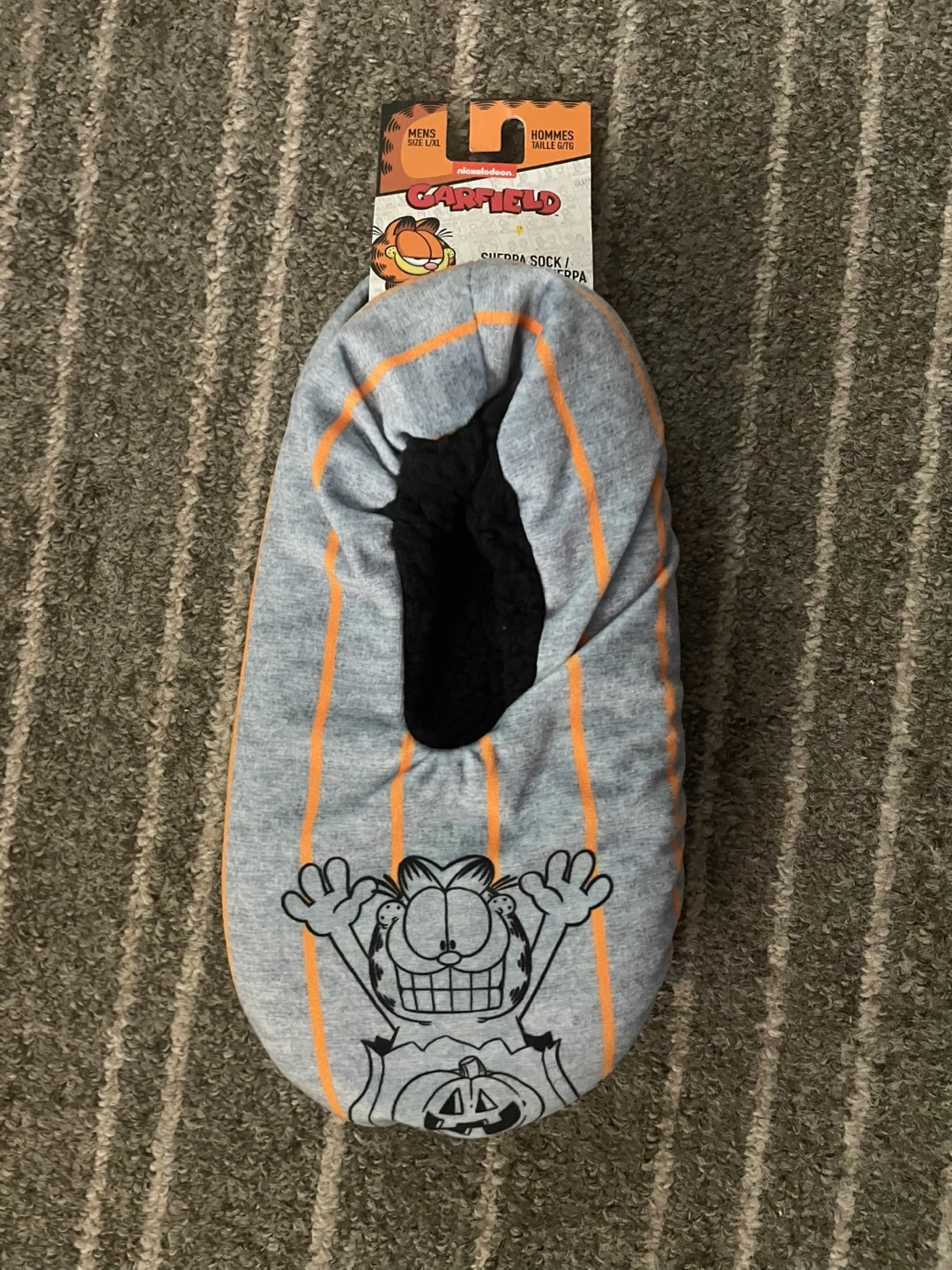 New Garfield sherpa socks. Men's size L/XL. Grey with orange stripes. Features Garfield graphic. Mad Engine brand.