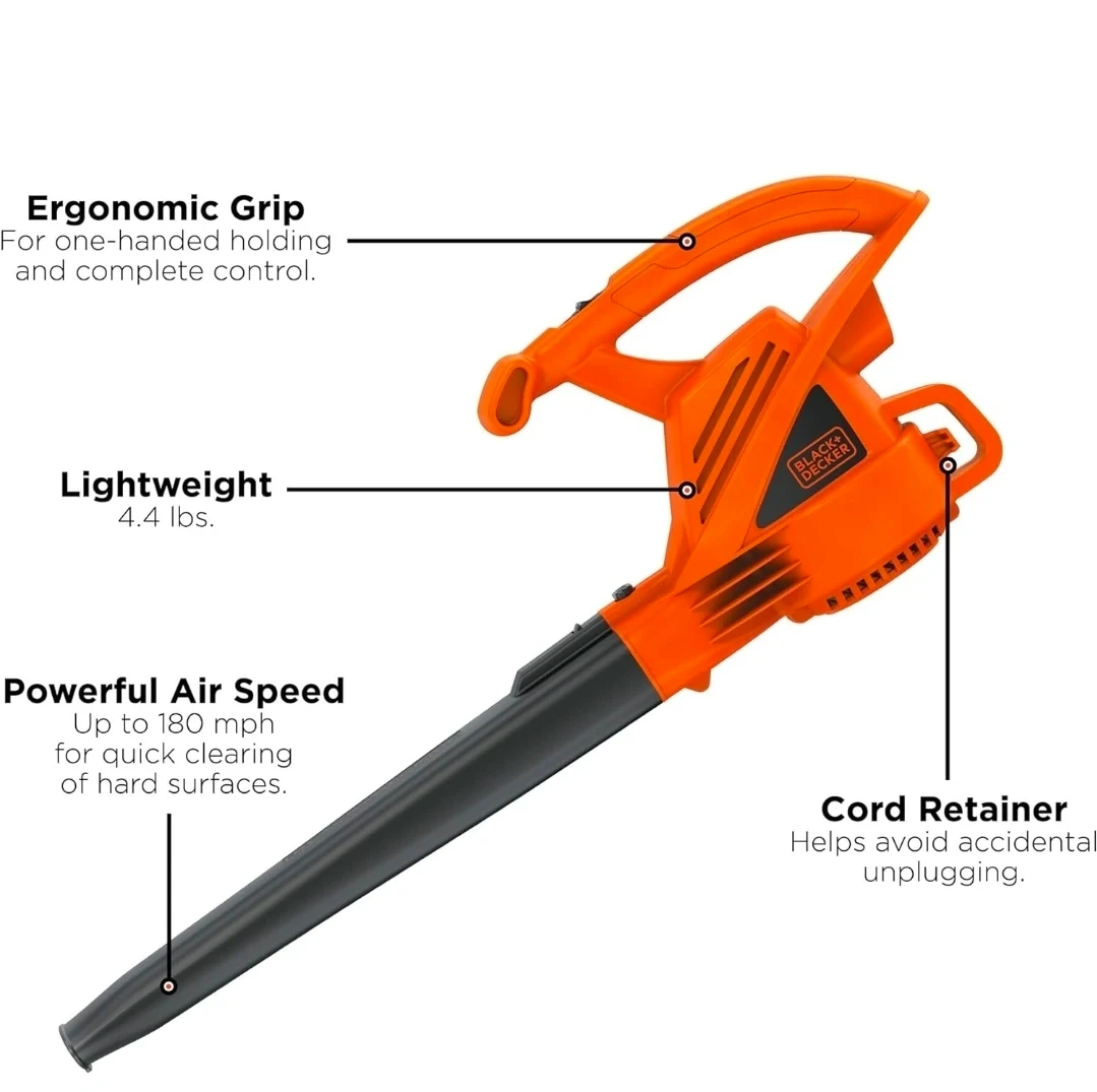 This BLACK+DECKER electric leaf blower features a powerful 7 Amp motor for efficient performance. It's lightweight at 4.4 lbs and has an ergonomic grip for one-handed control. This blower provides up to 180 mph air speed for quick clearing. A cord retainer helps avoid accidental unplugging.