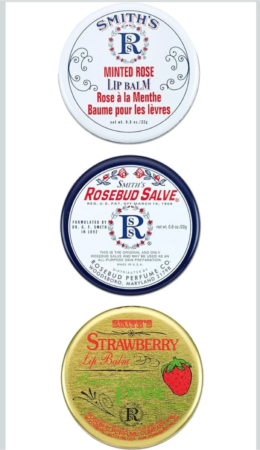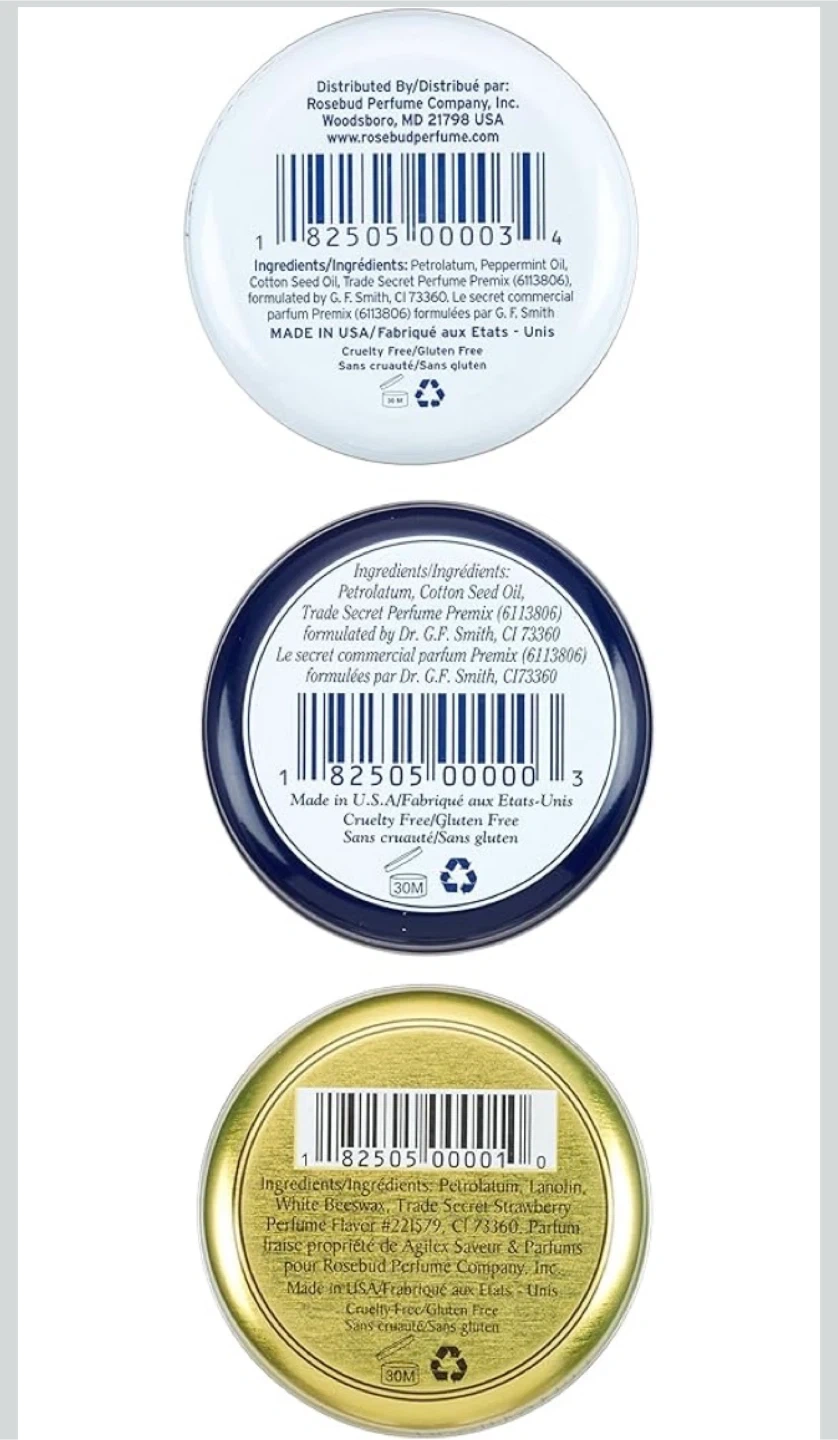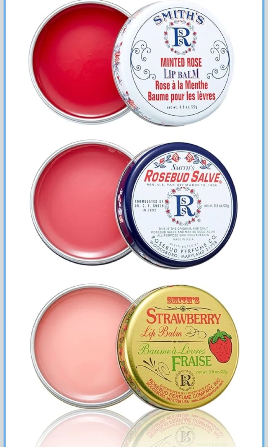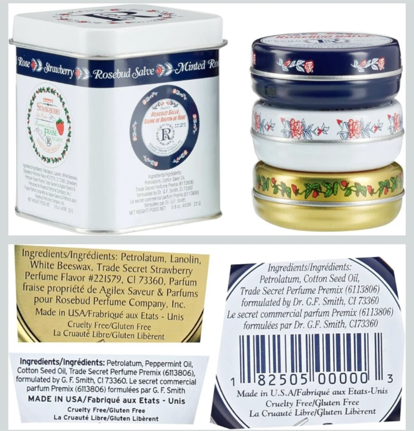 Three tins of Smith's popular balms: Minted Rose Lip Balm, Rosebud Salve, and Strawberry Lip Balm. Each tin contains 0.8 oz (22g). These balms are formulated with petrolatum, cotton seed oil, and trade secret perfume premixes.