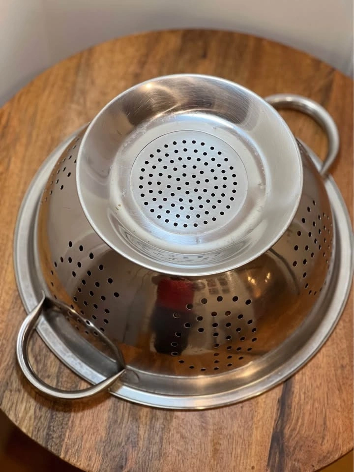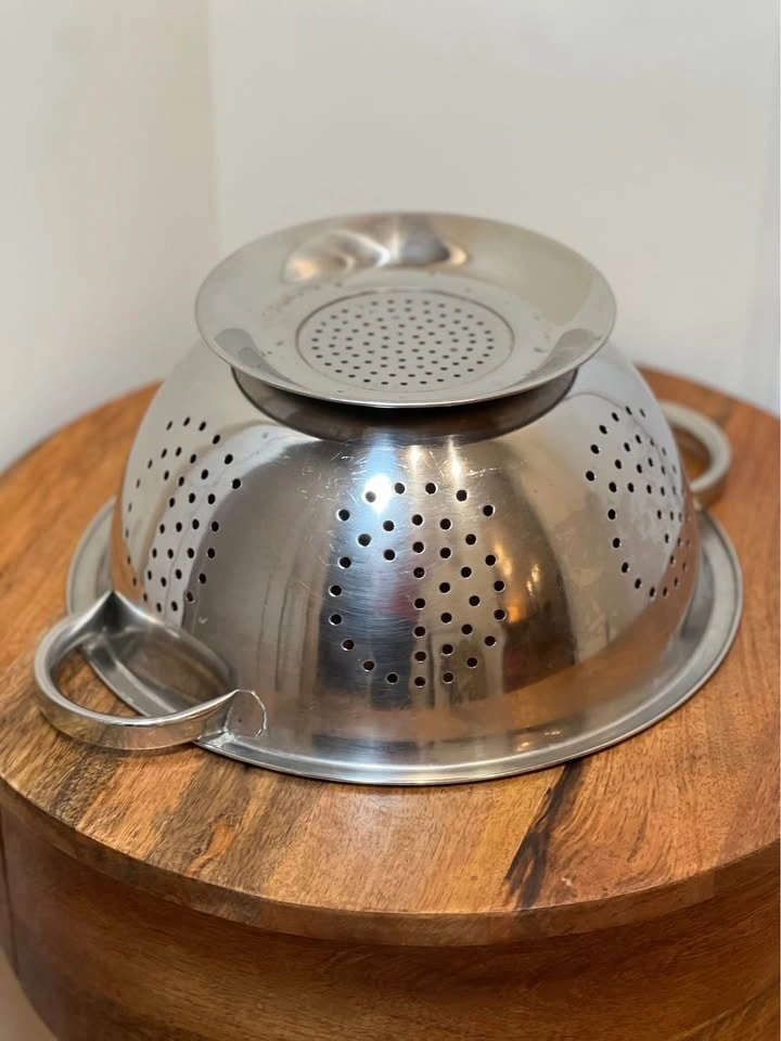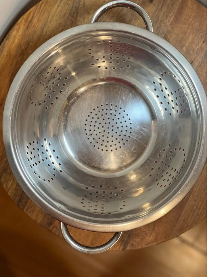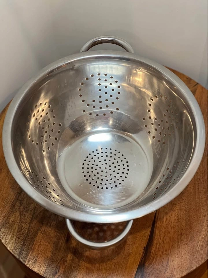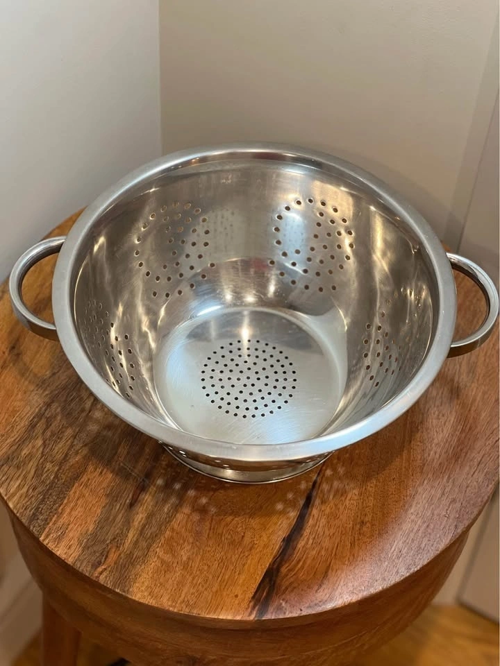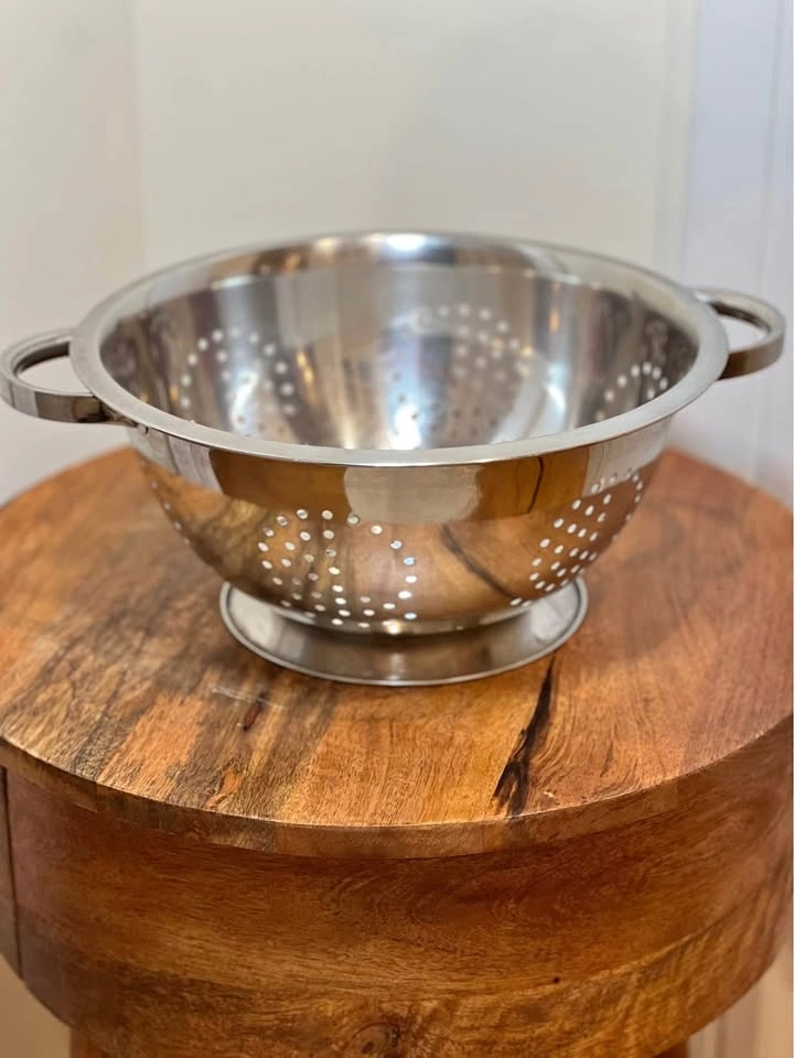This is a classic stainless steel colander, perfect for draining liquids from food. It features a mirror-polished finish, a wide pedestal base for stability, and two sturdy handles for easy gripping. The perforated holes are arranged in a decorative pattern for fast and thorough rinsing. The raised, self-draining pedestal base keeps food from touching the sink floor. Preowned. Pickup is 58th and 7th Ave in midtown Manhattan.
