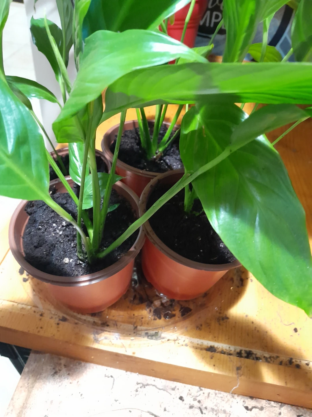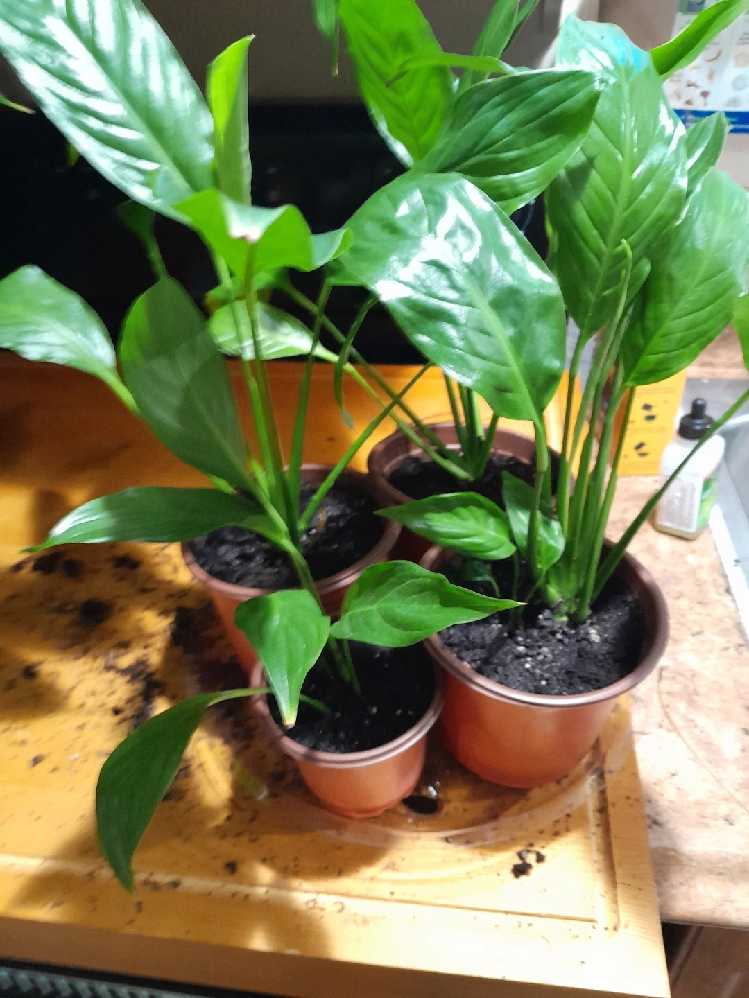 Healthy peace lily plants potted in brown plastic containers. These plants are known for their elegant white flowers and lush green foliage. They're great for adding a touch of nature to any indoor space. Price is for each