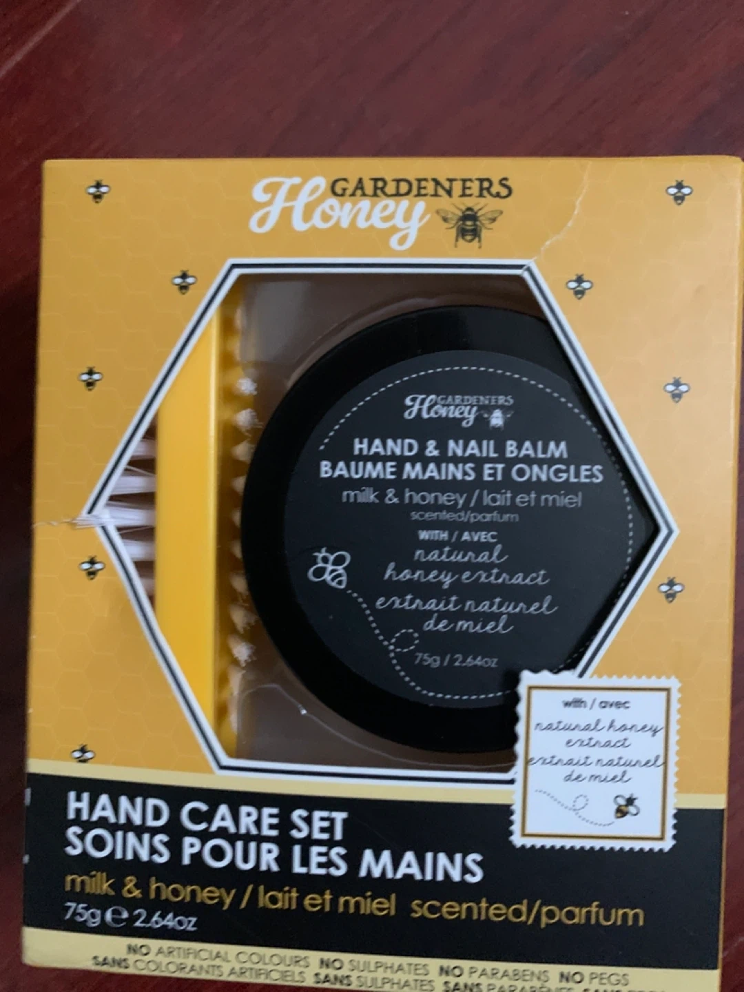 This Gardeners Honey Hand Care Set includes a nail brush and a hand & nail balm. The balm is milk & honey scented and contains natural honey extract. It's a lovely set to keep your hands feeling soft and moisturized