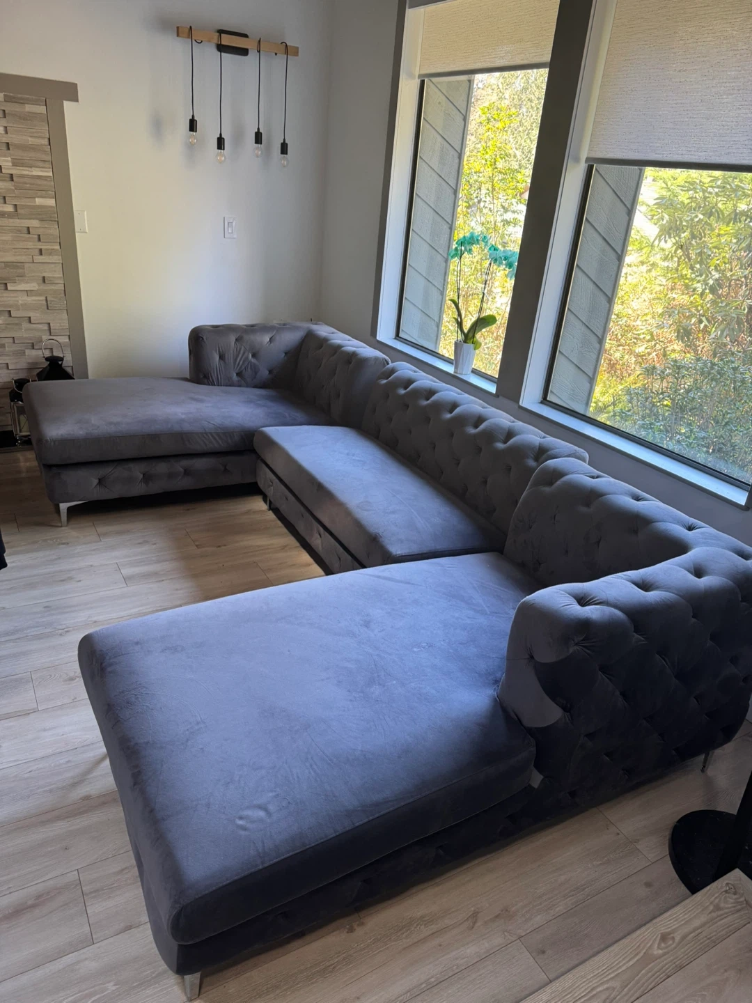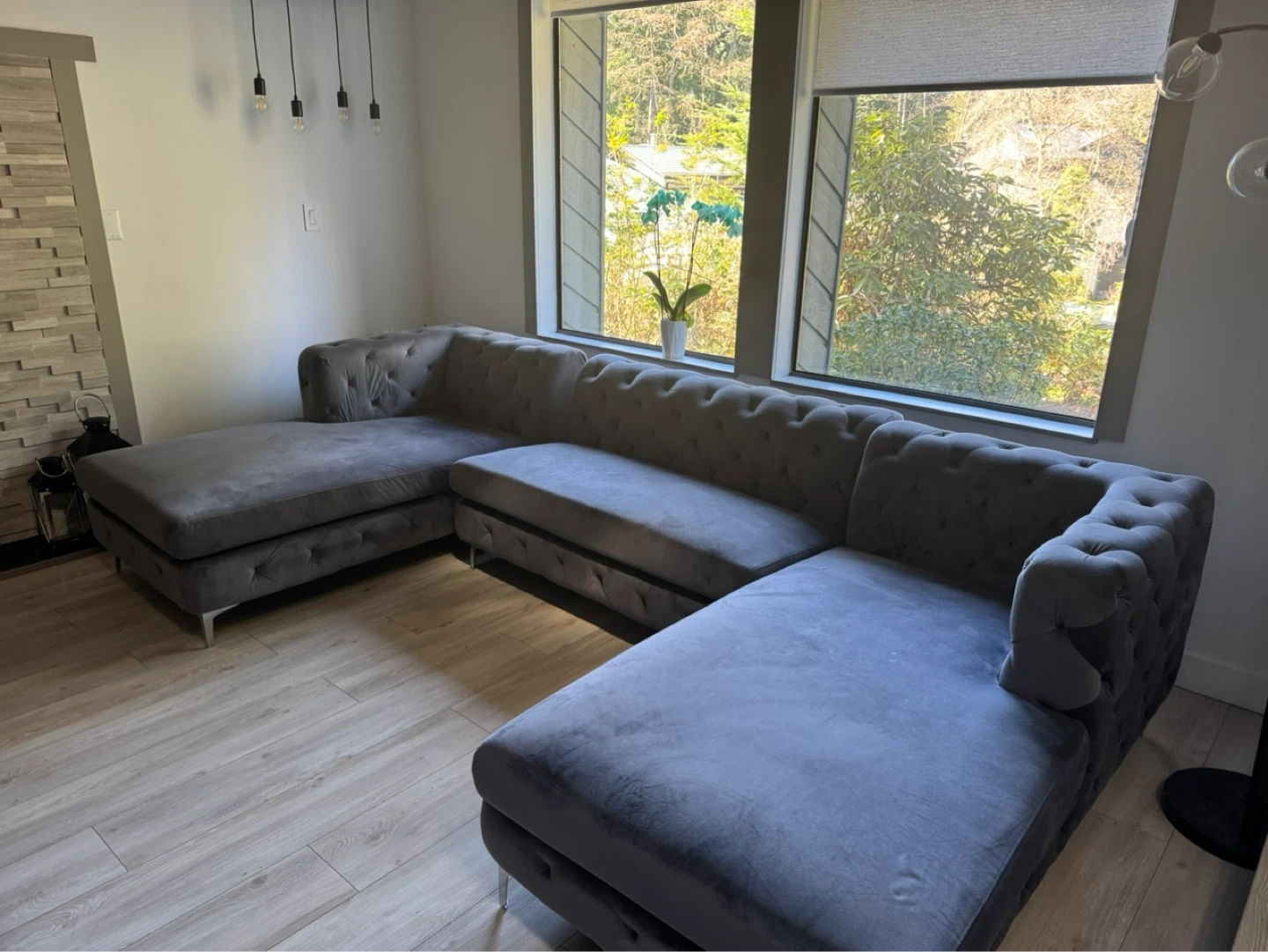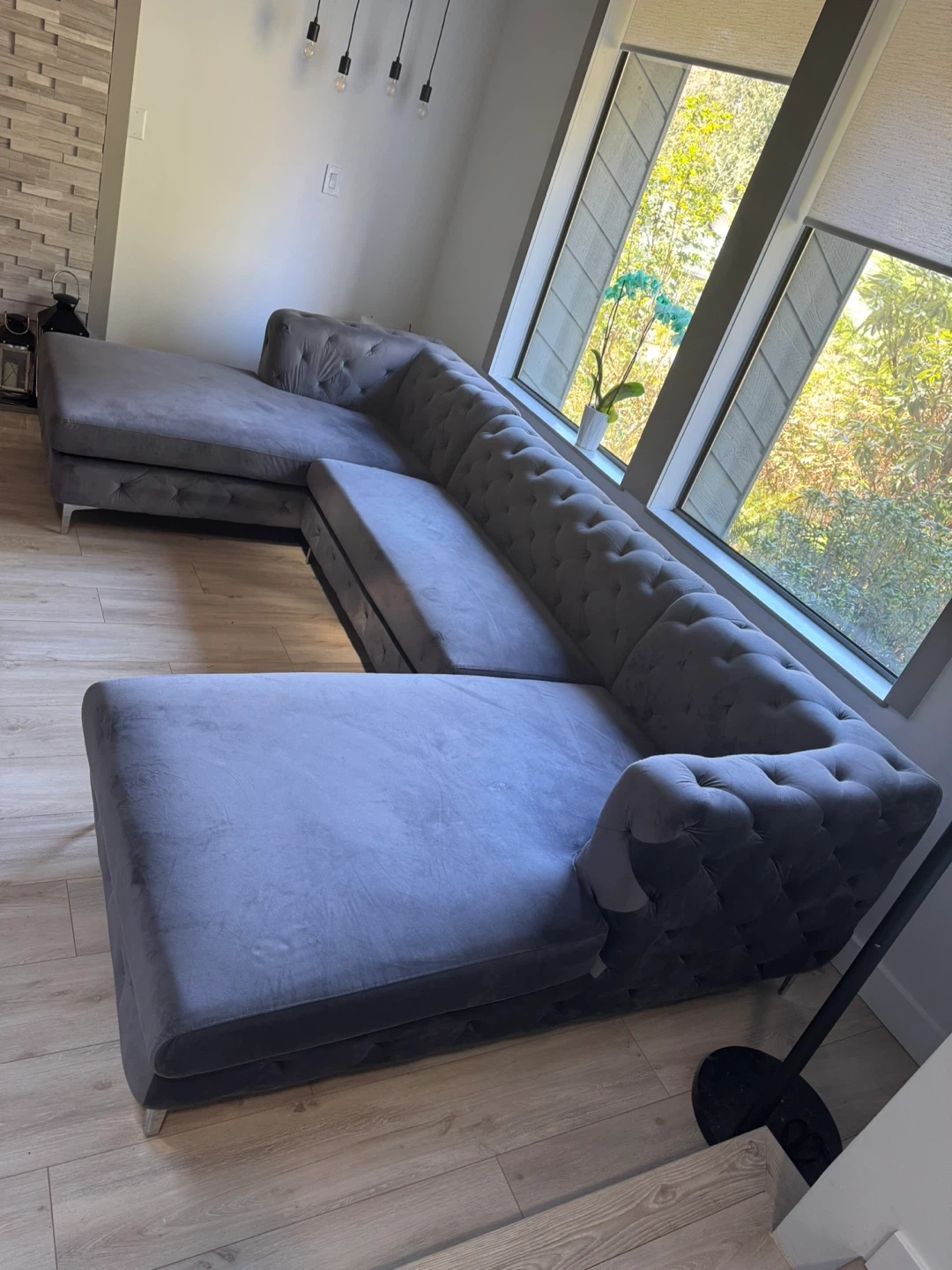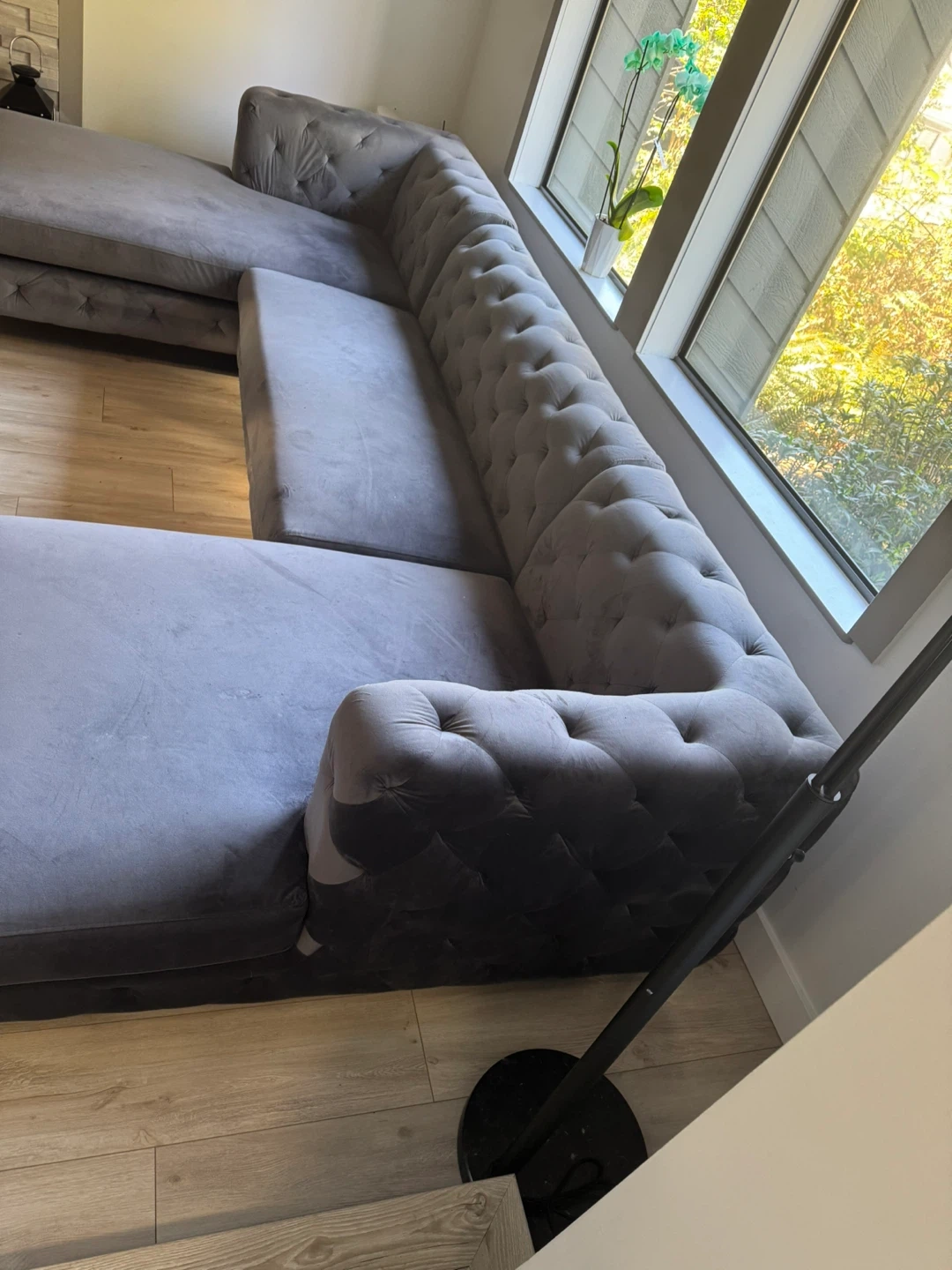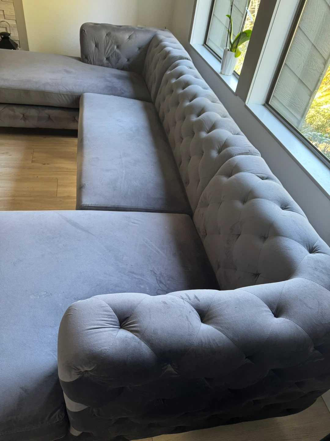 Spacious grey velvet sectional sofa featuring elegant tufted detailing and a modern chaise lounge. It's upholstered in a soft velvet material. This couch provides ample seating for family and guests. Perfect for a large living room or media space! All three pieces of the sofa are connected by a clip, and they can also be used separately in different places.