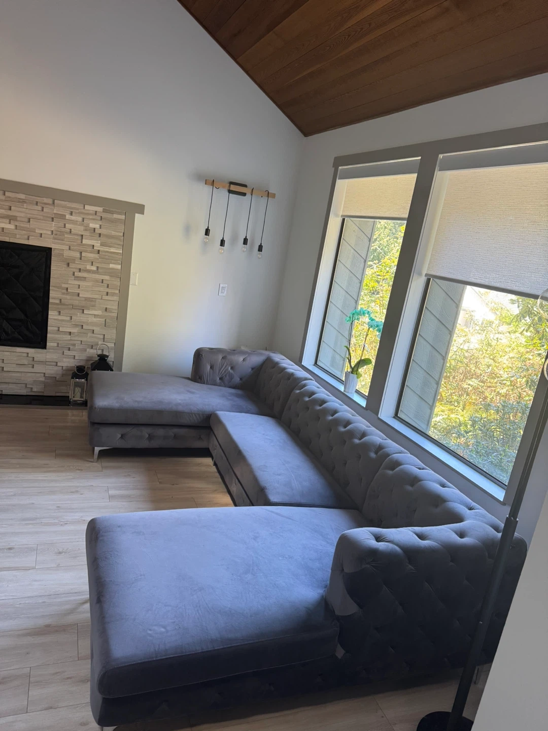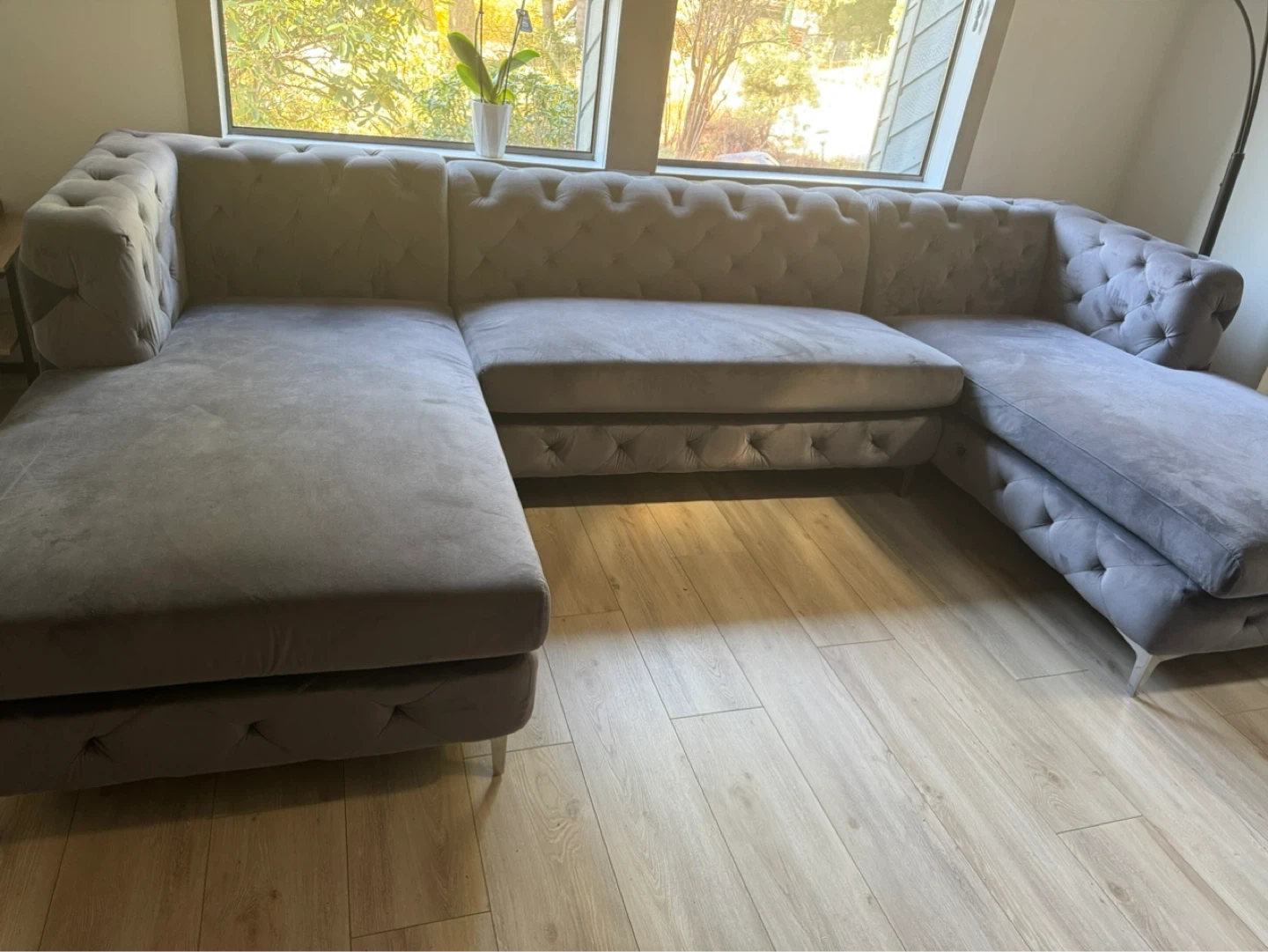 Grey Velvet Sectional Sofa with Tufted Detailing