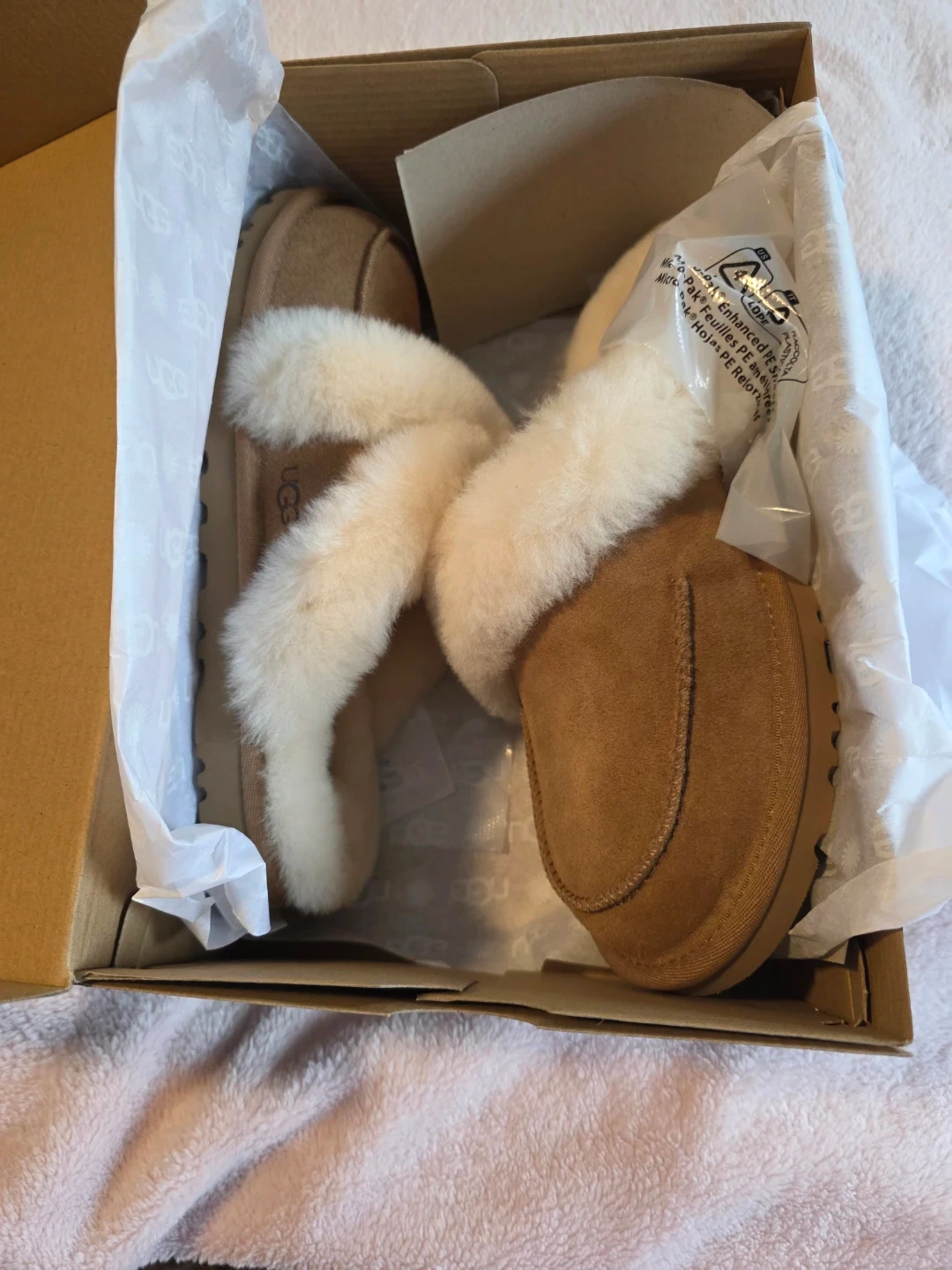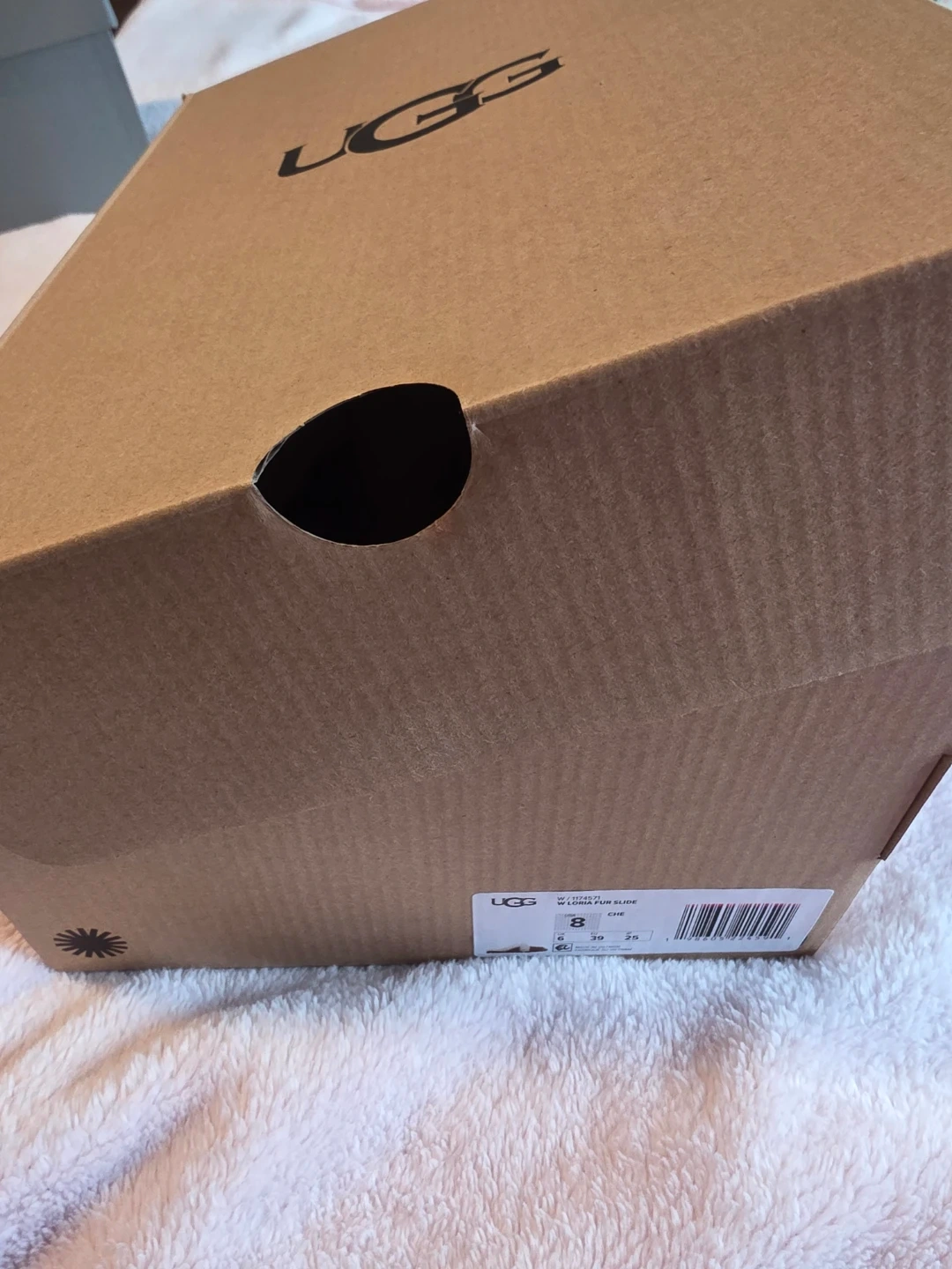 Brand new UGG slippers in the original box. These are the W Lida Slipper model, size 8. They're a cozy suede with a fluffy white trim.