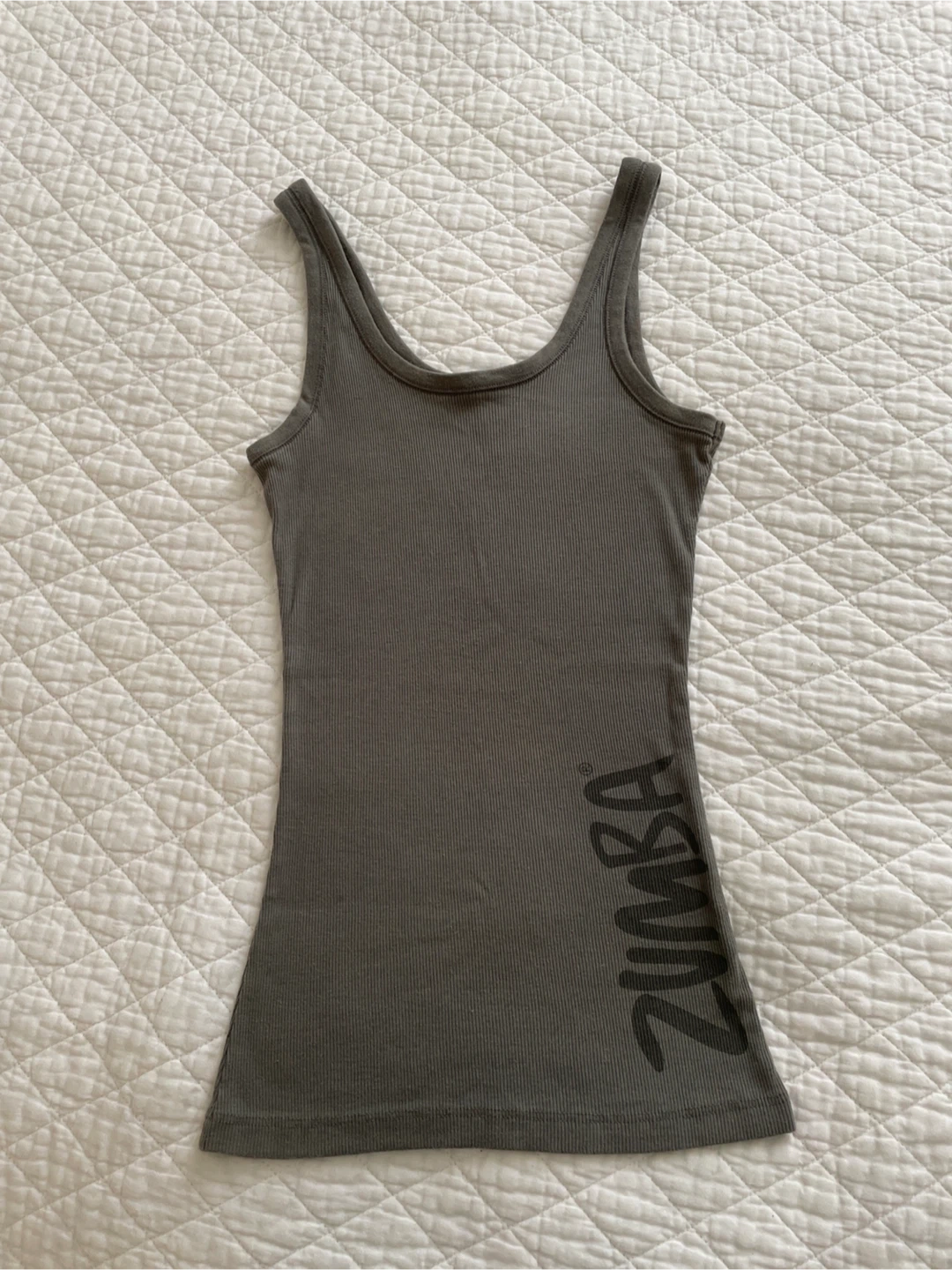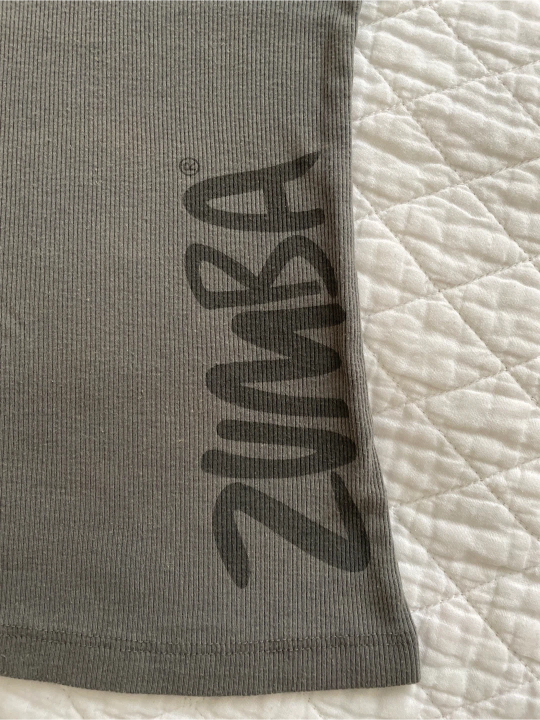 This is a Zumba tank top in a ribbed grey fabric. It features the Zumba logo on the side and a smaller logo on the chest. Made for active wear, it offers a comfortable and breathable fit for workouts. Size is Medium but fits size Small. Worn a few times only