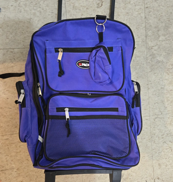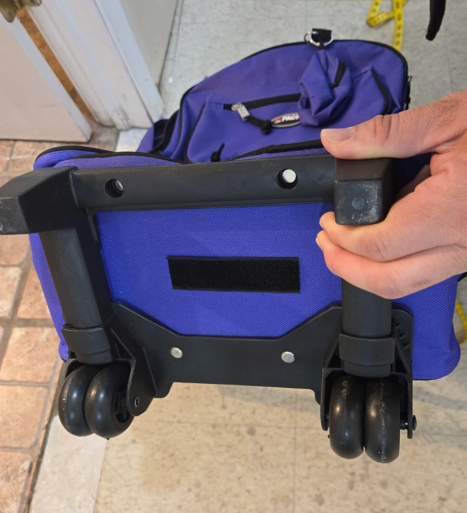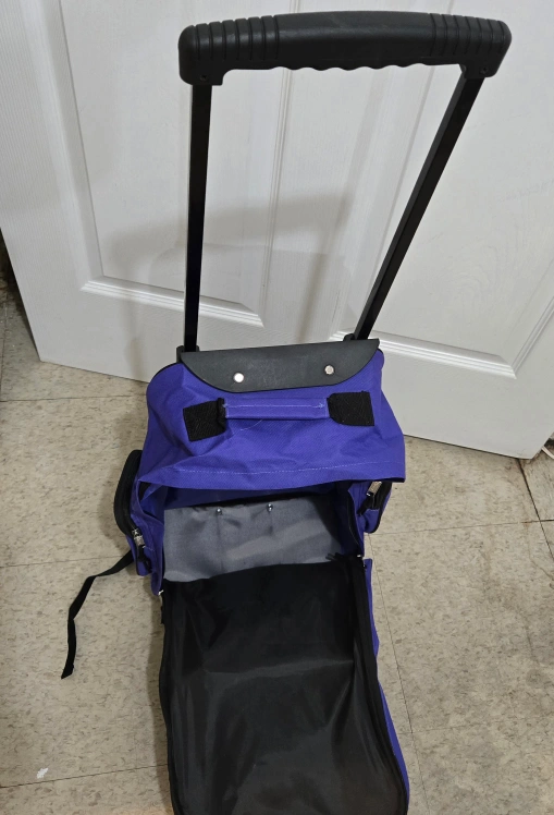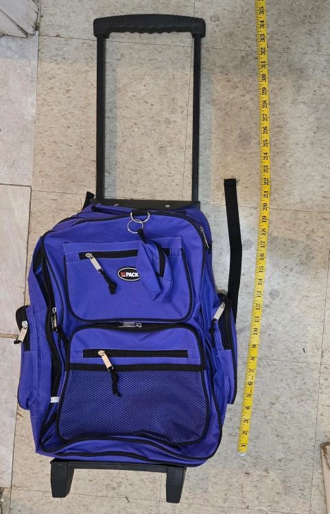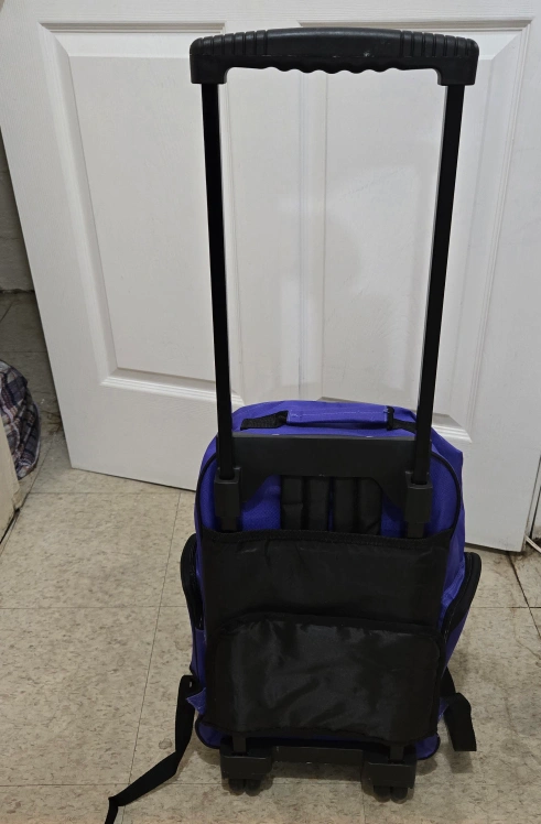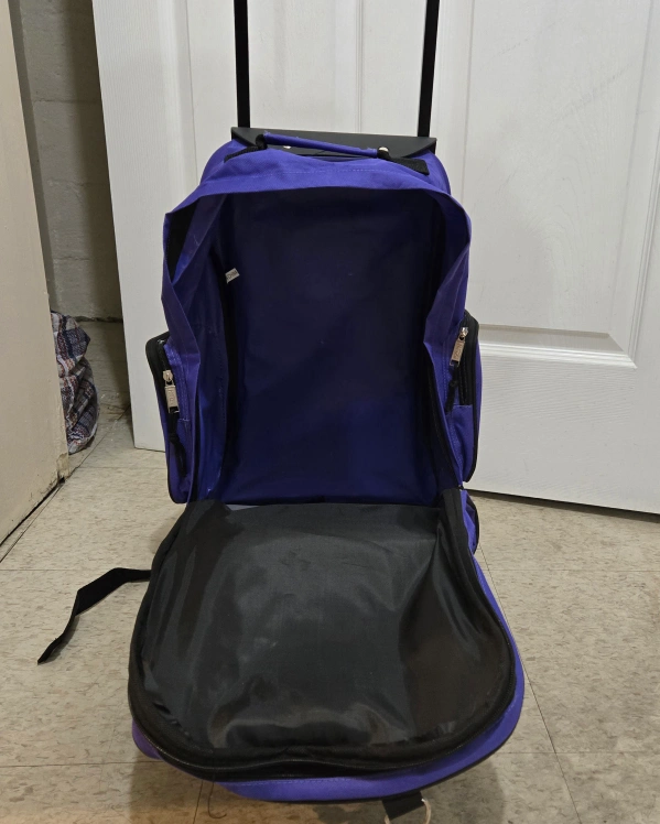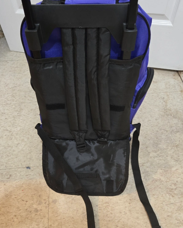 condition. Black and purple color scheme. Features multiple pockets and compartments. Has a retractable handle and inline black skate wheels. Approximately 35" by 15"