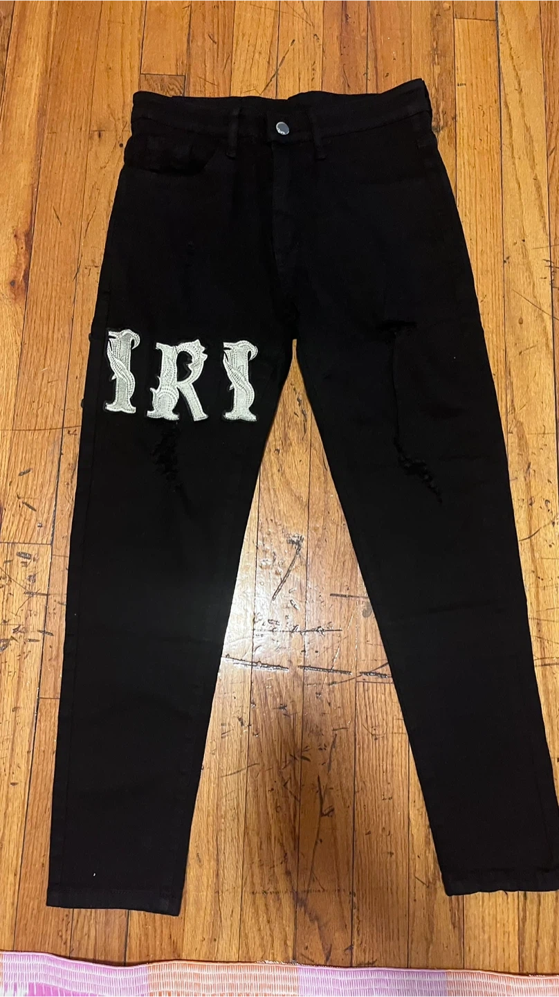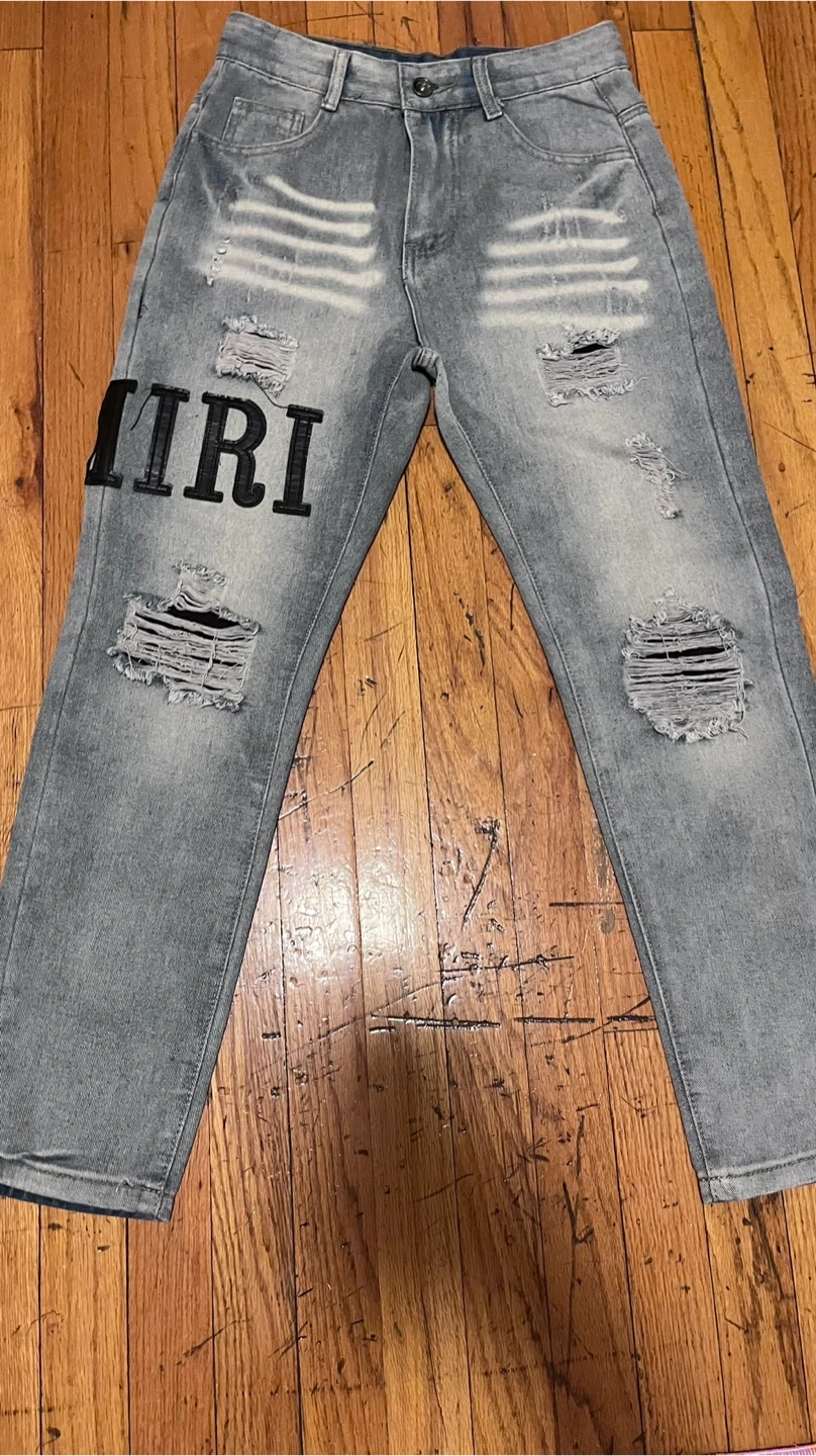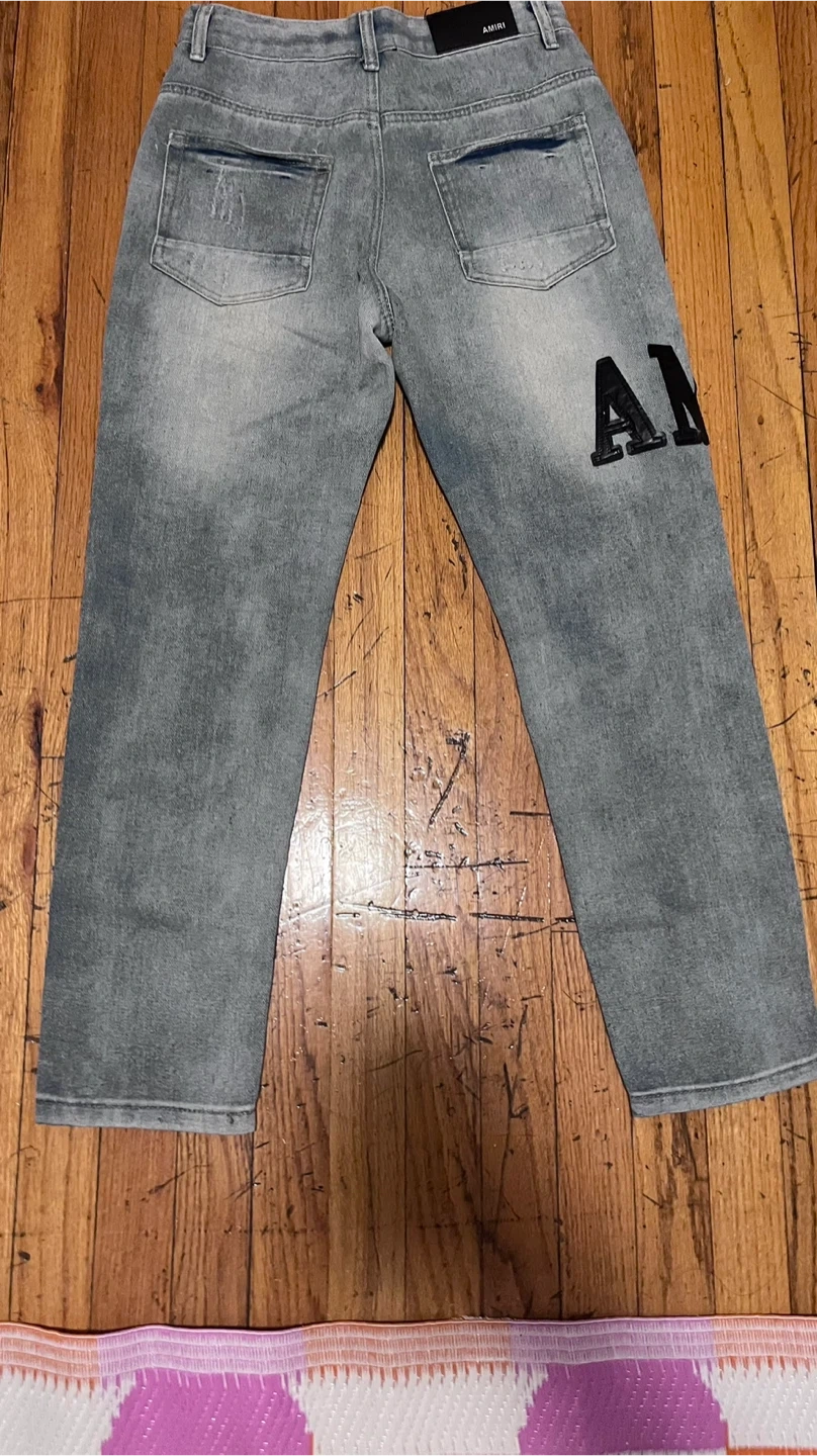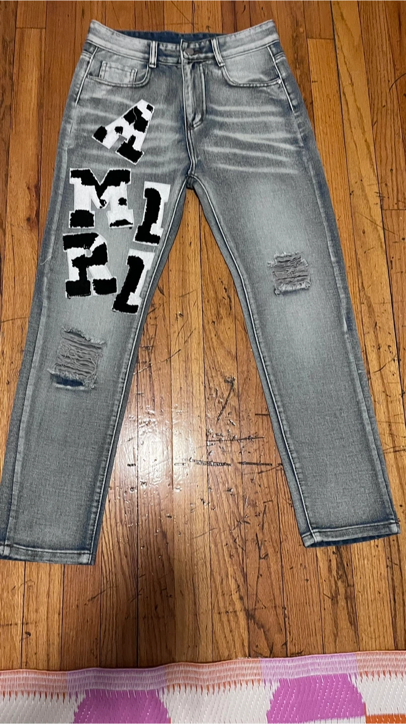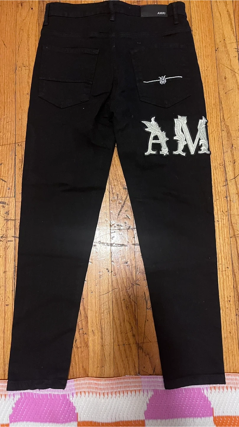 These Amiri jeans come in both a light wash distressed denim and a solid black color. Both feature unique Amiri logo patches and distressed detailing. They're made from denim material. 3 for