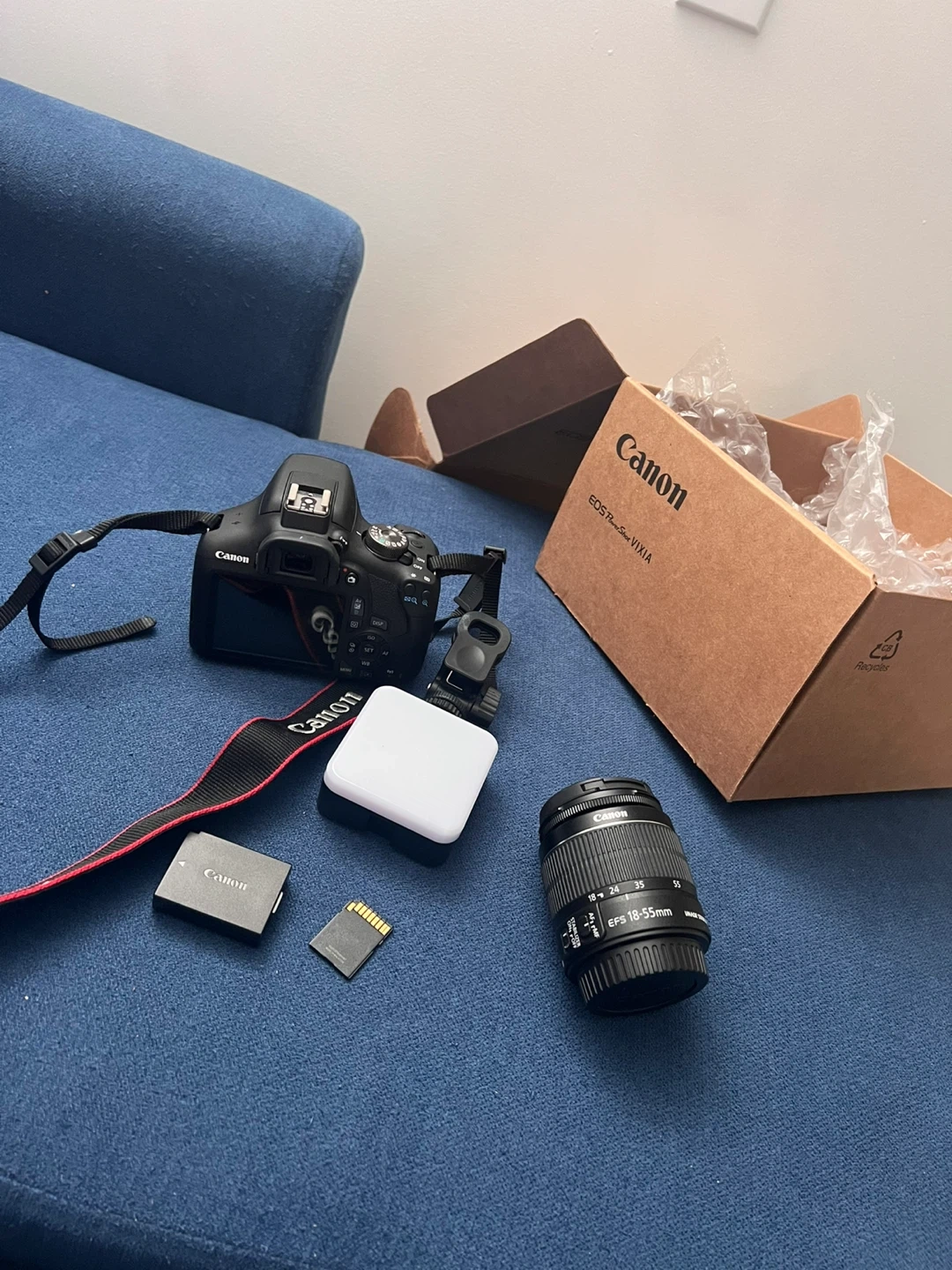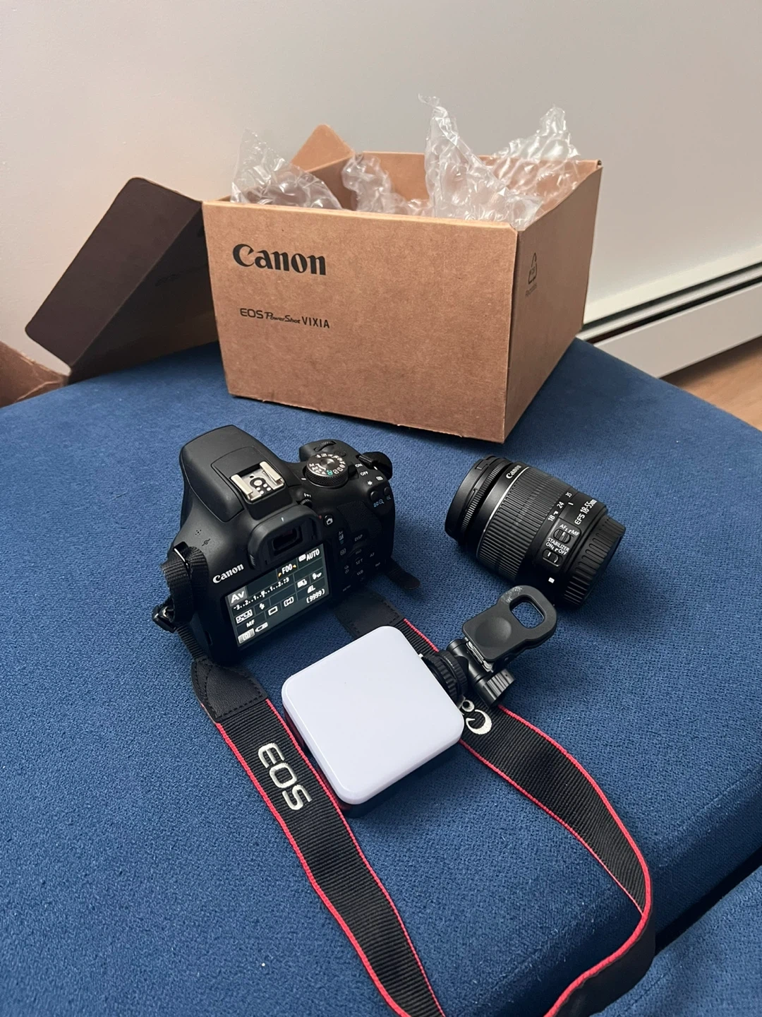 "I sell Canon EOS Rebel T7 of 24.1MP in excellent condition. Includes 18-55mm lens, battery and strap. Charger does not include. Ideal for beginners. I deliver with box. $400
