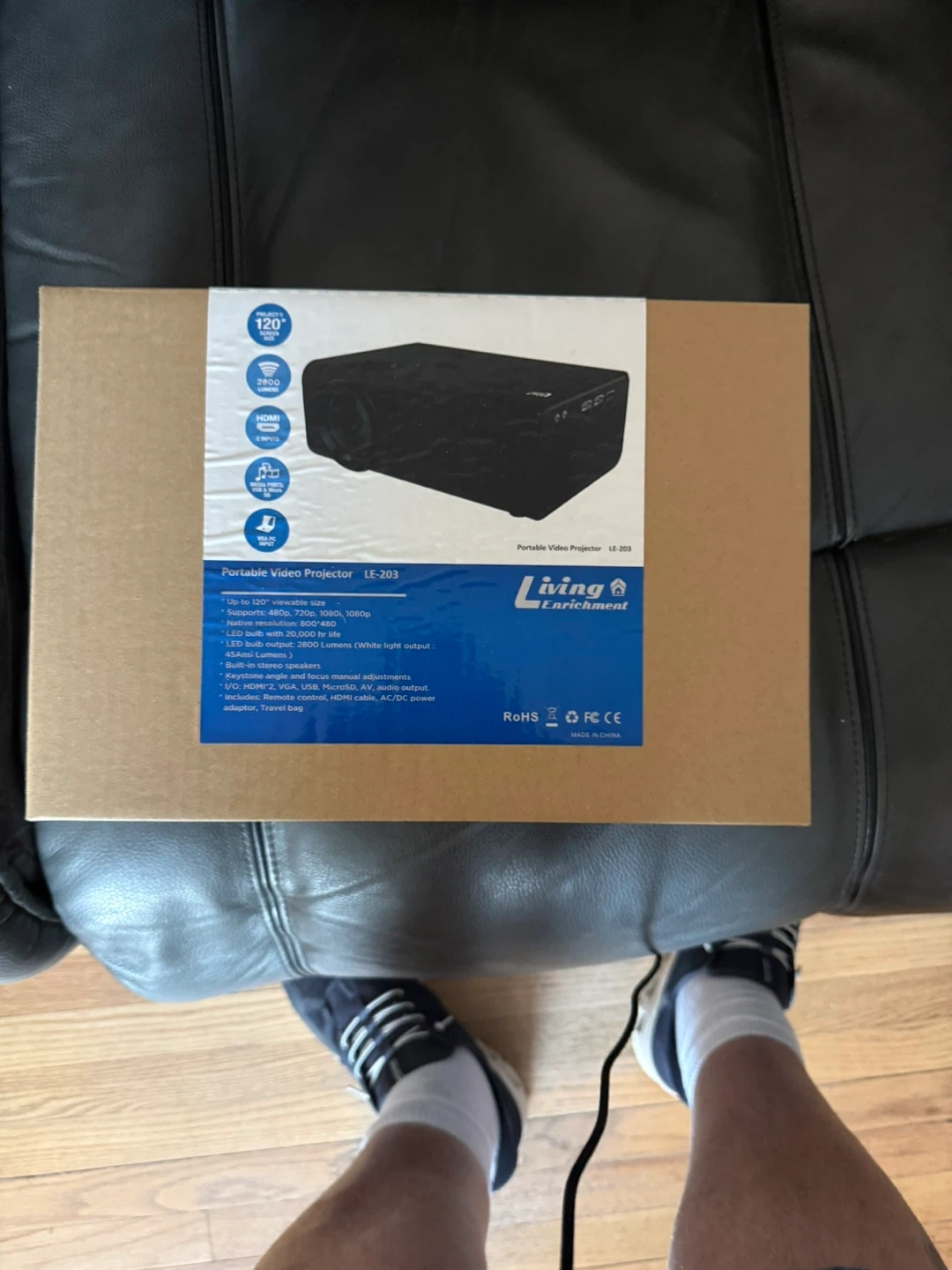 Portable video projector with a native resolution of 800*480. It supports up to 1080p and has a brightness of 2800 Lumens. Includes built-in stereo speakers, keystone angle, and focus adjustments. Comes with a remote control, HDMI cable, AC/DC power adapter, and a travel bag.