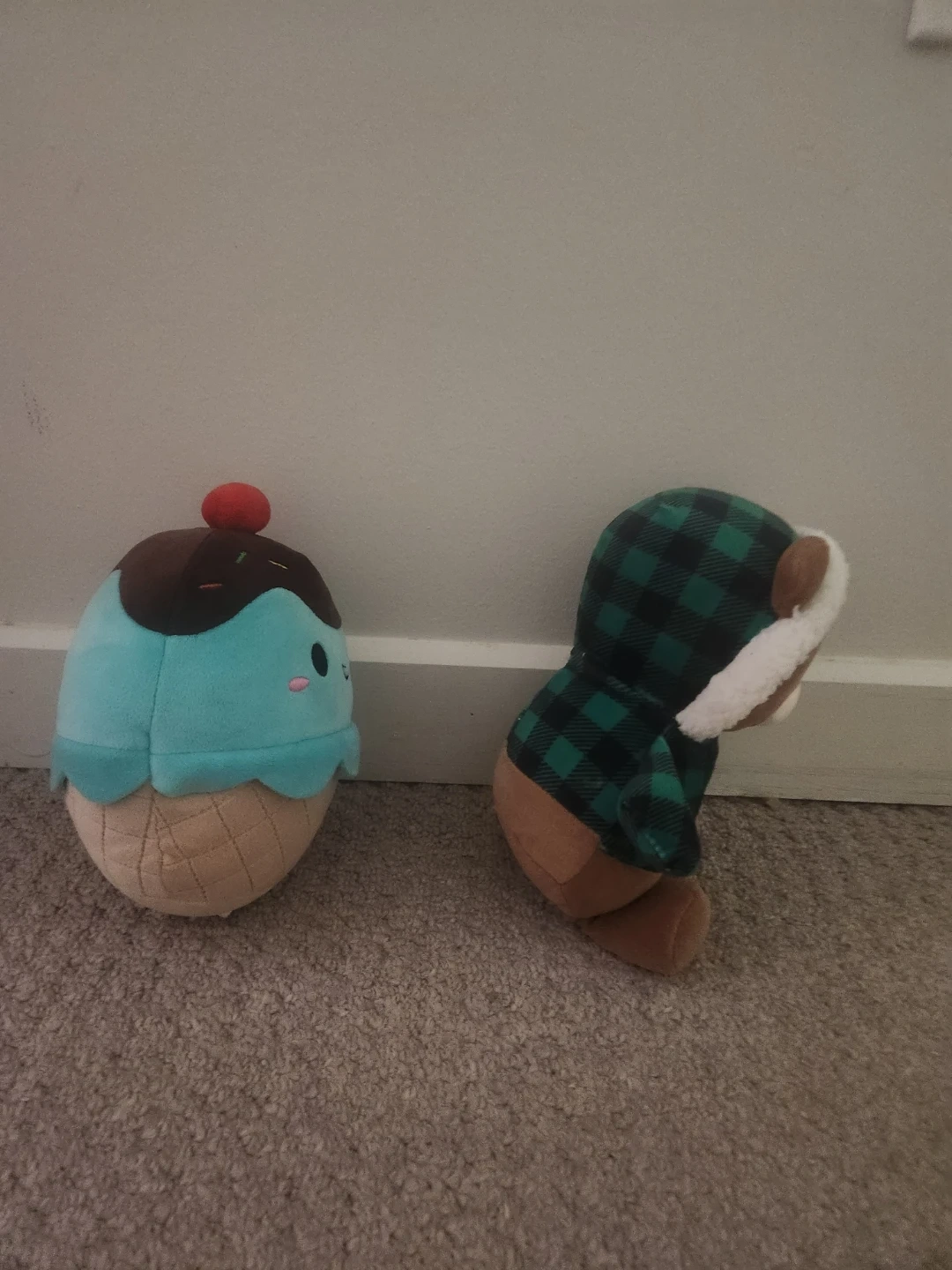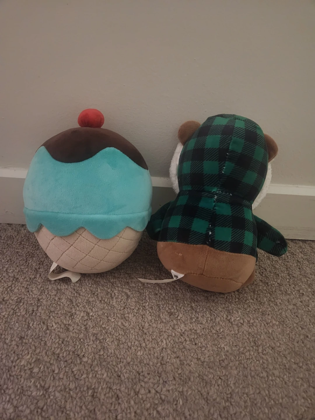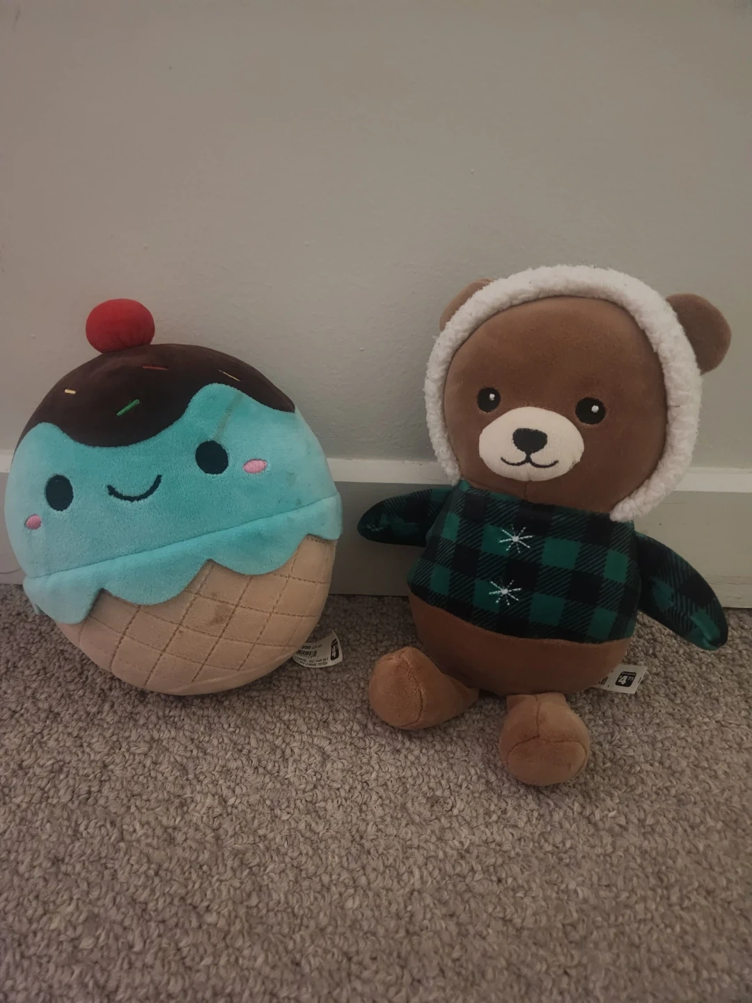 This set includes a cute ice cream cone plushie with a chocolate top and a light blue ice cream scoop. Also included is a cuddly brown bear wearing a green and black plaid hoodie with a white fuzzy trim. Both plush toys are soft and huggable!