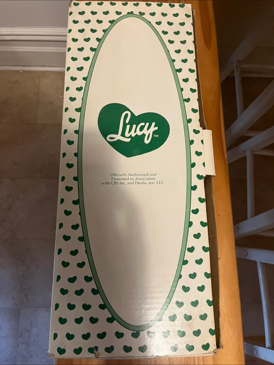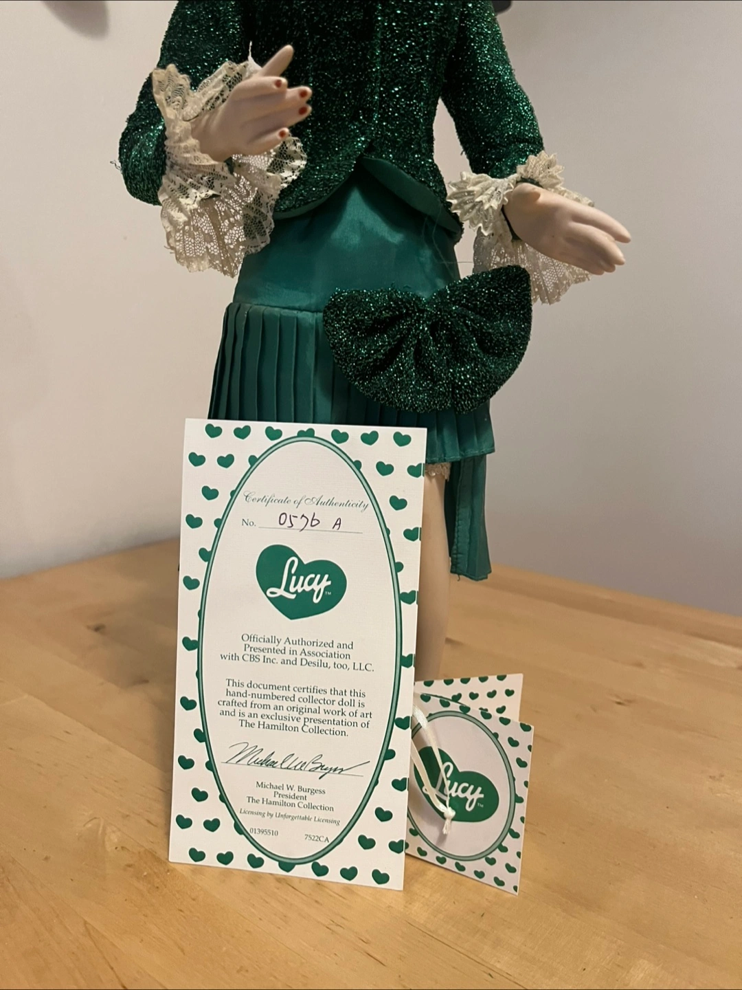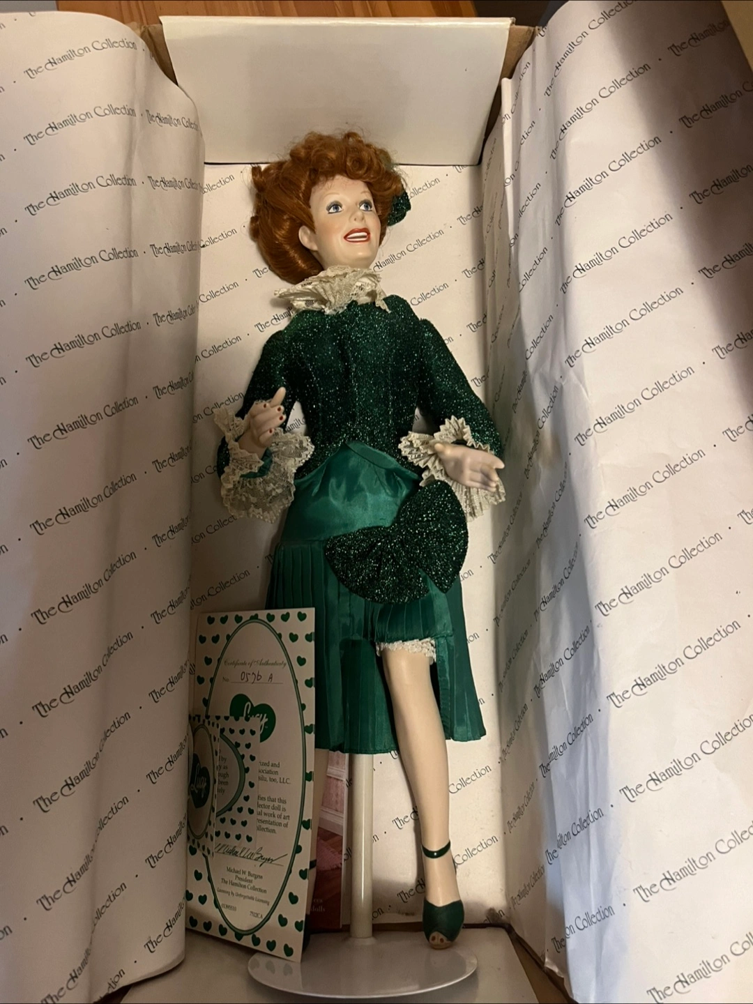 Collectible porcelain I Love Lucy doll in a green outfit. Comes with stand and original box and certificate of authenticity.
