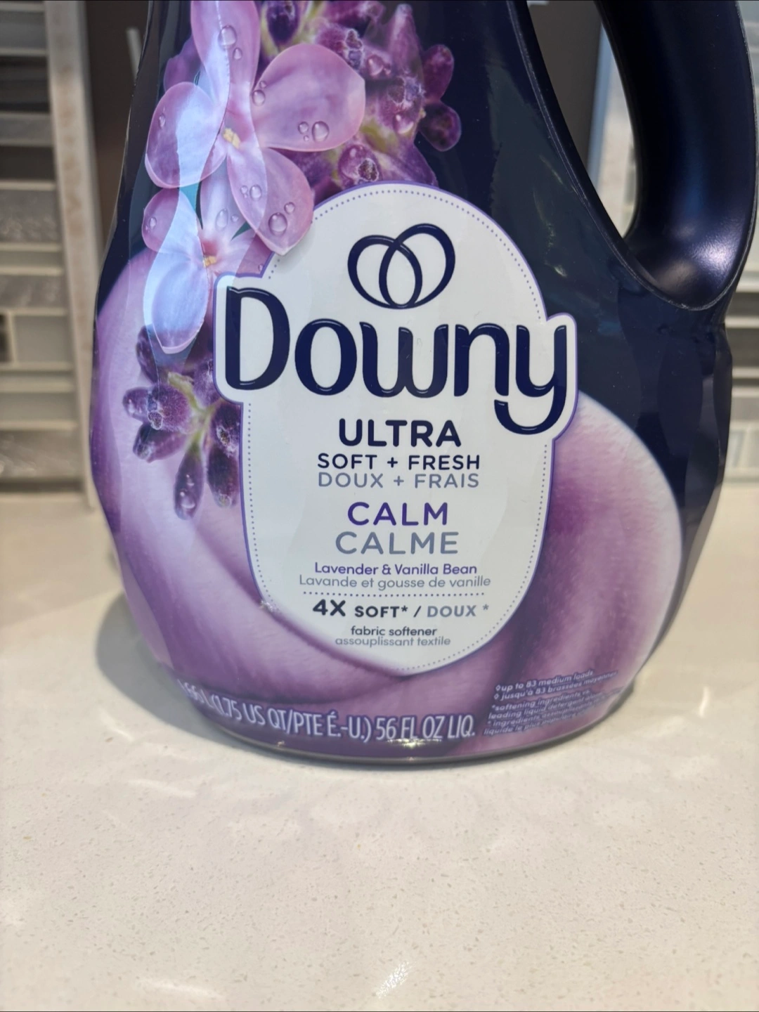 This is Downy Ultra Soft + Fresh Calm fabric softener in a Lavender & Vanilla Bean scent. It's a 56 fl oz liquid. It provides 4X softer clothes and fights static.